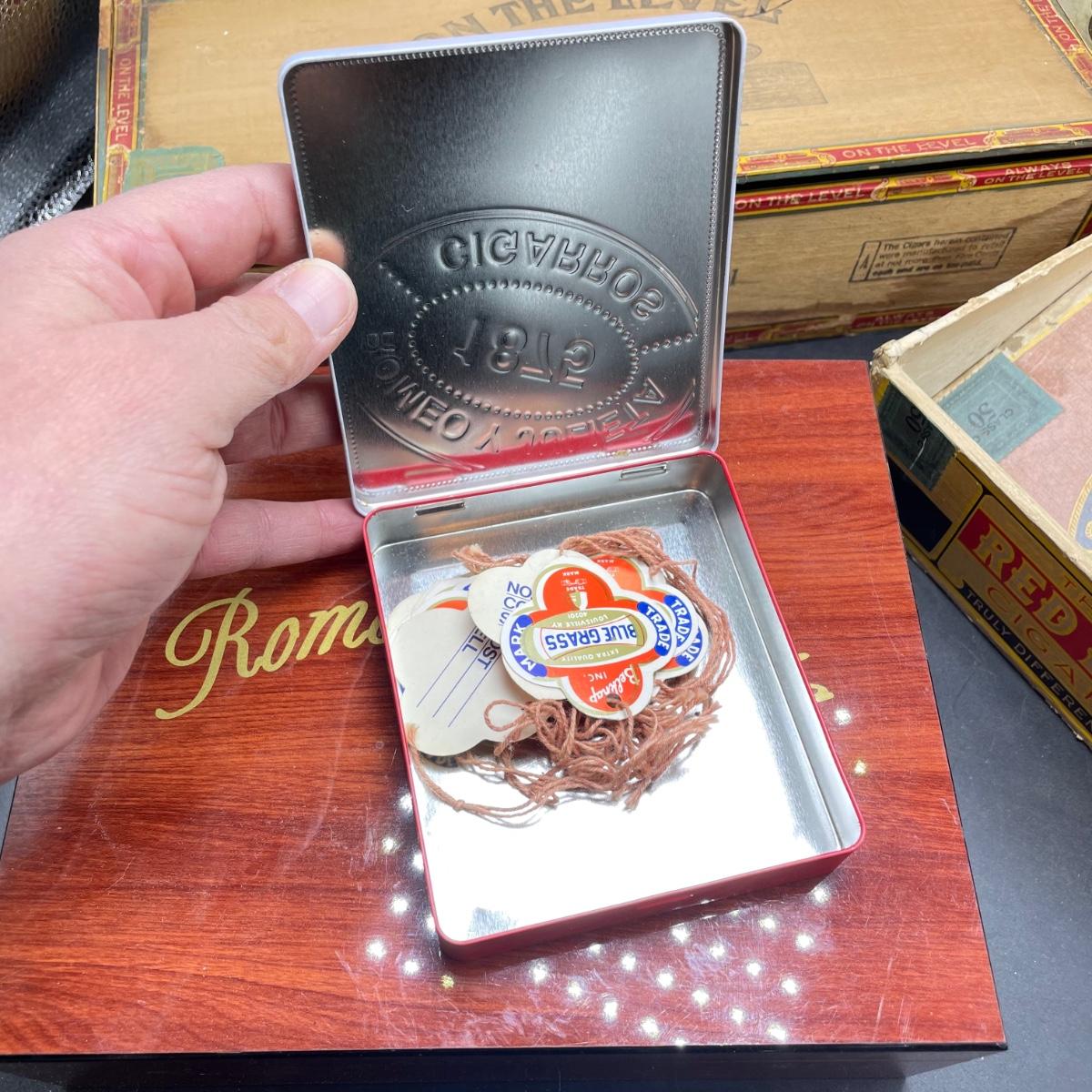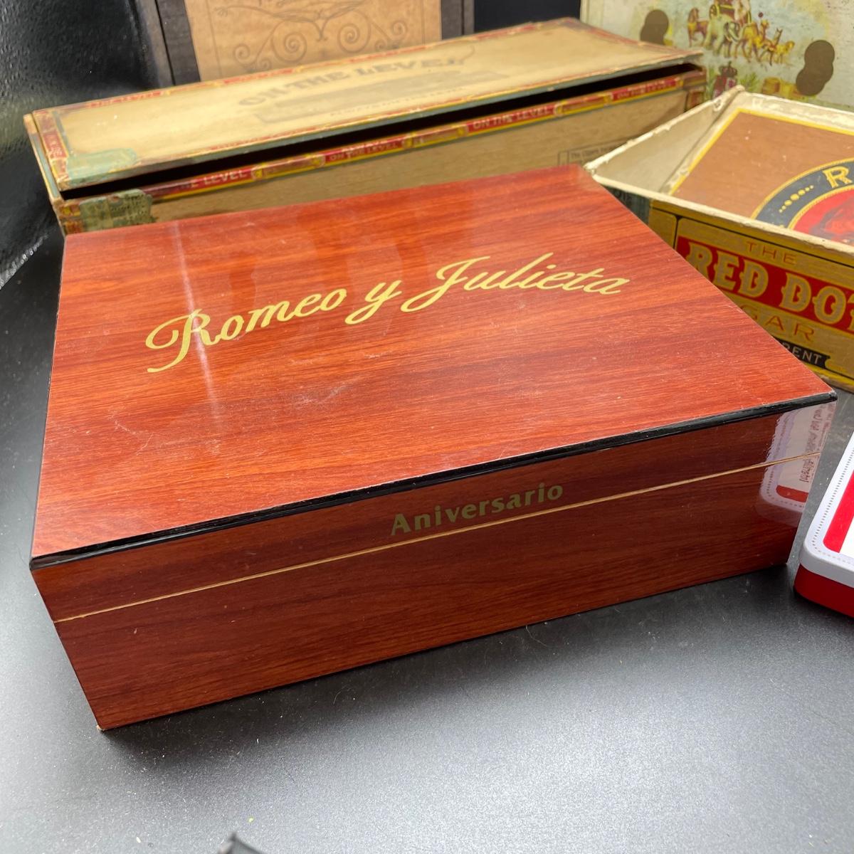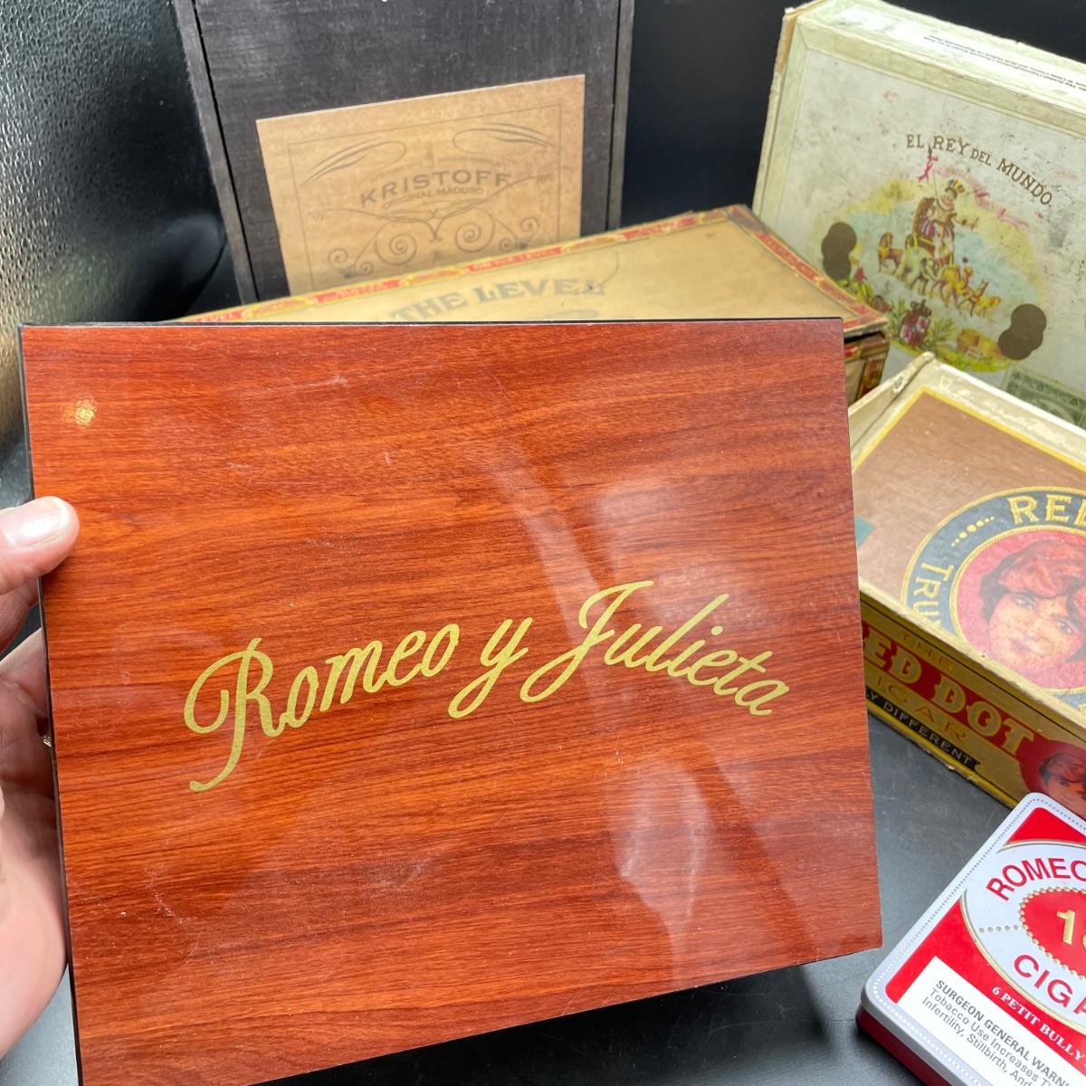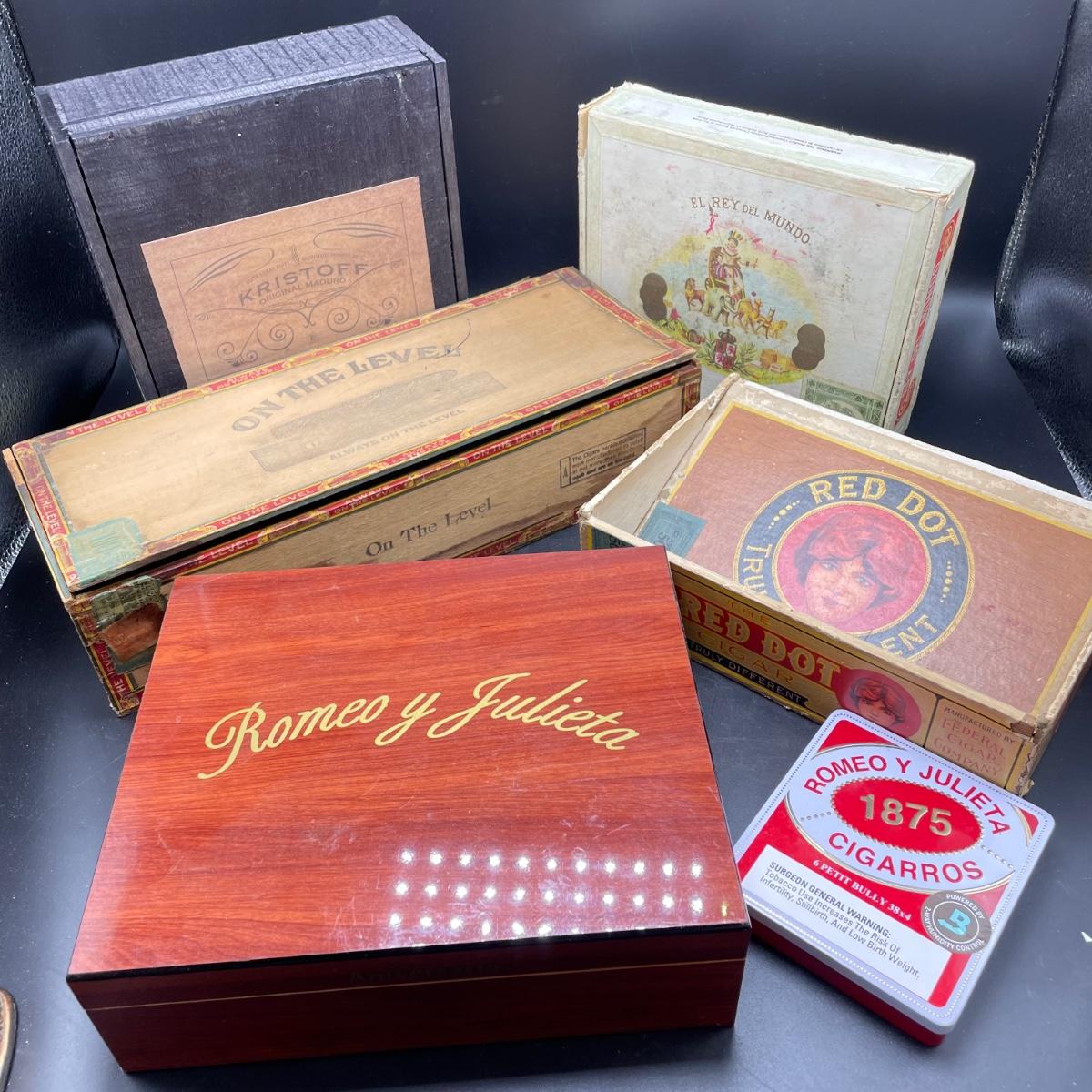 Five cigar boxes, vintage and newer plus a matching Romeo Y Julieta pocket tin. The On The Level box measures 13.5” x 5.25” x 3”. The Red Dot box is in fine shape, but the lid is no longer on its paper hinge. See images. Shipping available.