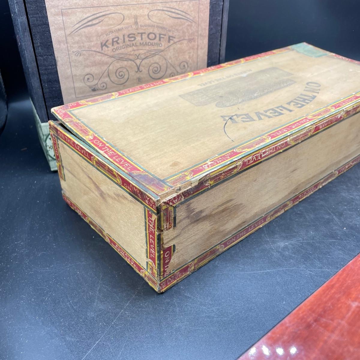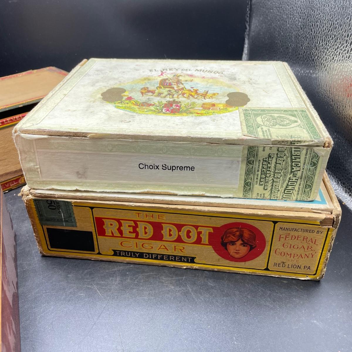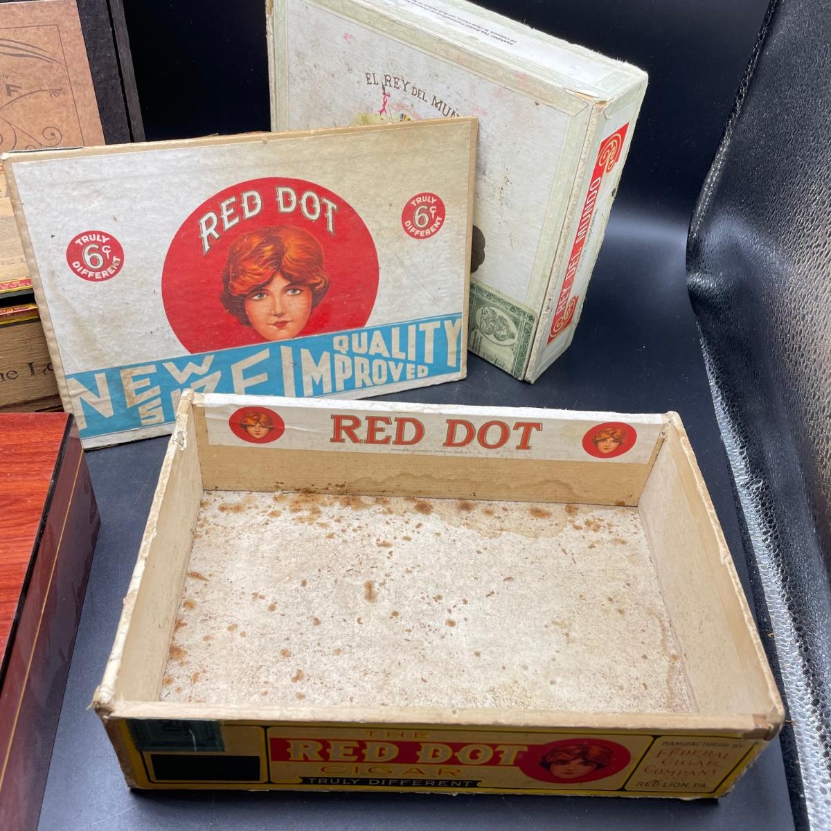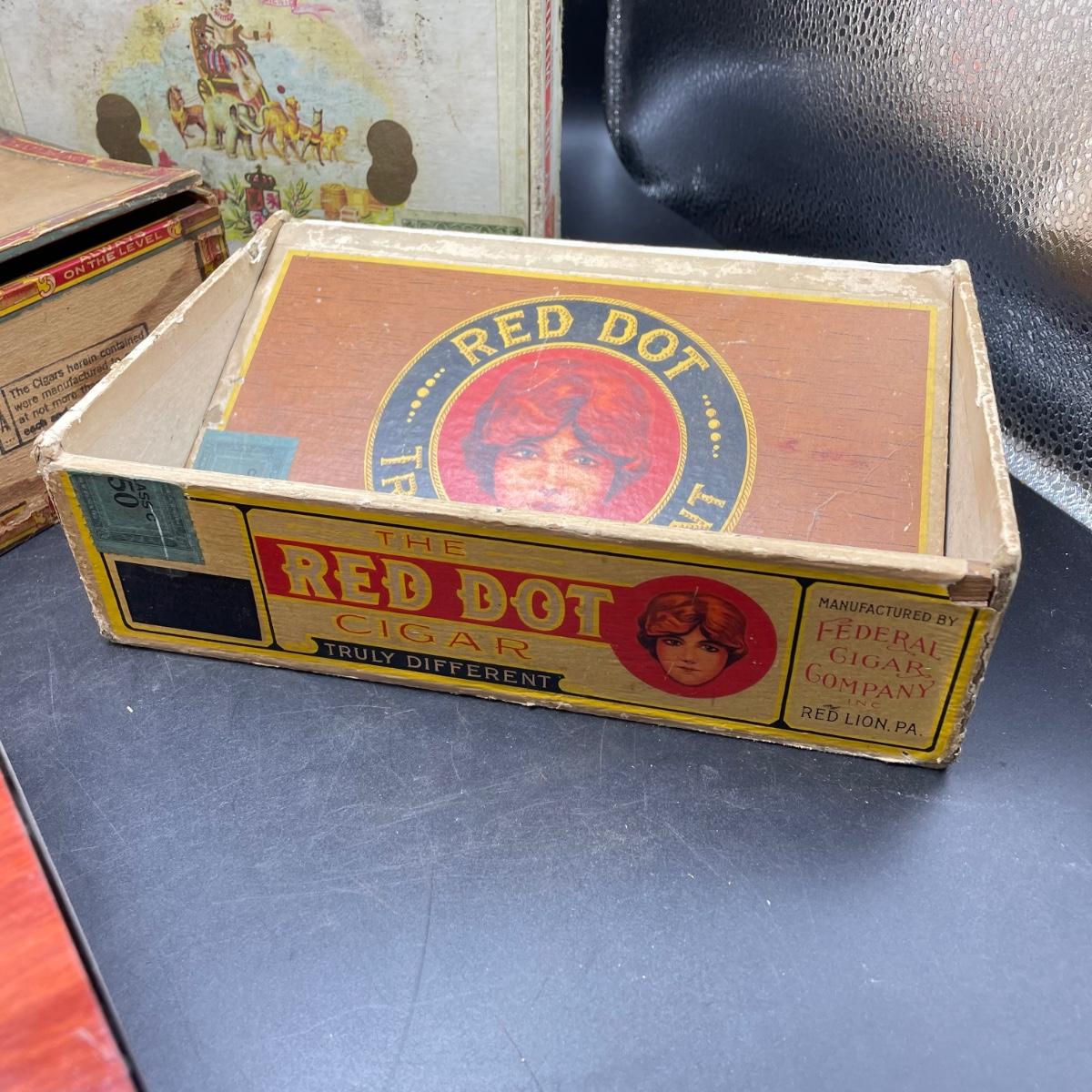 Five cigar boxes, vintage and newer plus a matching Romeo Y Julieta pocket tin. The On The Level box measures 13.5” x 5.25” x 3”. The Red Dot box is in fine shape, but the lid is no longer on its paper hinge. See images. Shipping available.