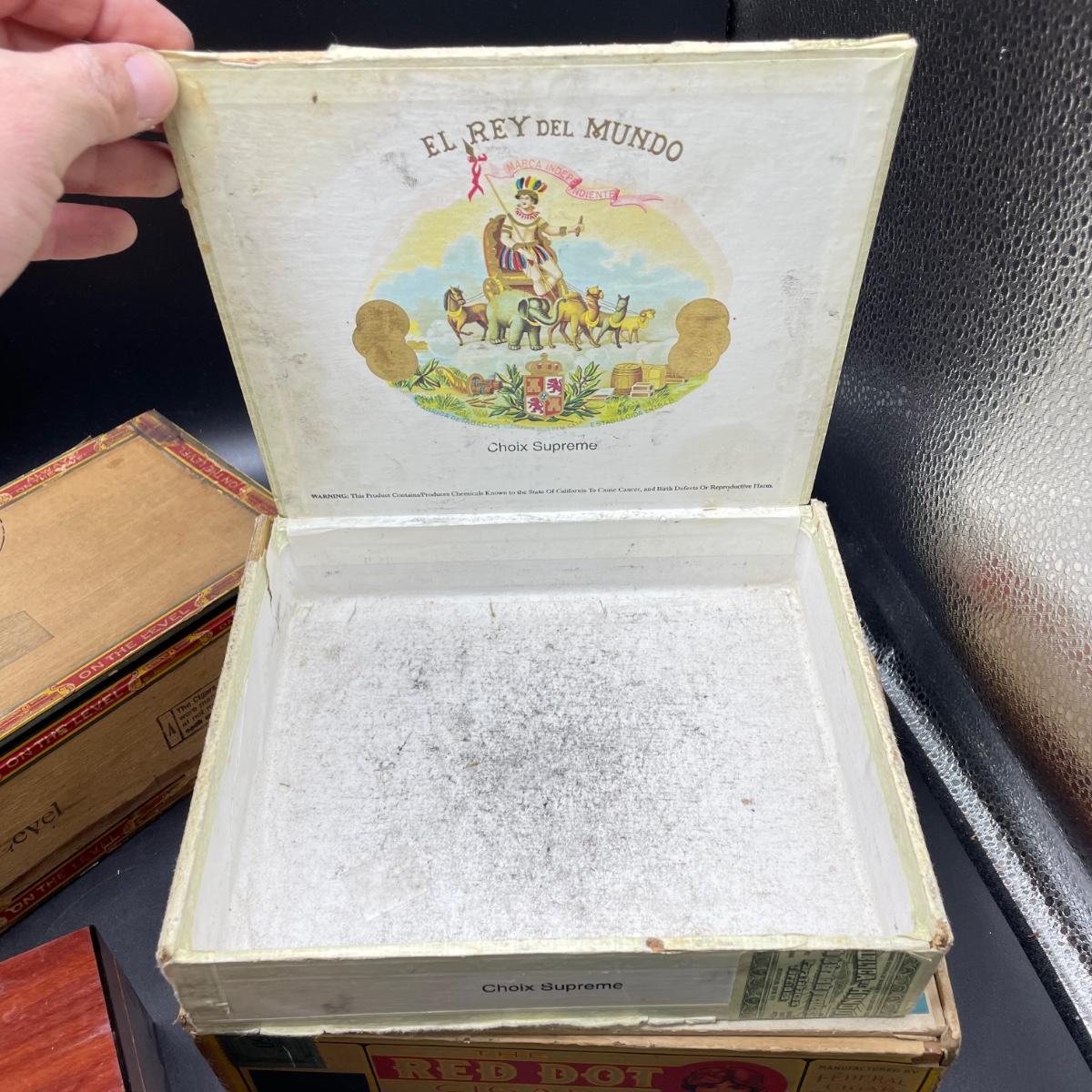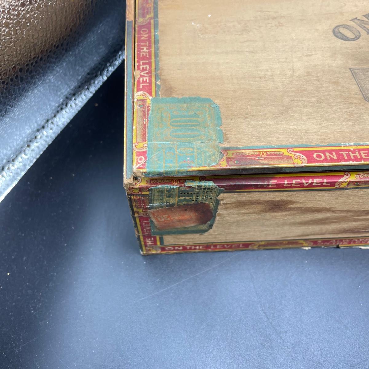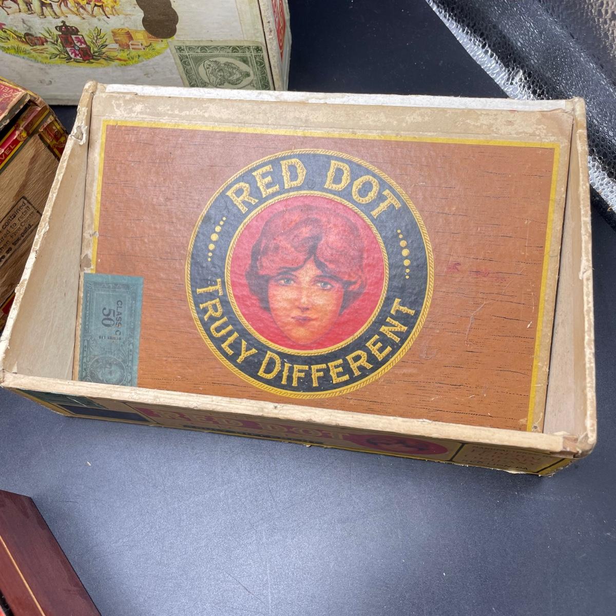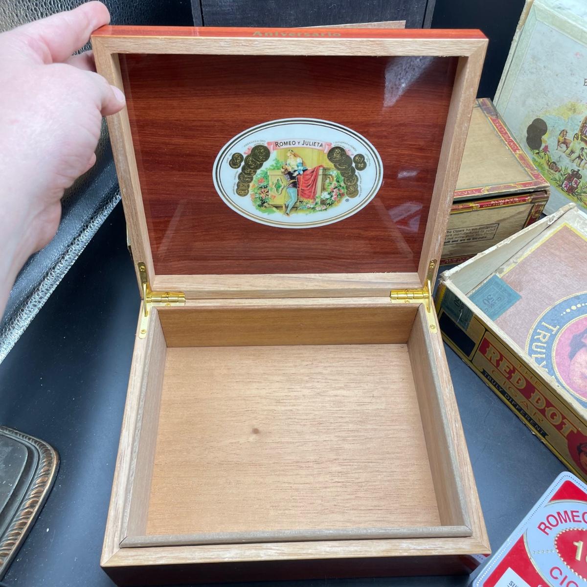 Five cigar boxes, vintage and newer plus a matching Romeo Y Julieta pocket tin. The On The Level box measures 13.5” x 5.25” x 3”. The Red Dot box is in fine shape, but the lid is no longer on its paper hinge. See images. Shipping available.