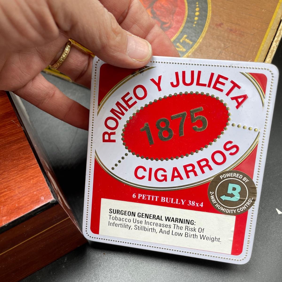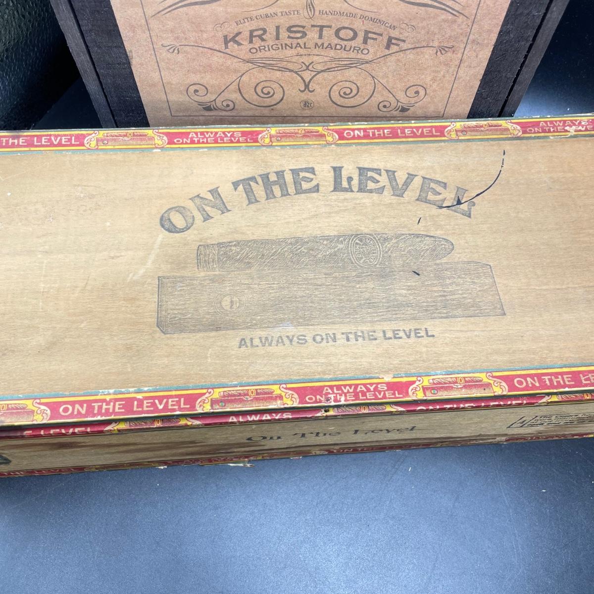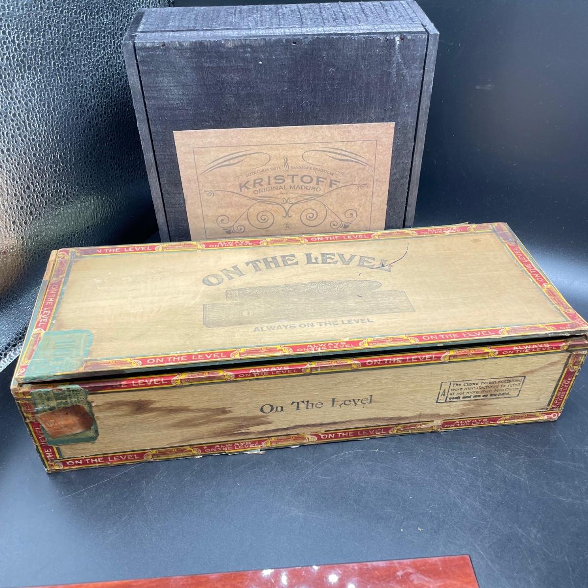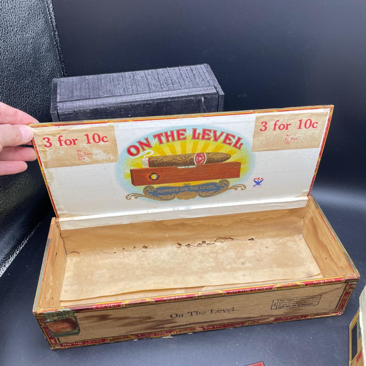 Five cigar boxes, vintage and newer plus a matching Romeo Y Julieta pocket tin. The On The Level box measures 13.5” x 5.25” x 3”. The Red Dot box is in fine shape, but the lid is no longer on its paper hinge. See images. Shipping available.