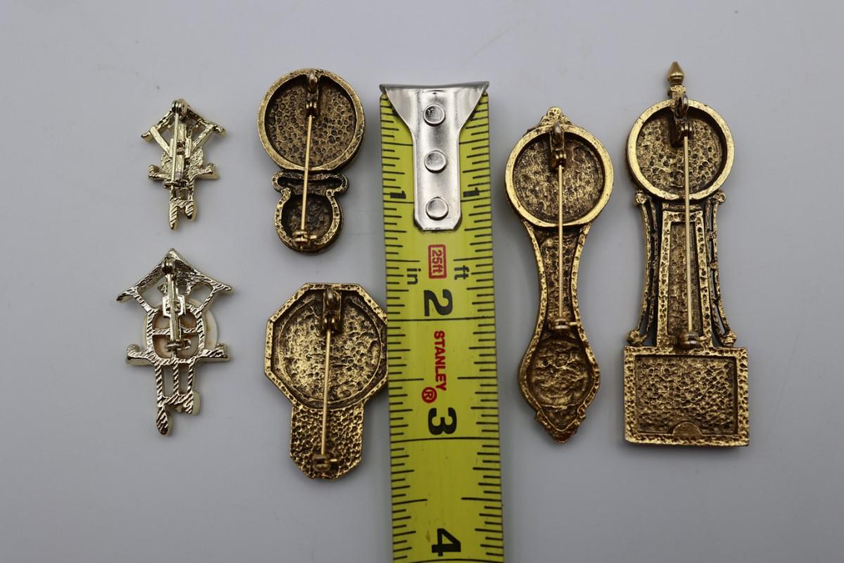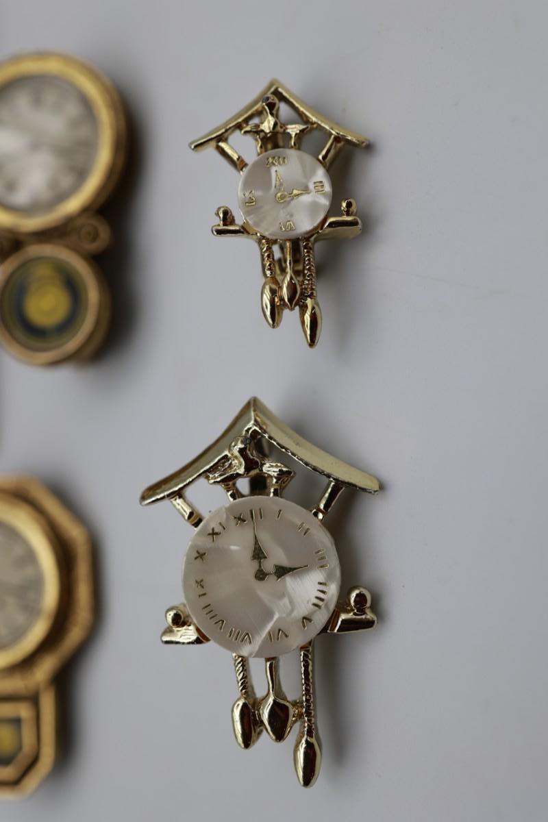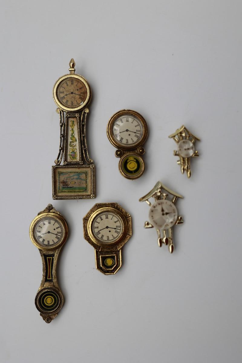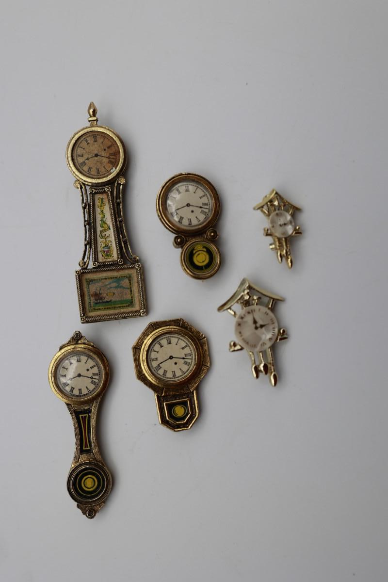 Two cuckoo clock brooches, 1 banjo clock brooch, and 3 clock brooches.