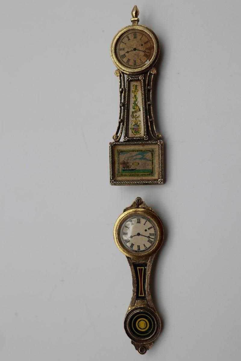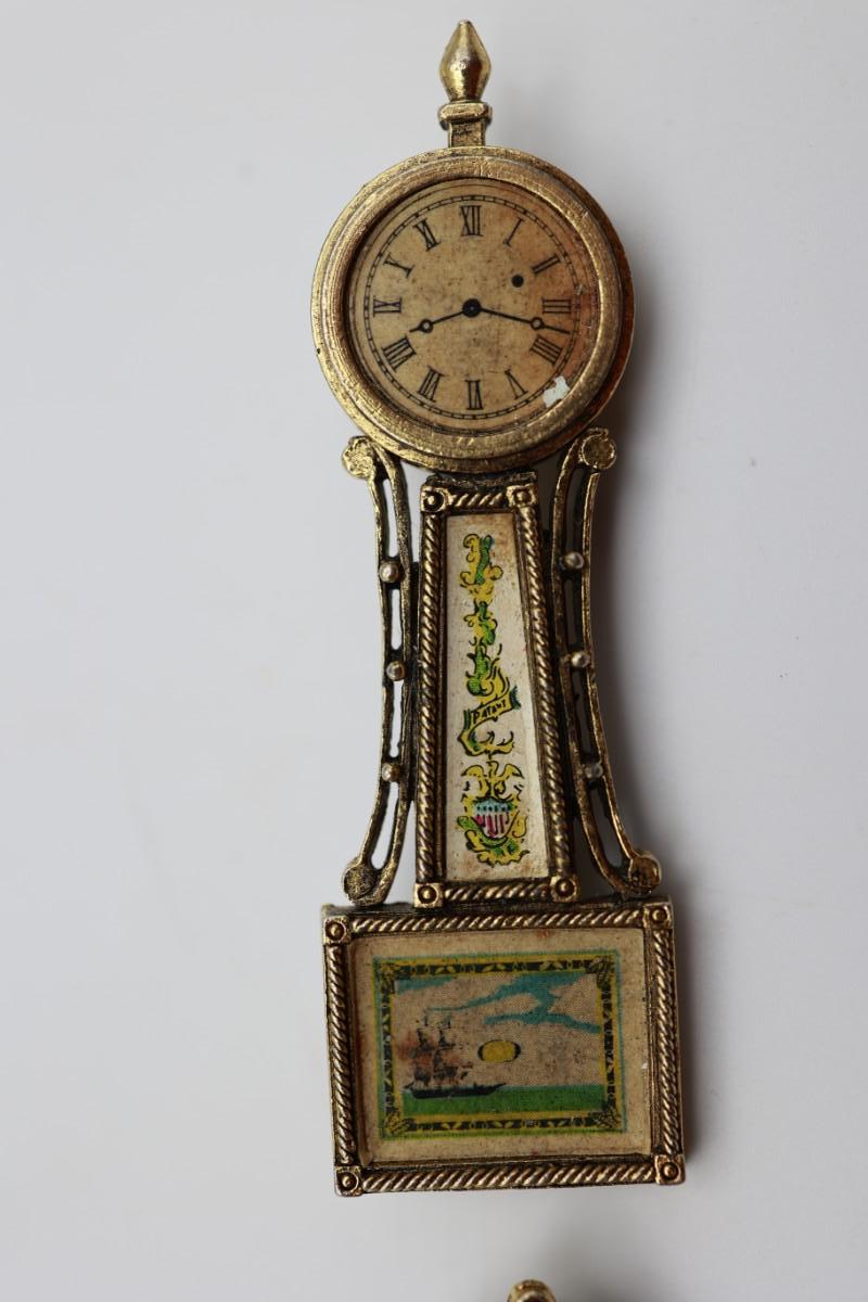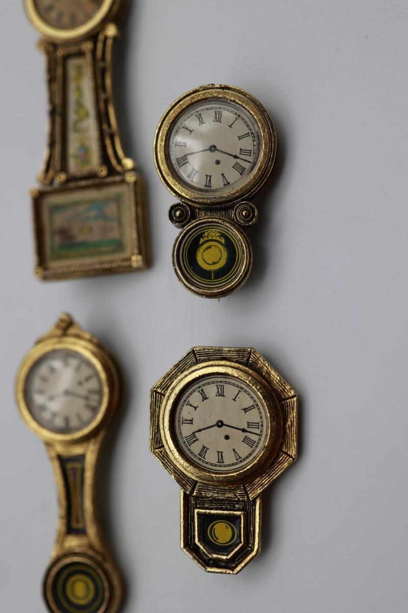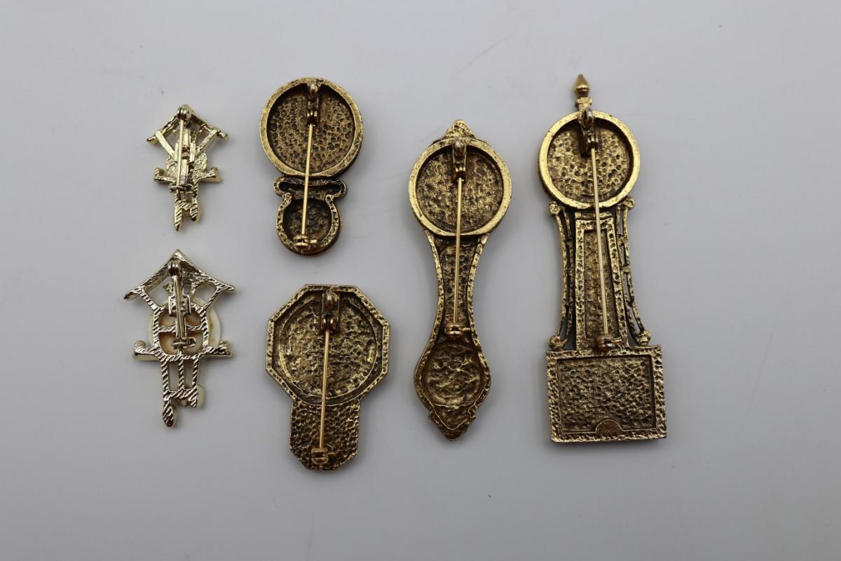 Two cuckoo clock brooches, 1 banjo clock brooch, and 3 clock brooches.
