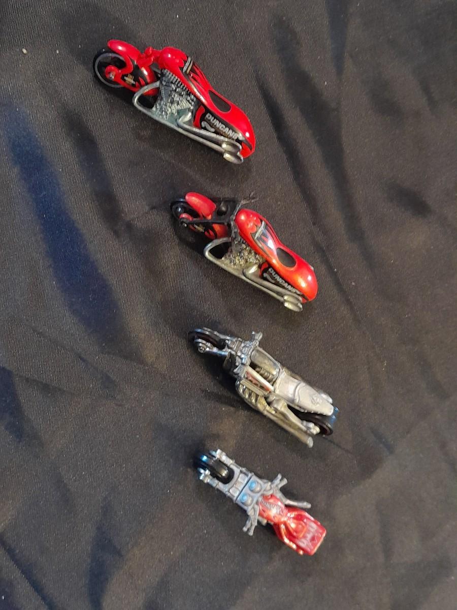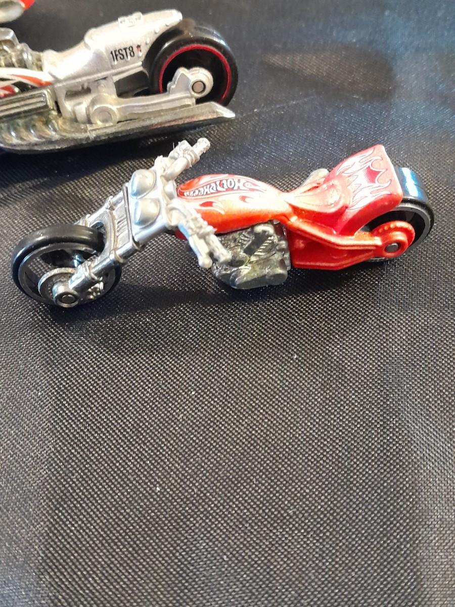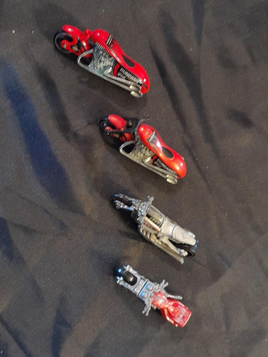 FIVE COLLECTABLE HOTWHEELS MOTORCYCLES (missing handlebars on one)