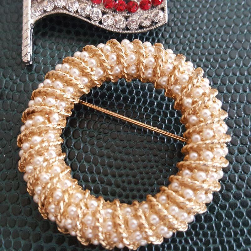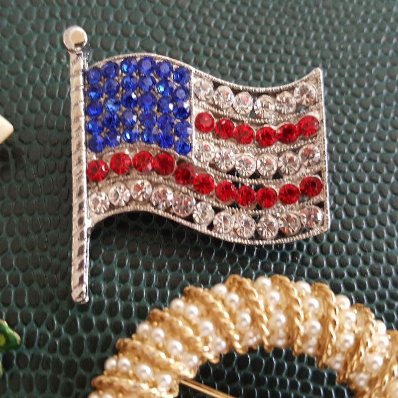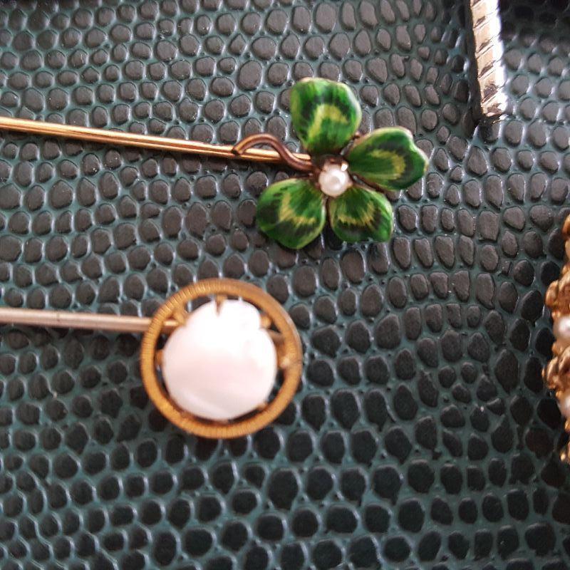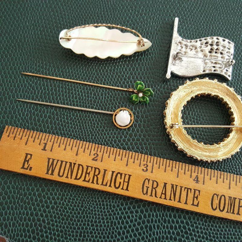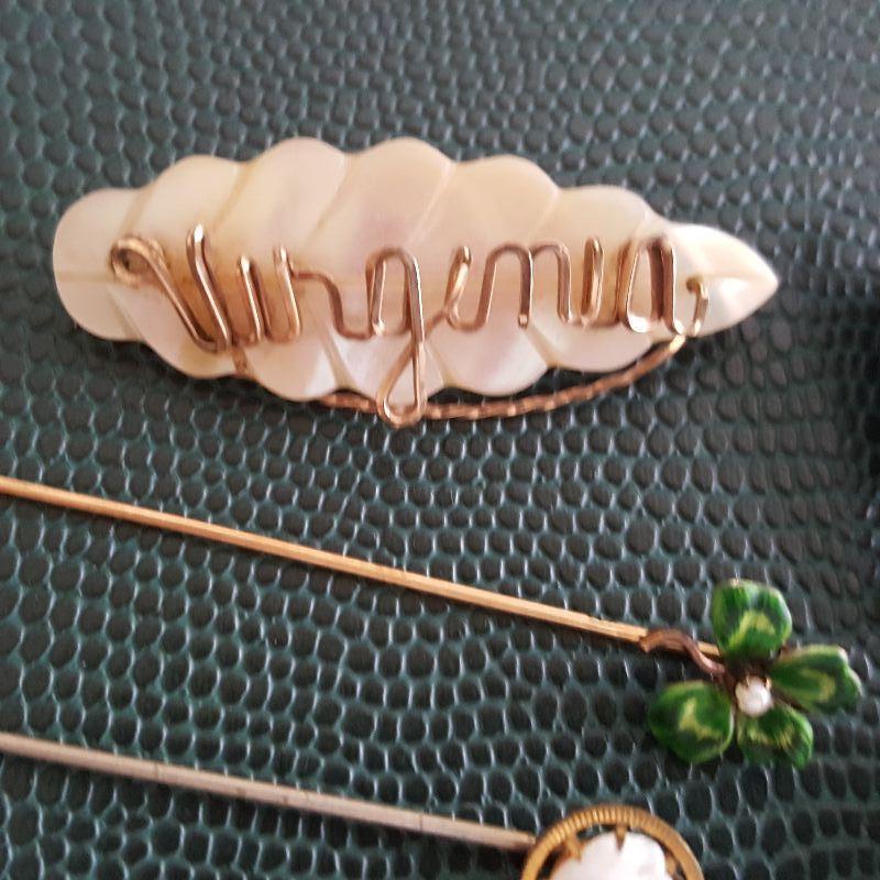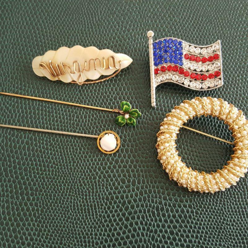 This auction lot is for a collection of Five Decorative Costume PIns. One is a carved shell part with the name Virginia spelled in script adhered to it, another is a US Flag in rhinestones, a round pin with pearl-like stones and two stick pins - one depicting a 4-leaf clover and another with what appears to be a natural pearl encircled in a gold-tone metal. All showy and ready for display.