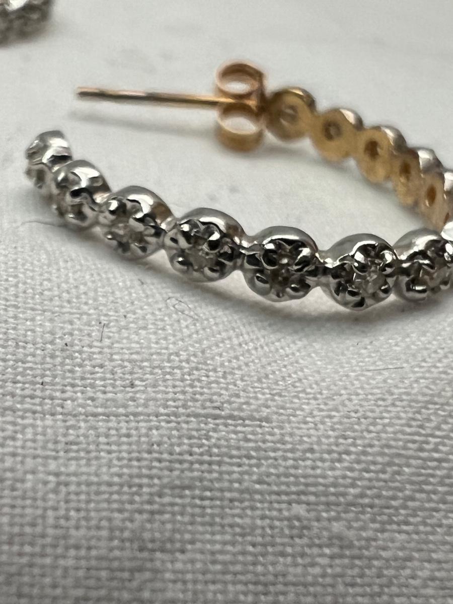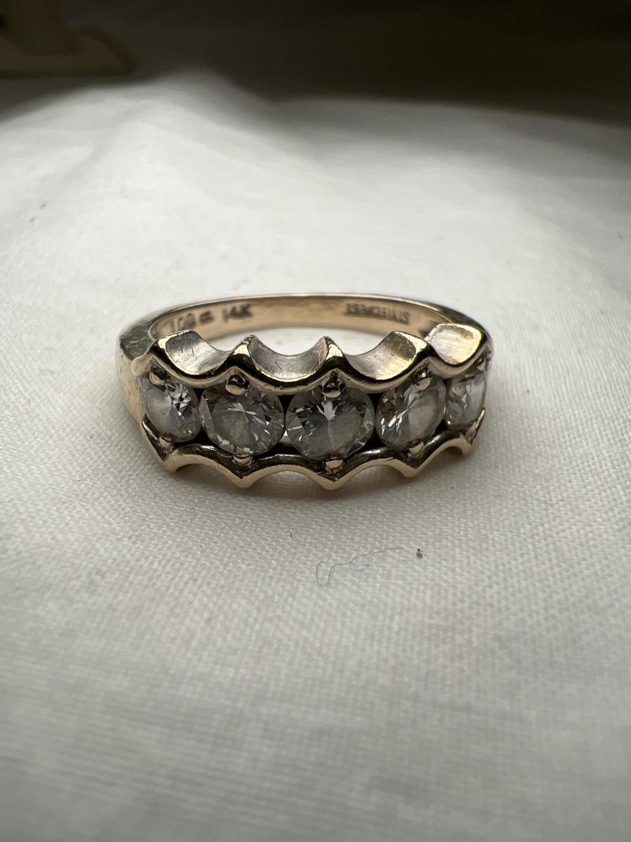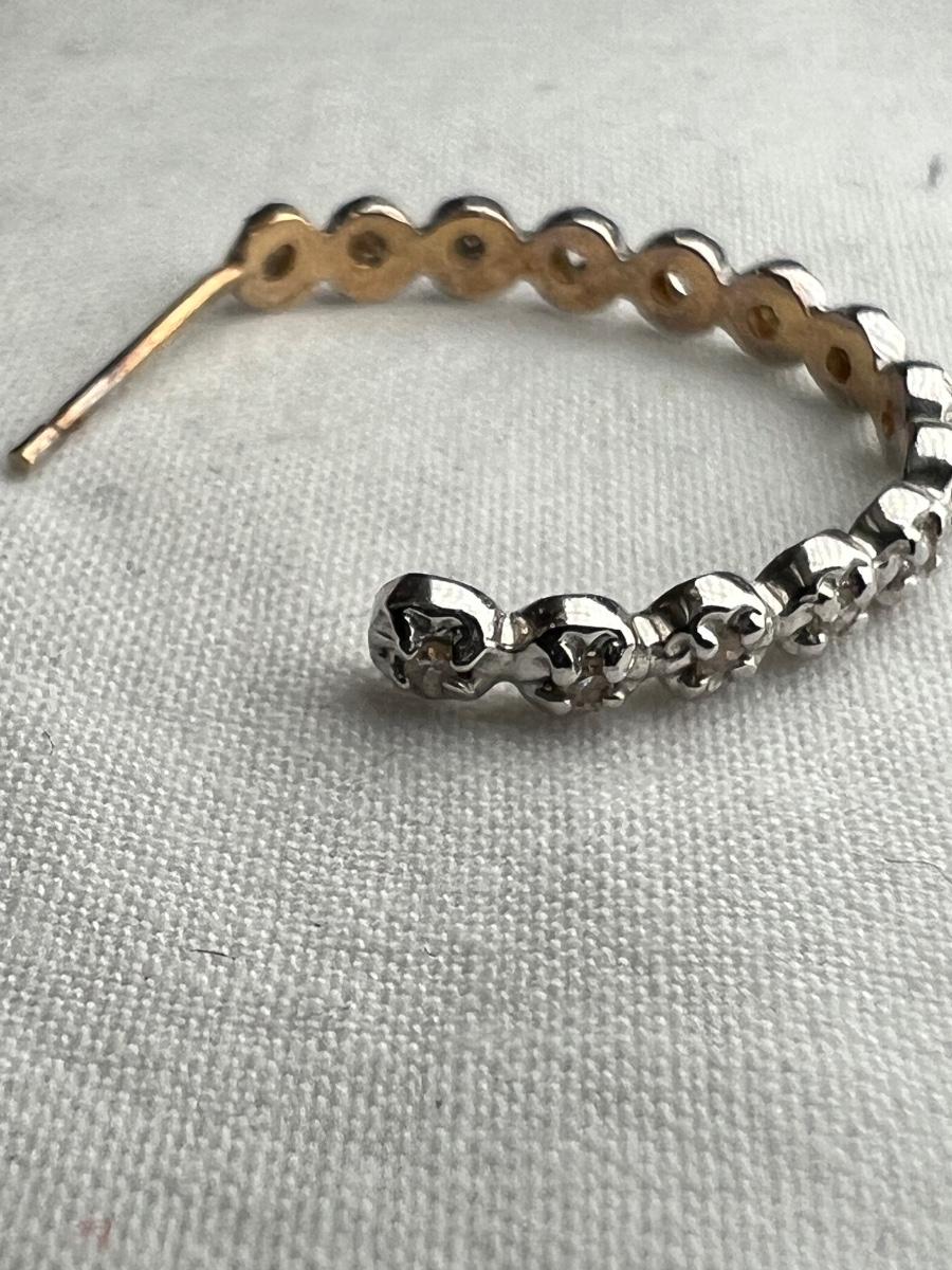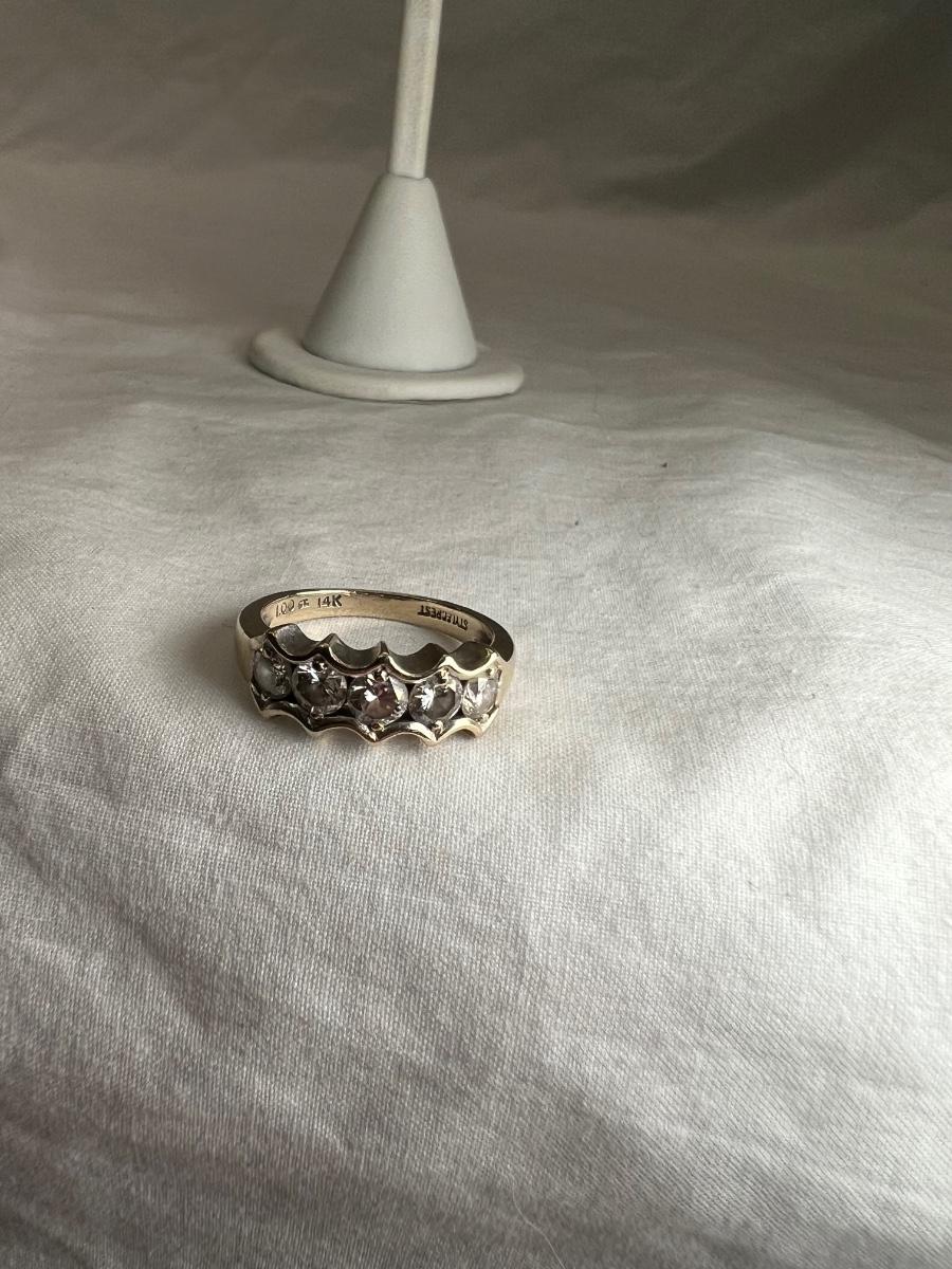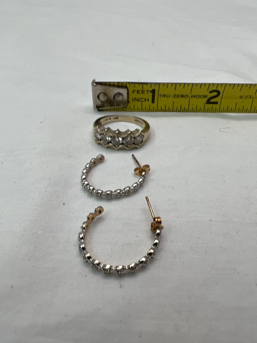 Five diamonds set in this 14K gold ring, diamonds tested positive. A pair of silver and gold colored hoop earrings for pierced ears are included that have no markings.