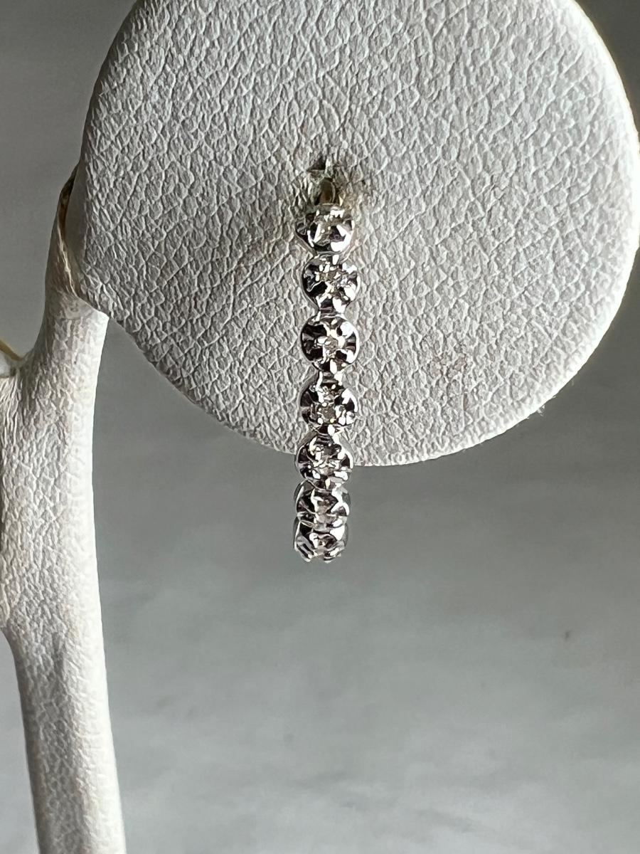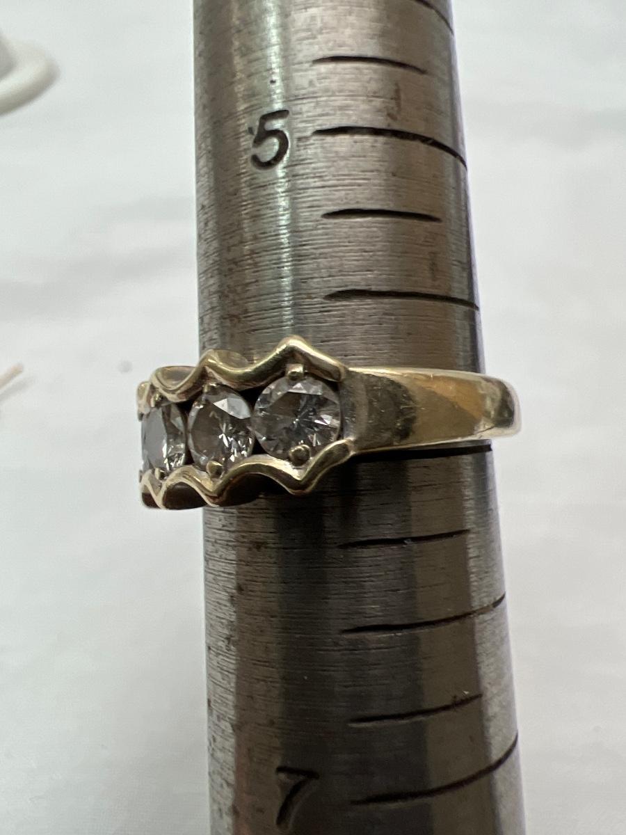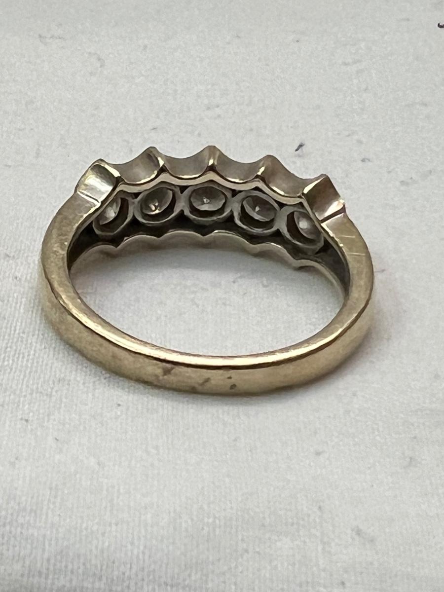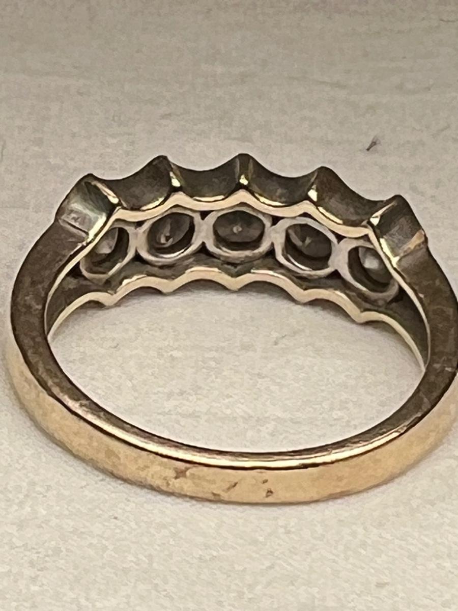 Five diamonds set in this 14K gold ring, diamonds tested positive. A pair of silver and gold colored hoop earrings for pierced ears are included that have no markings.