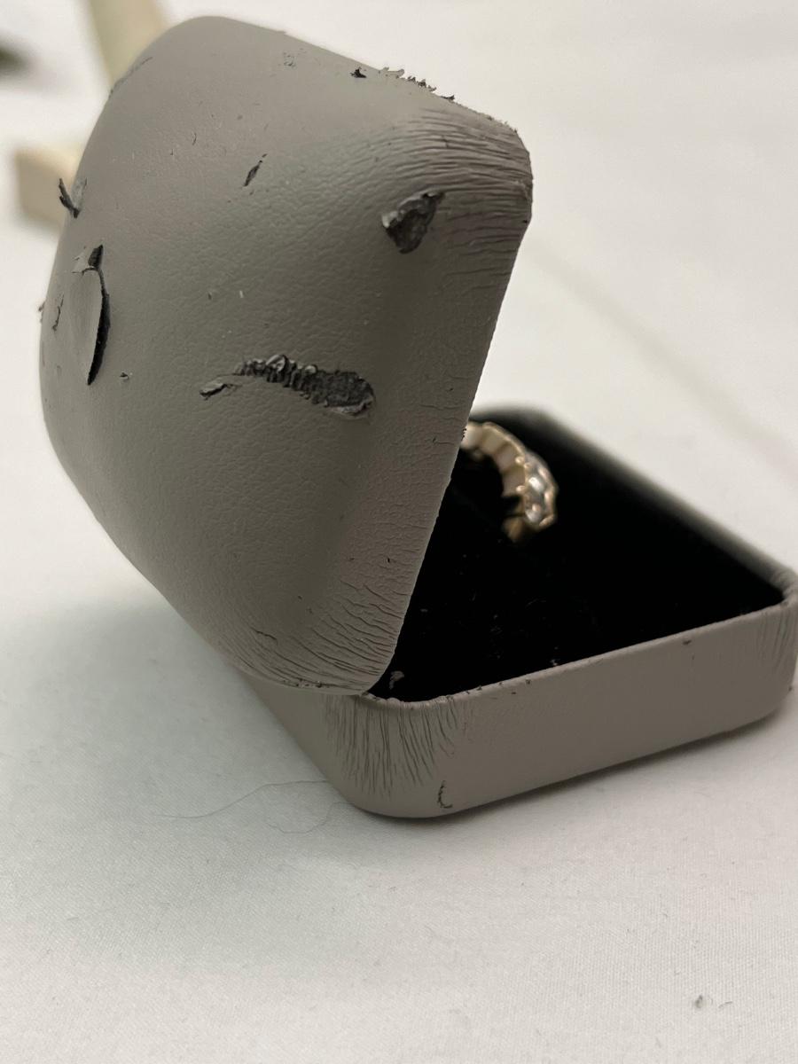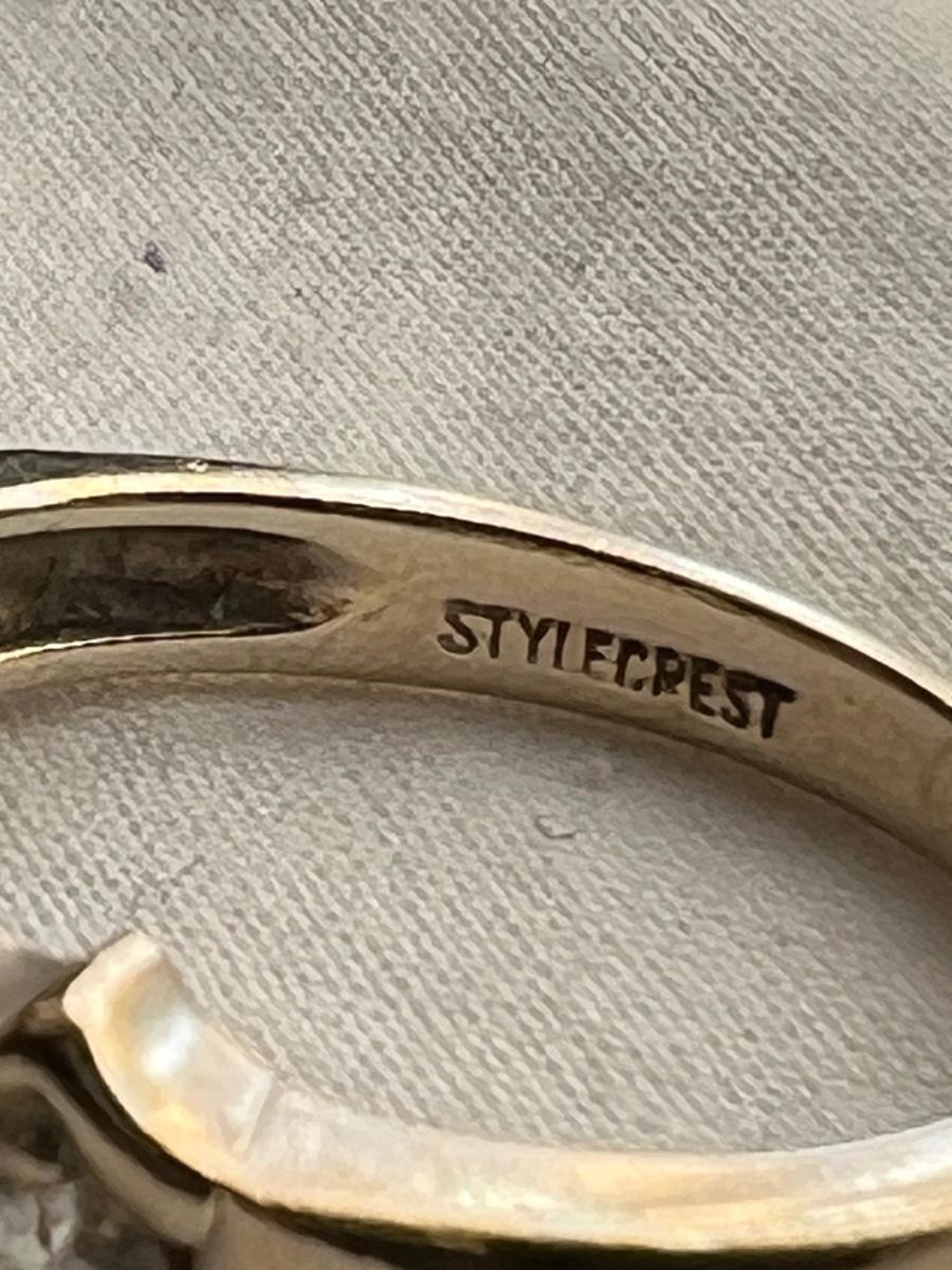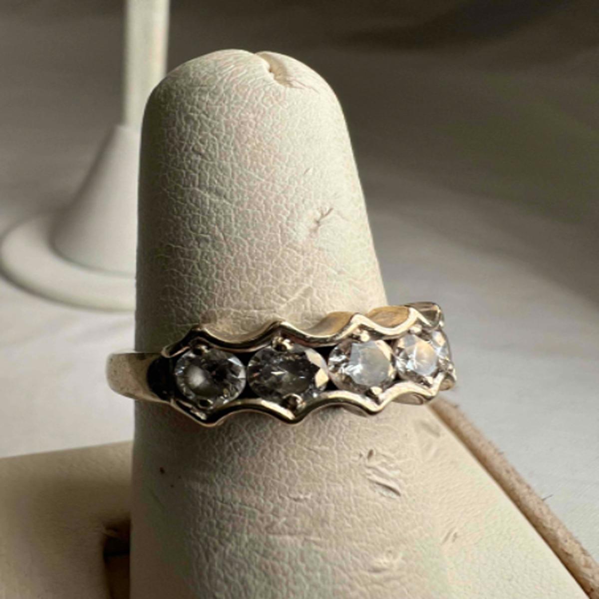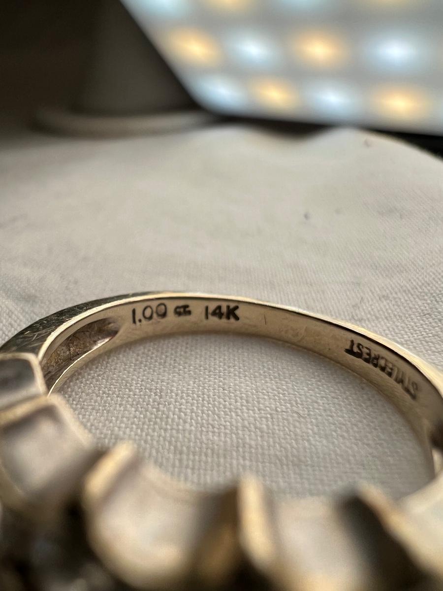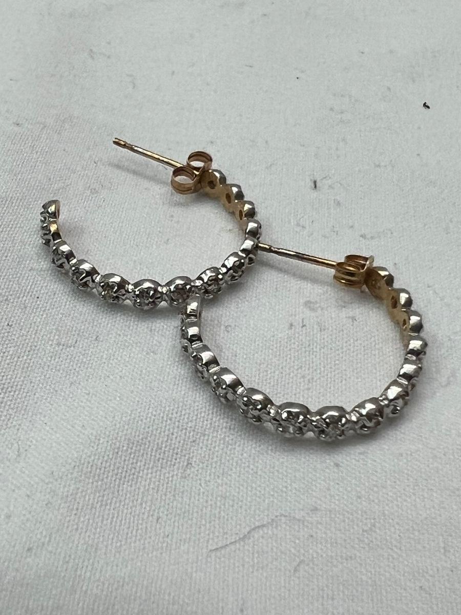 Five diamonds set in this 14K gold ring, diamonds tested positive. A pair of silver and gold colored hoop earrings for pierced ears are included that have no markings.