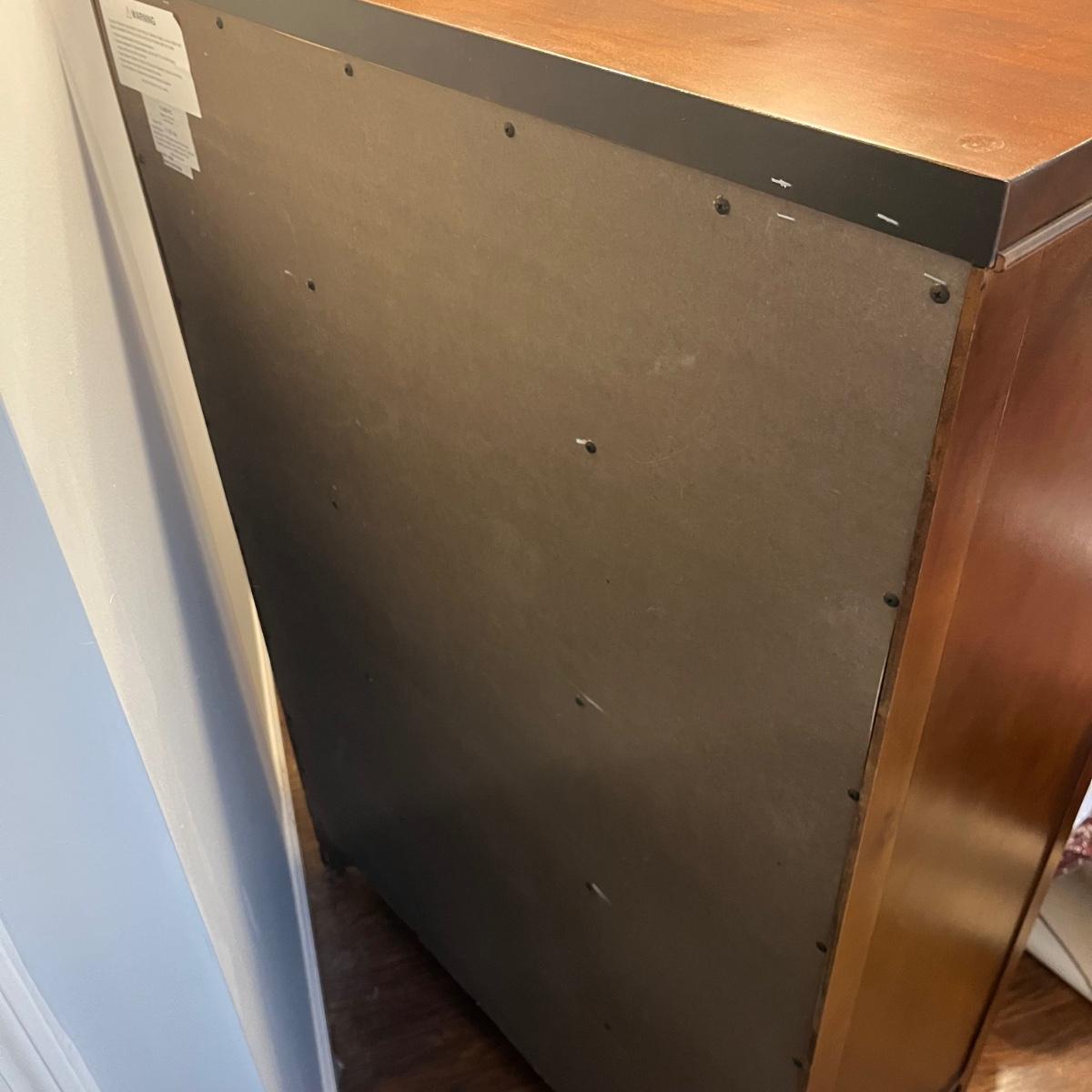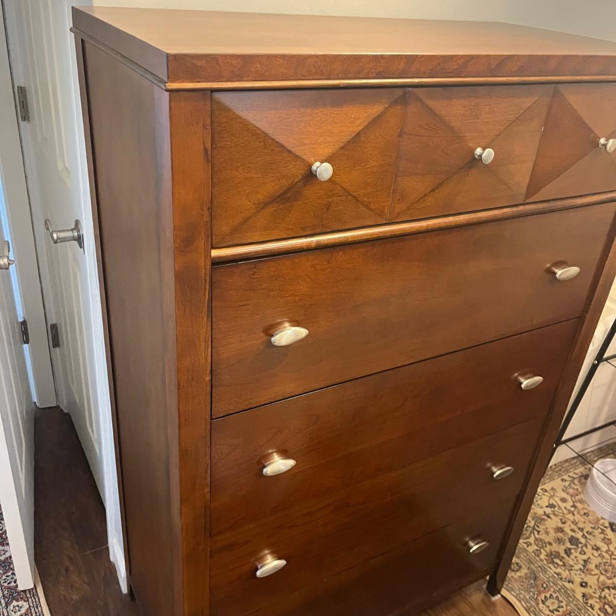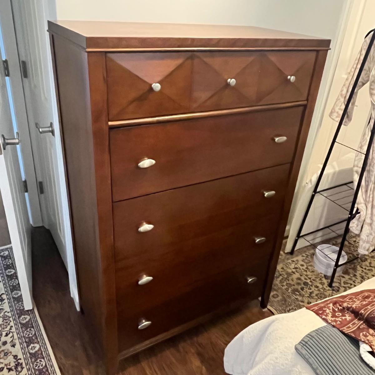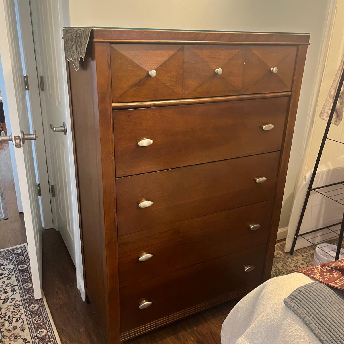 Lot includes a wooden five drawer chest of drawers with a piece of glass cut to fit on top of chest. Chest measures 17.75” x 36” x 57”H.