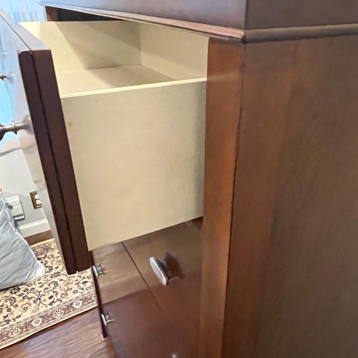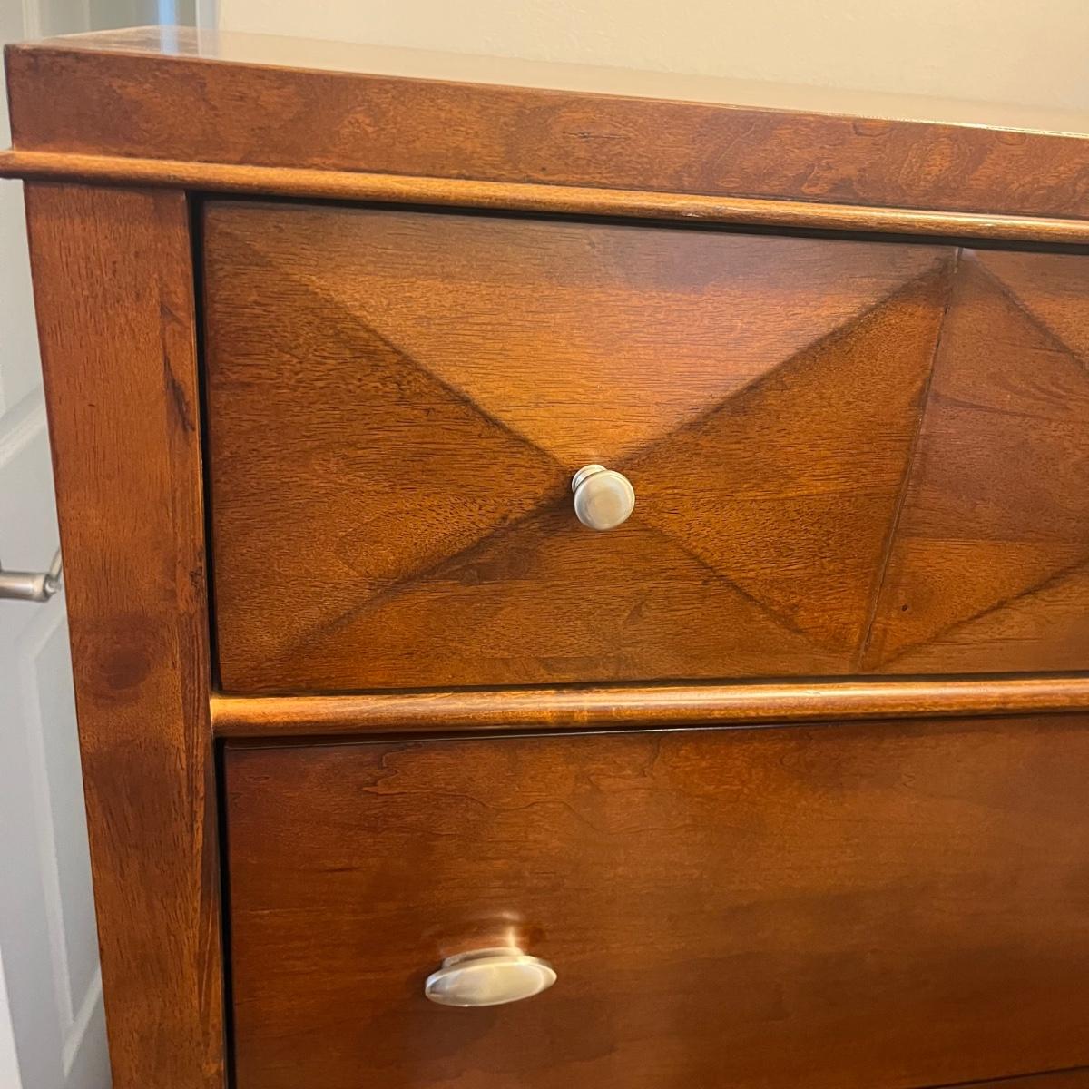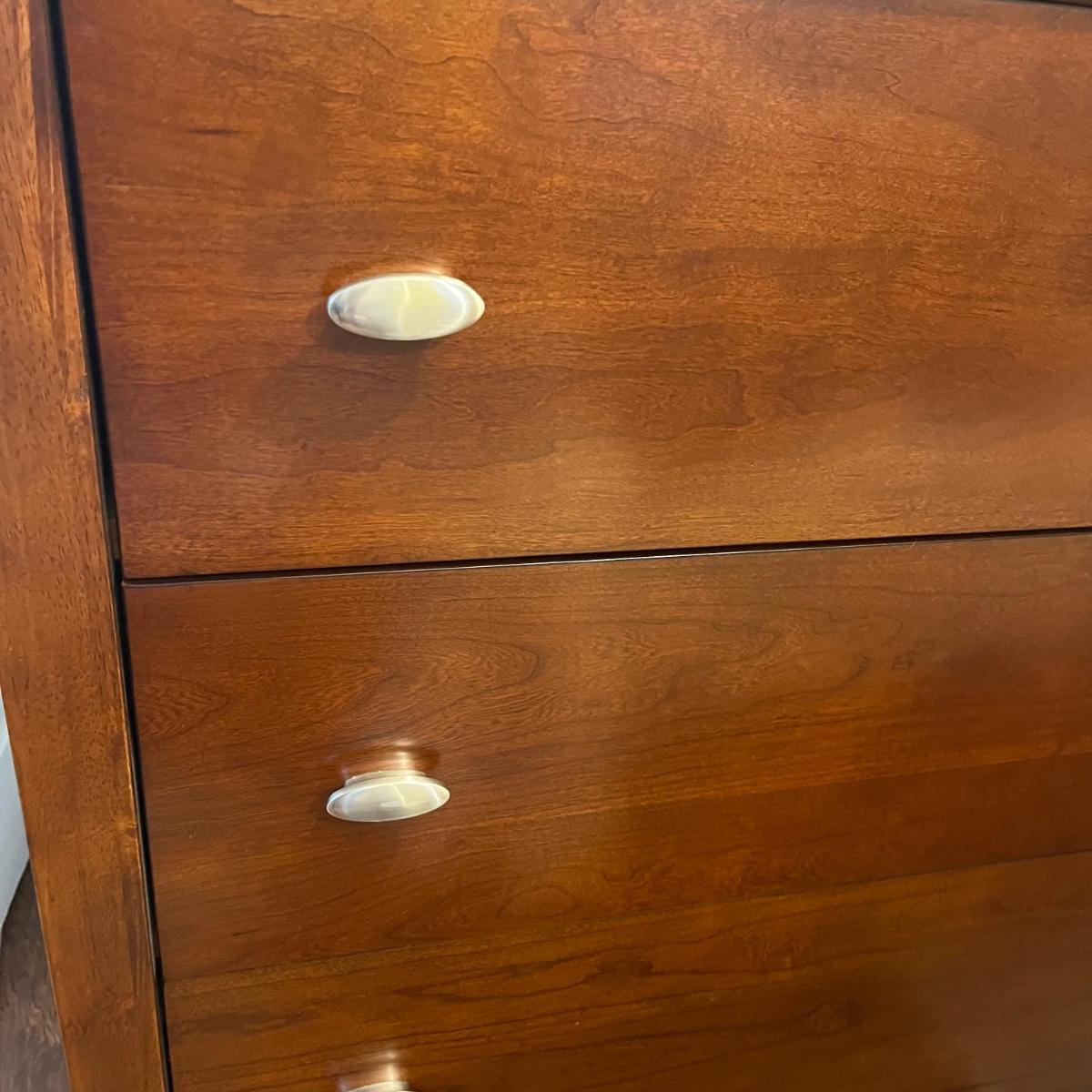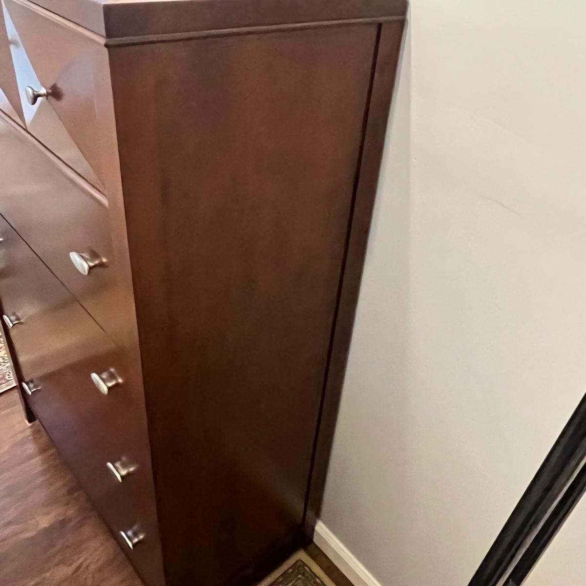 Lot includes a wooden five drawer chest of drawers with a piece of glass cut to fit on top of chest. Chest measures 17.75” x 36” x 57”H.