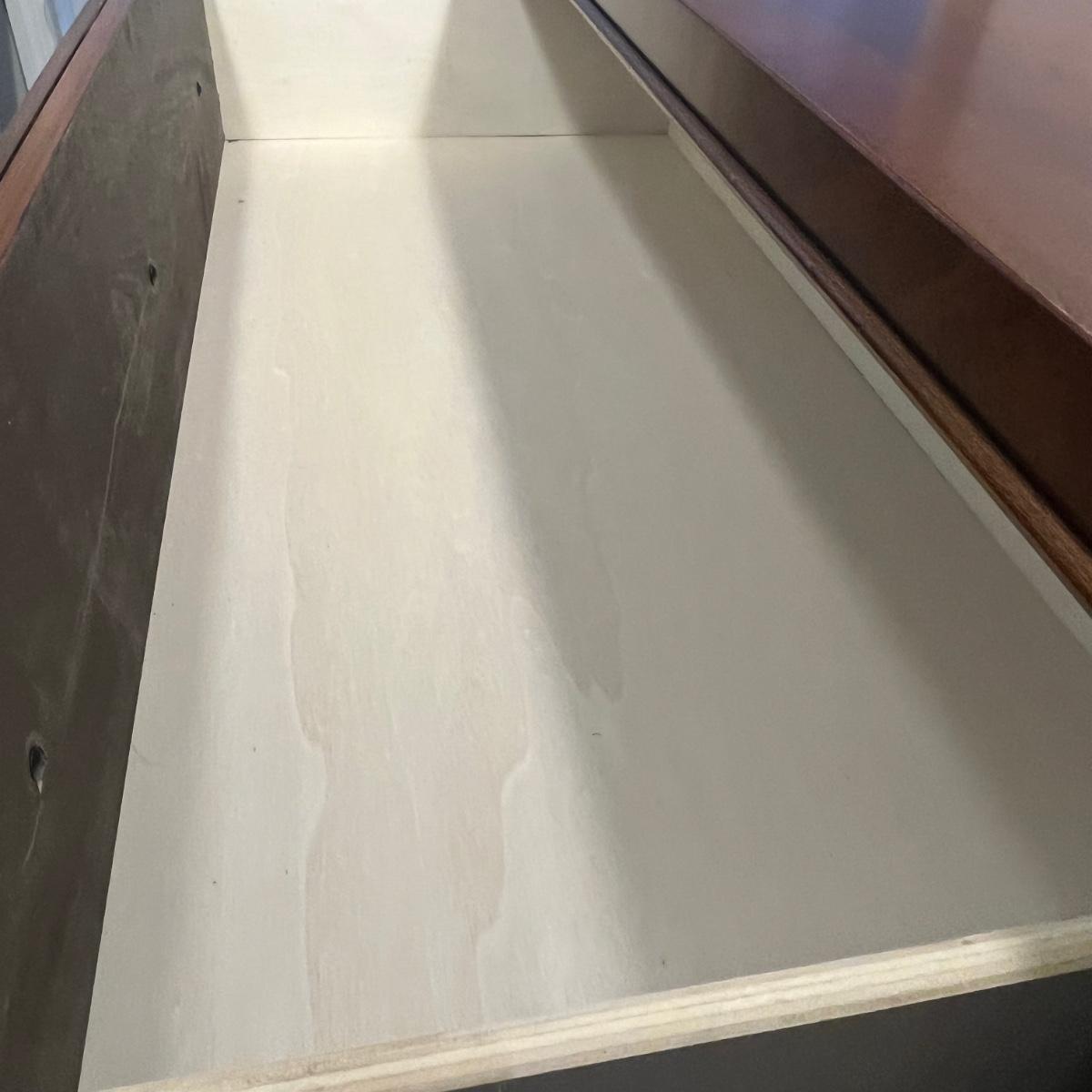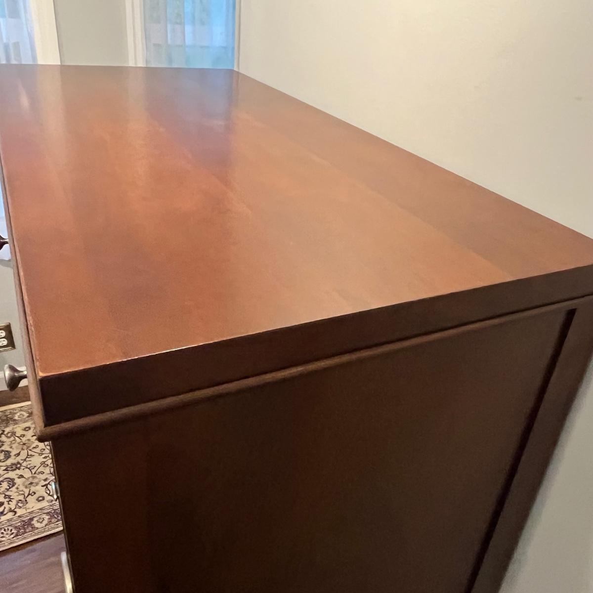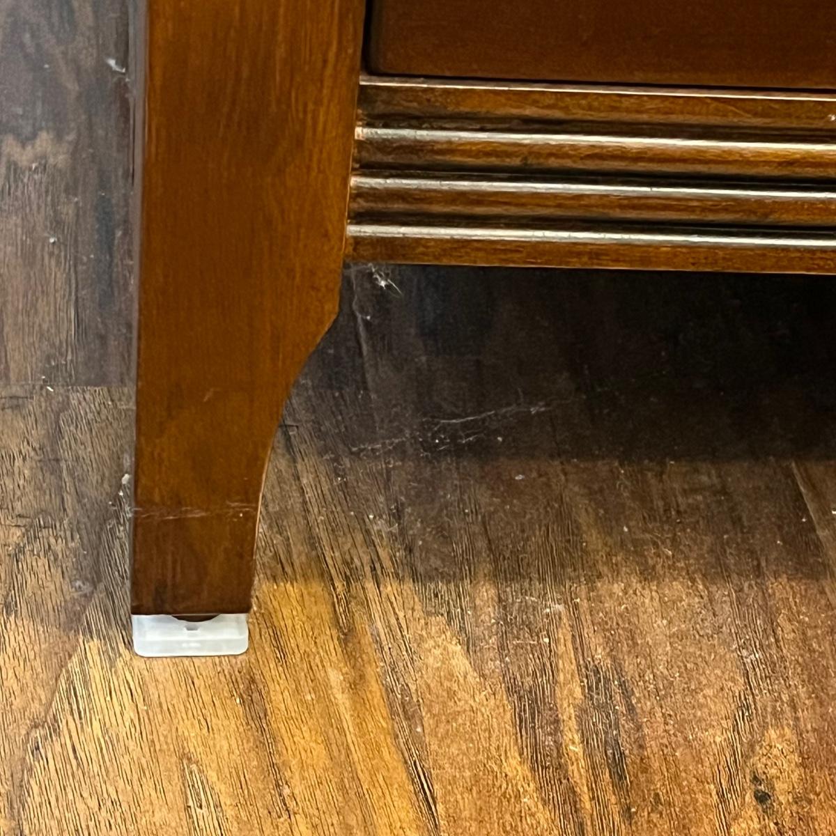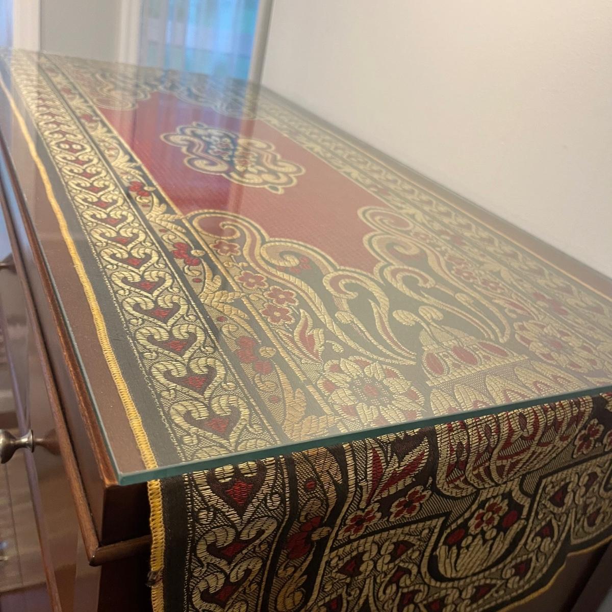 Lot includes a wooden five drawer chest of drawers with a piece of glass cut to fit on top of chest. Chest measures 17.75” x 36” x 57”H.