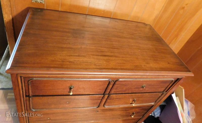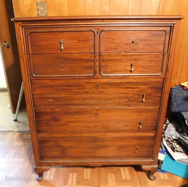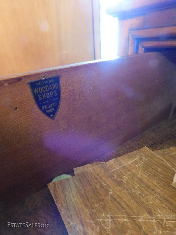 Very appealing finish on this 5 drawer dresser made by Woodard Shops in Michigan. Has some scratches and wear. Pulls are missing. No key.