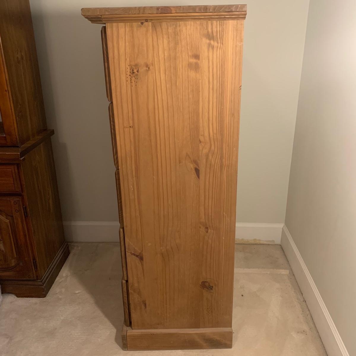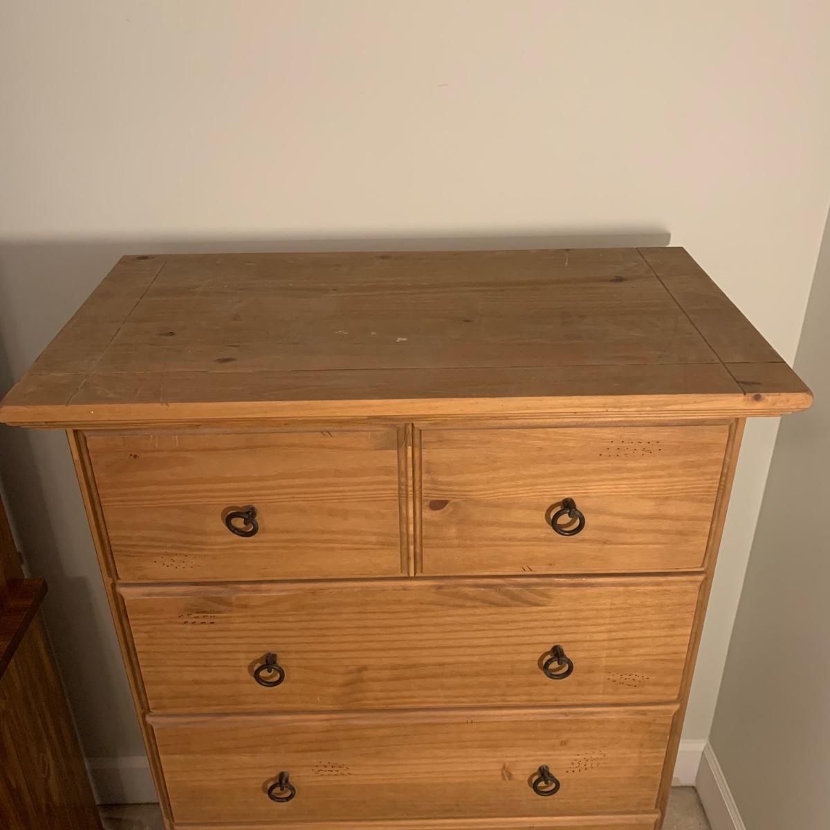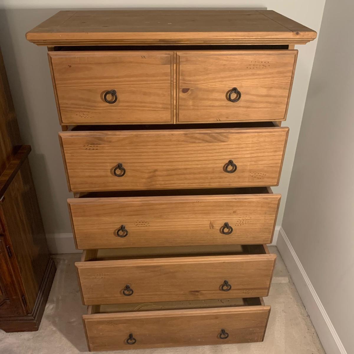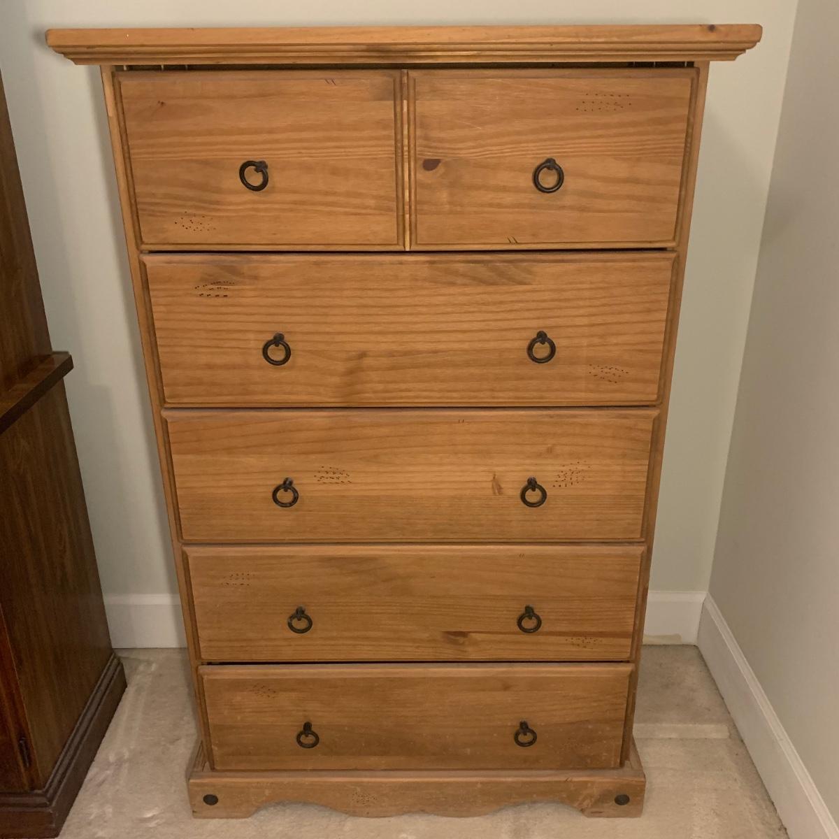 Five drawer wooden dresser with cast iron-like hardware and embellishments. Dresser has blemishes and scratches but appears to be in good condition. No makers mark, but has multiple stickers that say, “Made in Brazil”. This item measures, 31.5”L x 17.5”W x 48.5”H.