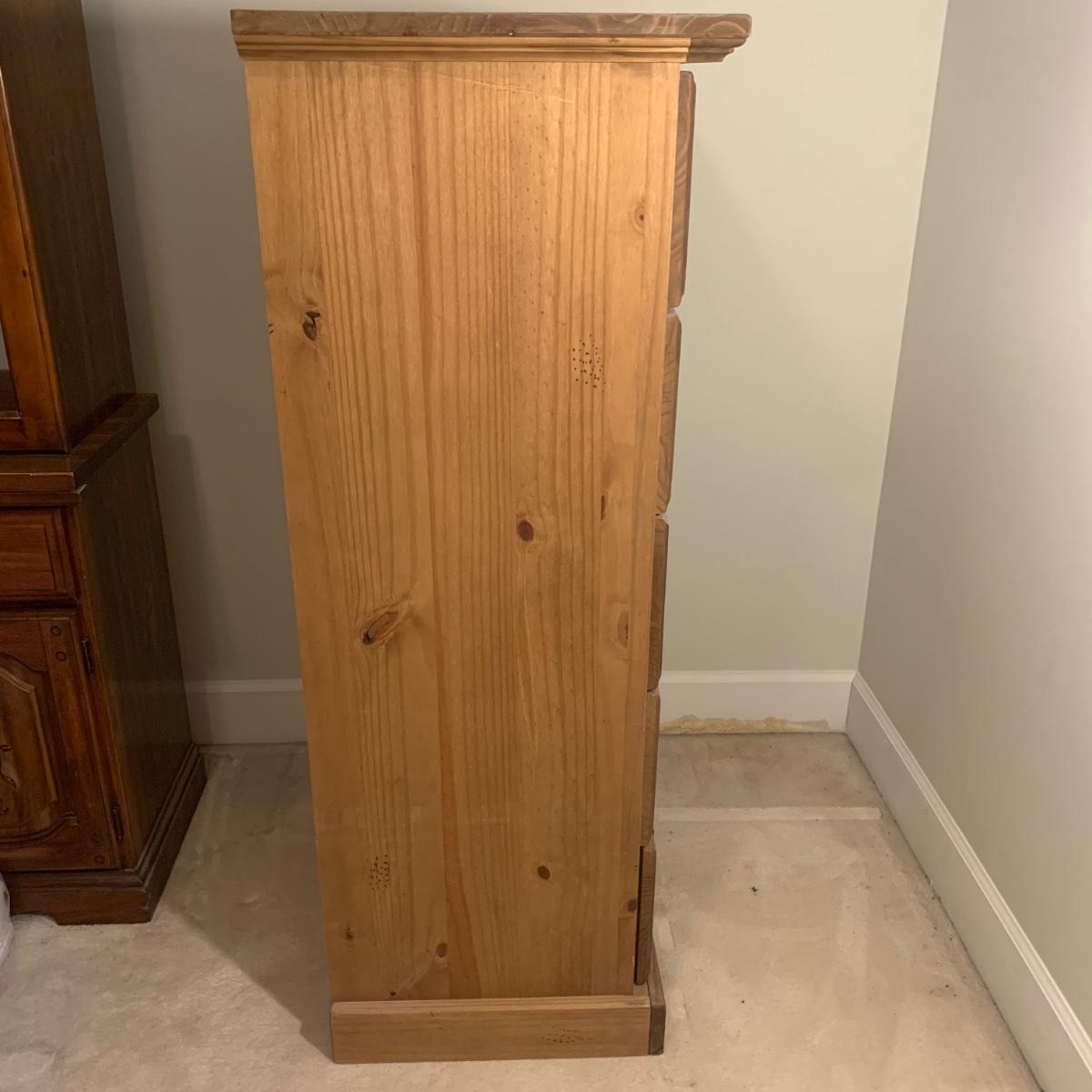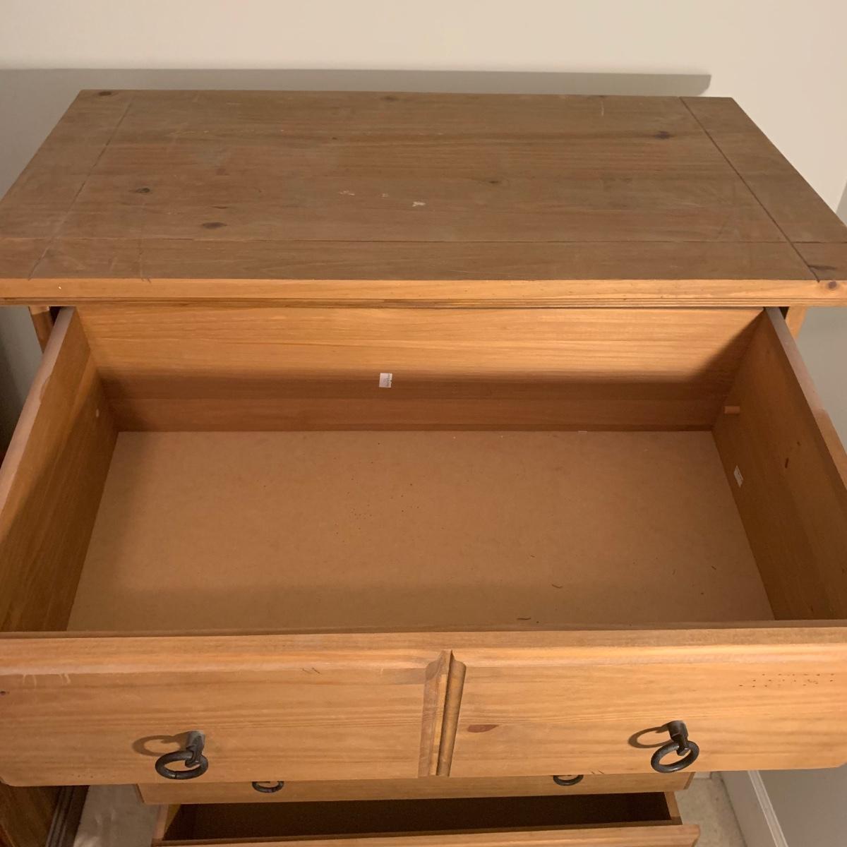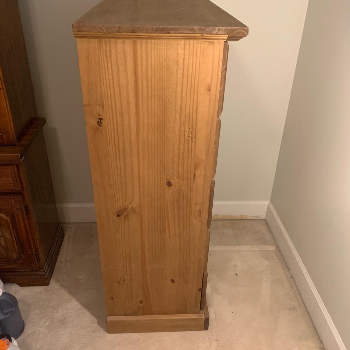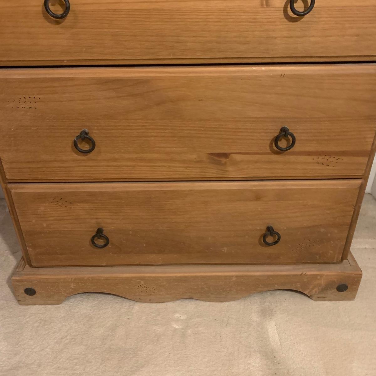 Five drawer wooden dresser with cast iron-like hardware and embellishments. Dresser has blemishes and scratches but appears to be in good condition. No makers mark, but has multiple stickers that say, “Made in Brazil”. This item measures, 31.5”L x 17.5”W x 48.5”H.