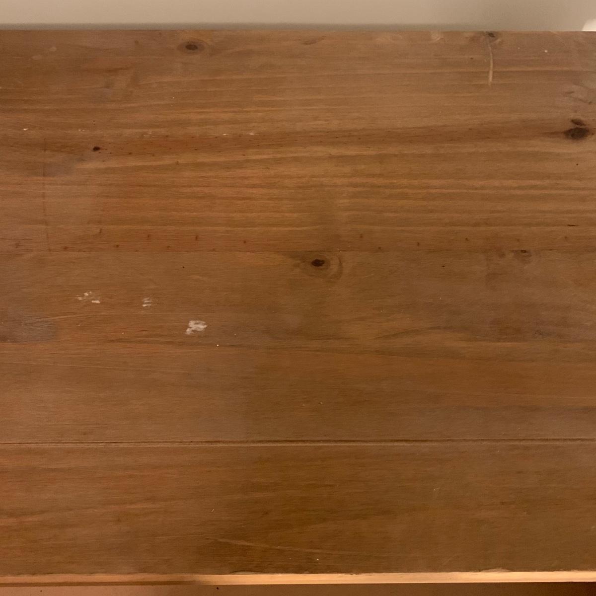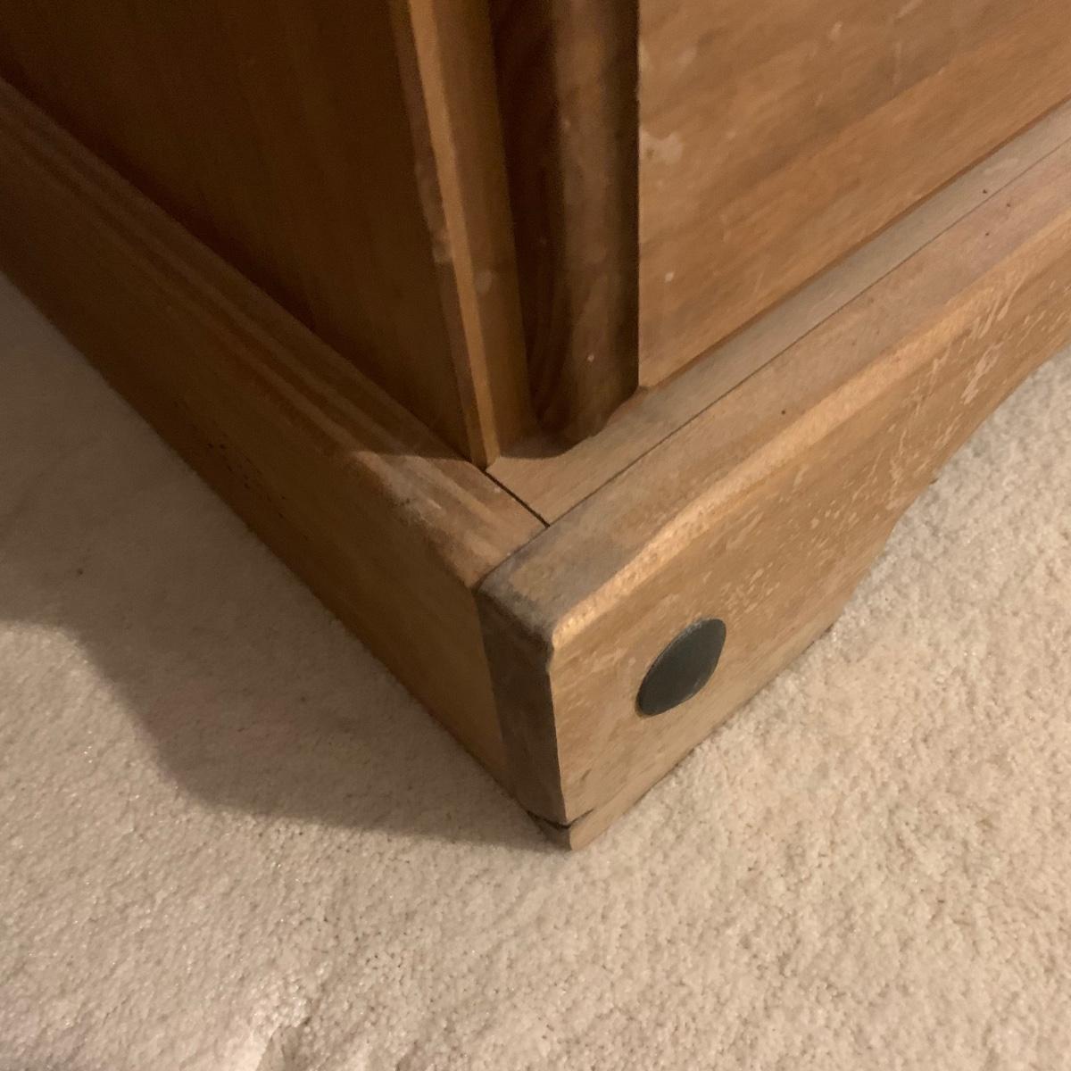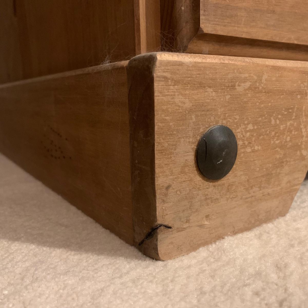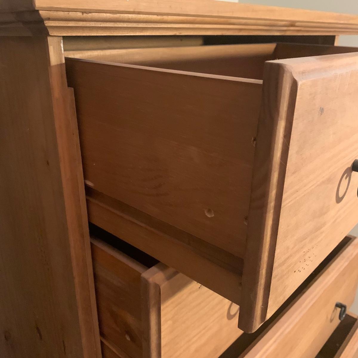 Five drawer wooden dresser with cast iron-like hardware and embellishments. Dresser has blemishes and scratches but appears to be in good condition. No makers mark, but has multiple stickers that say, “Made in Brazil”. This item measures, 31.5”L x 17.5”W x 48.5”H.