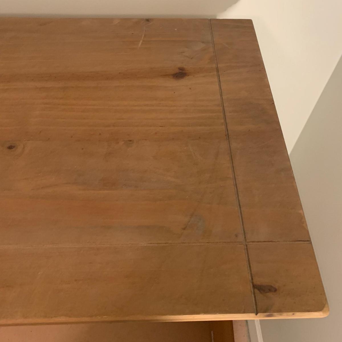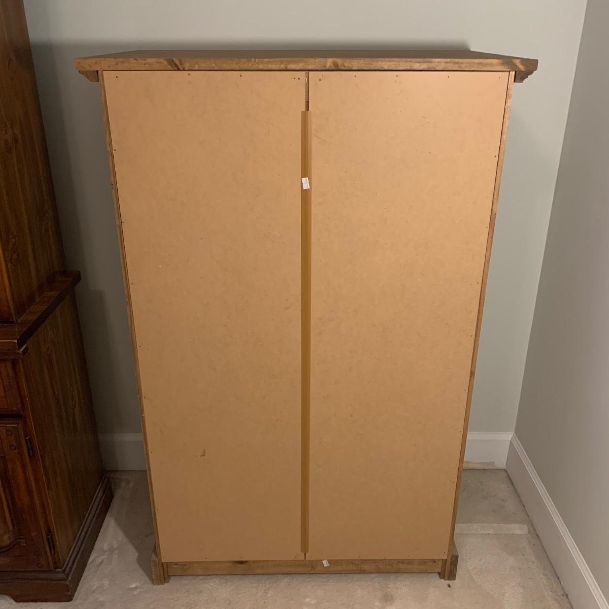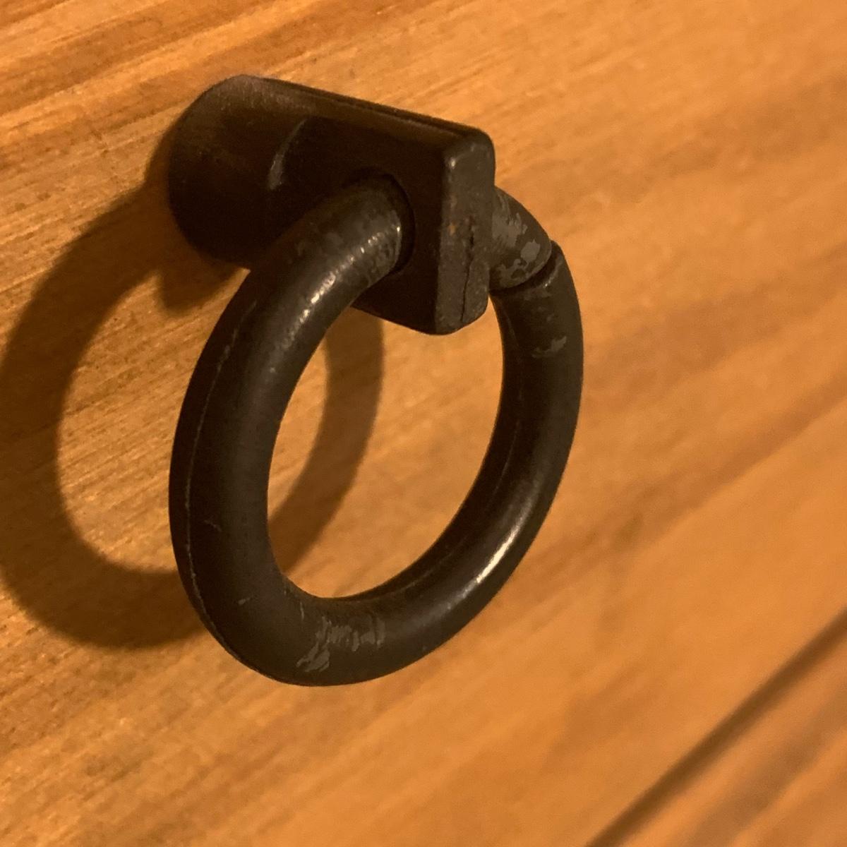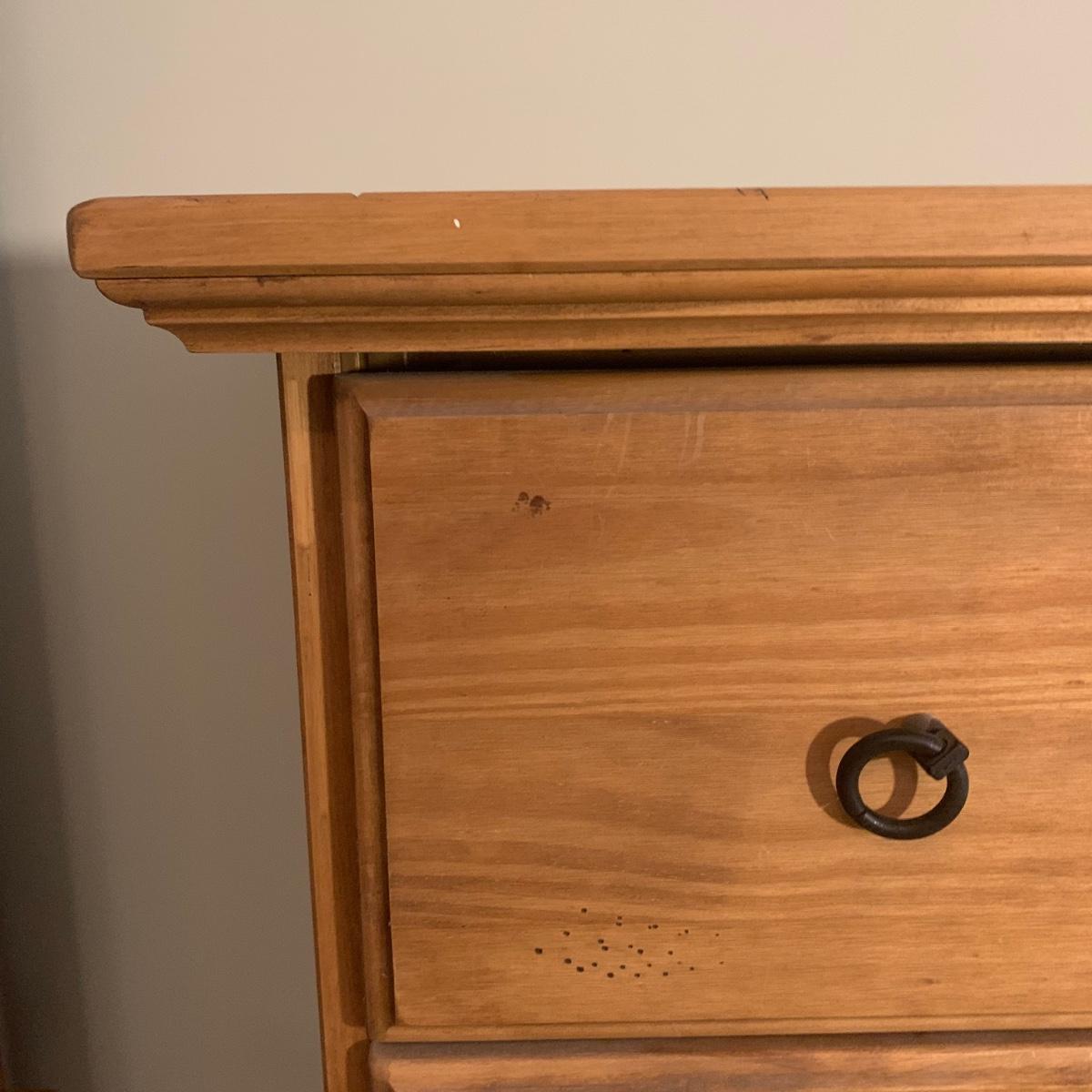 Five drawer wooden dresser with cast iron-like hardware and embellishments. Dresser has blemishes and scratches but appears to be in good condition. No makers mark, but has multiple stickers that say, “Made in Brazil”. This item measures, 31.5”L x 17.5”W x 48.5”H.