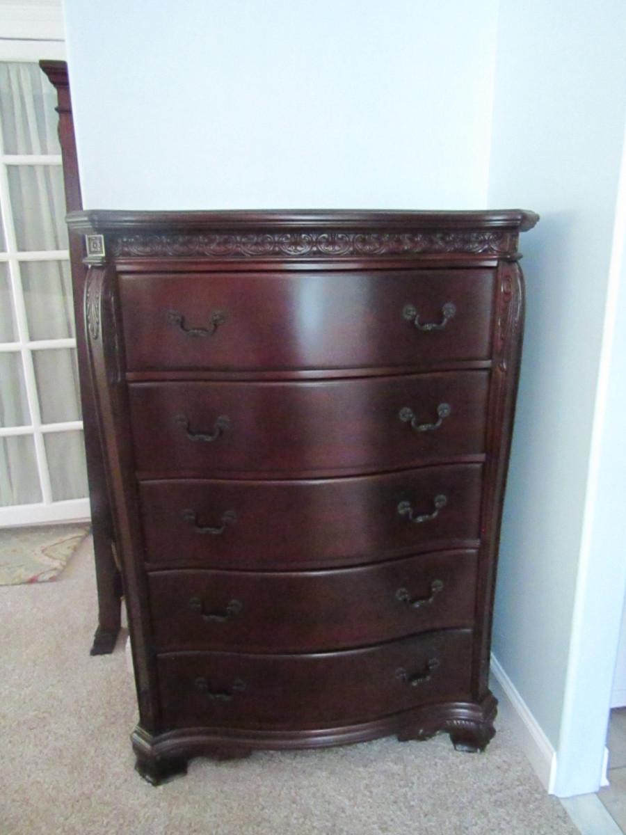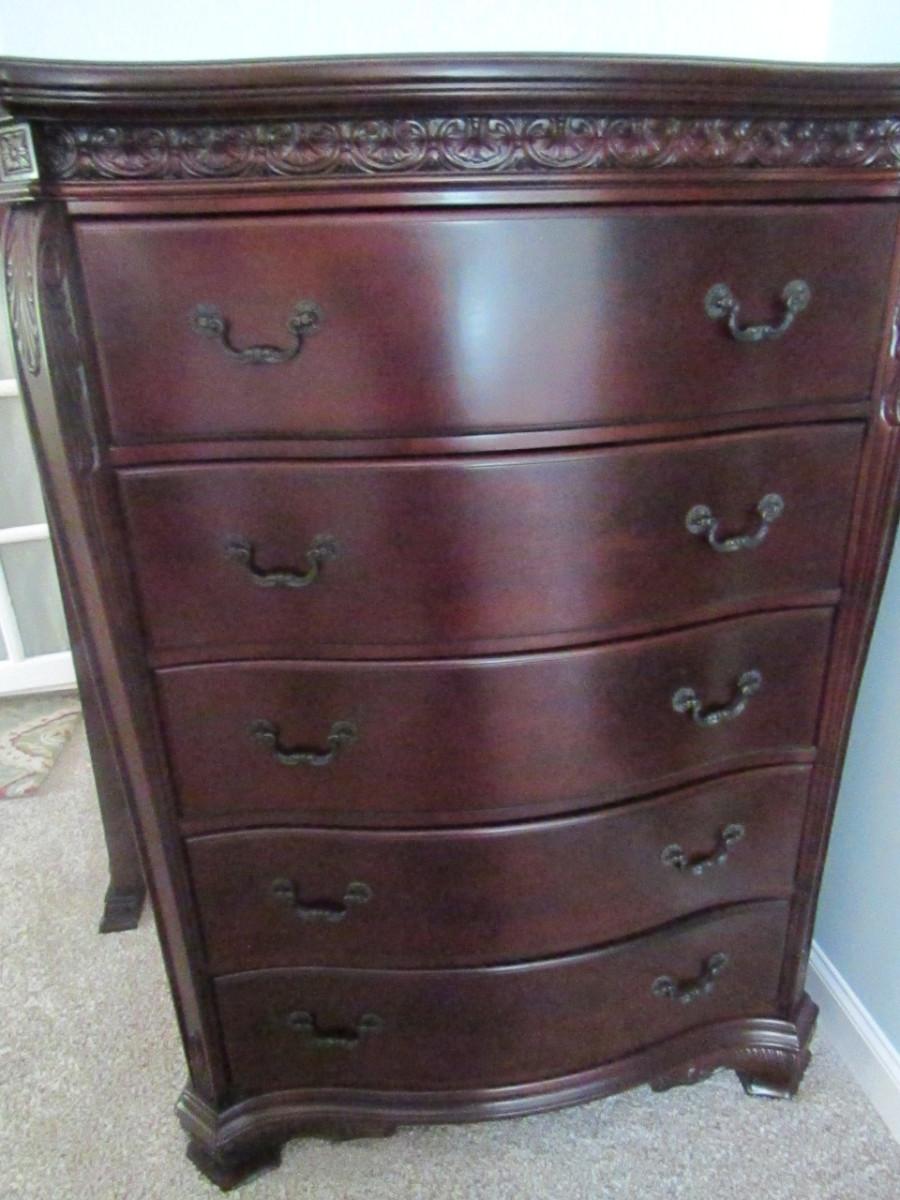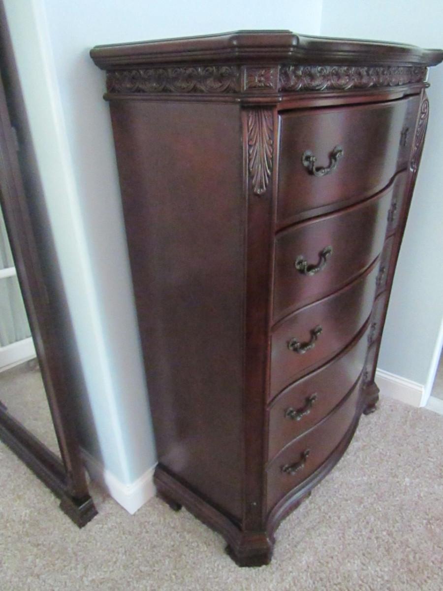 Five Drawer Tall Dresser with Carved Accents. No maker's mark found.