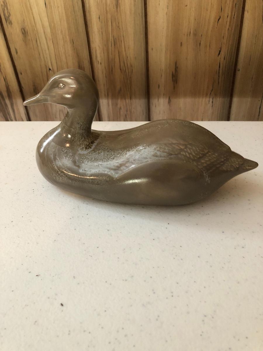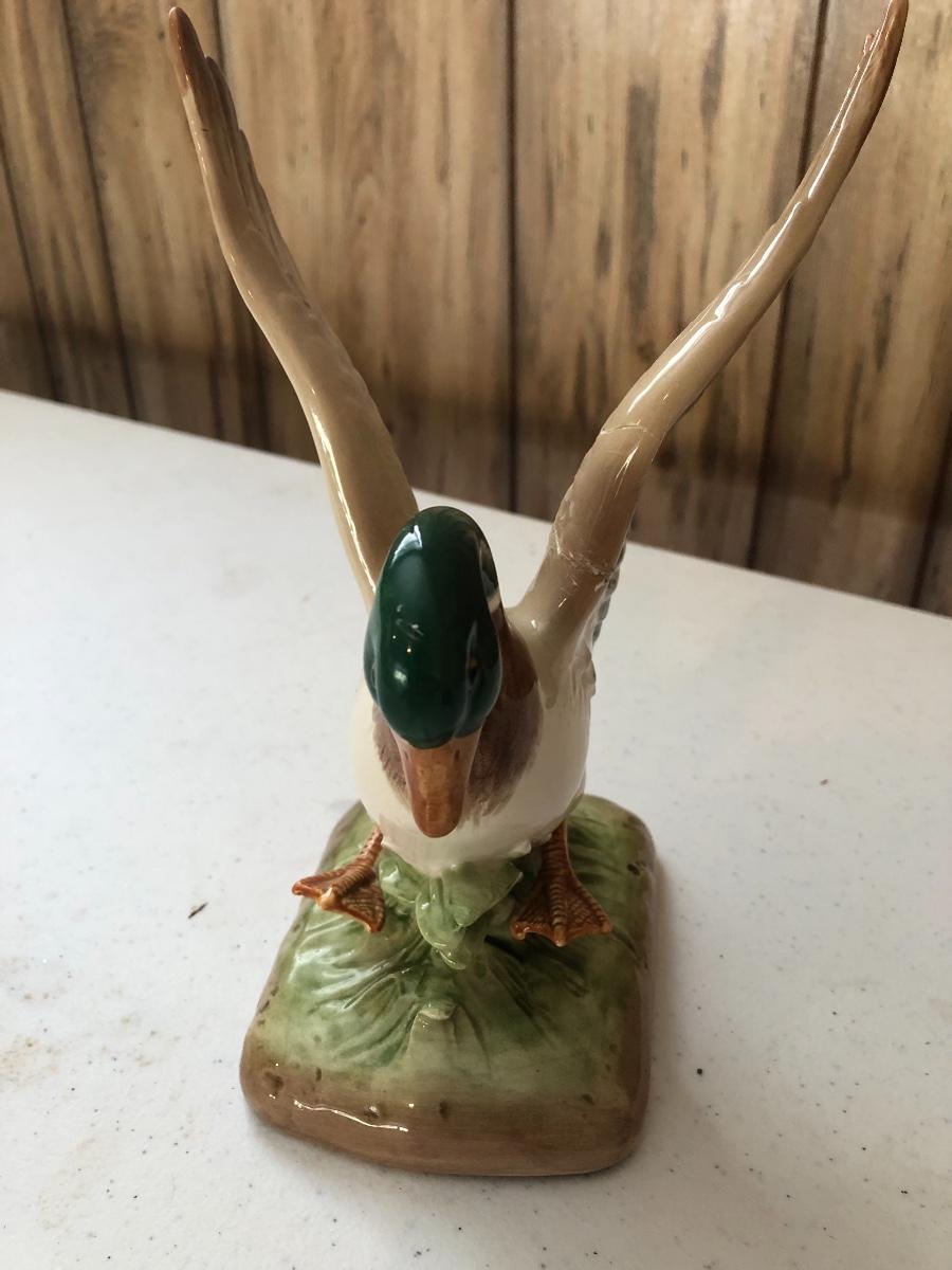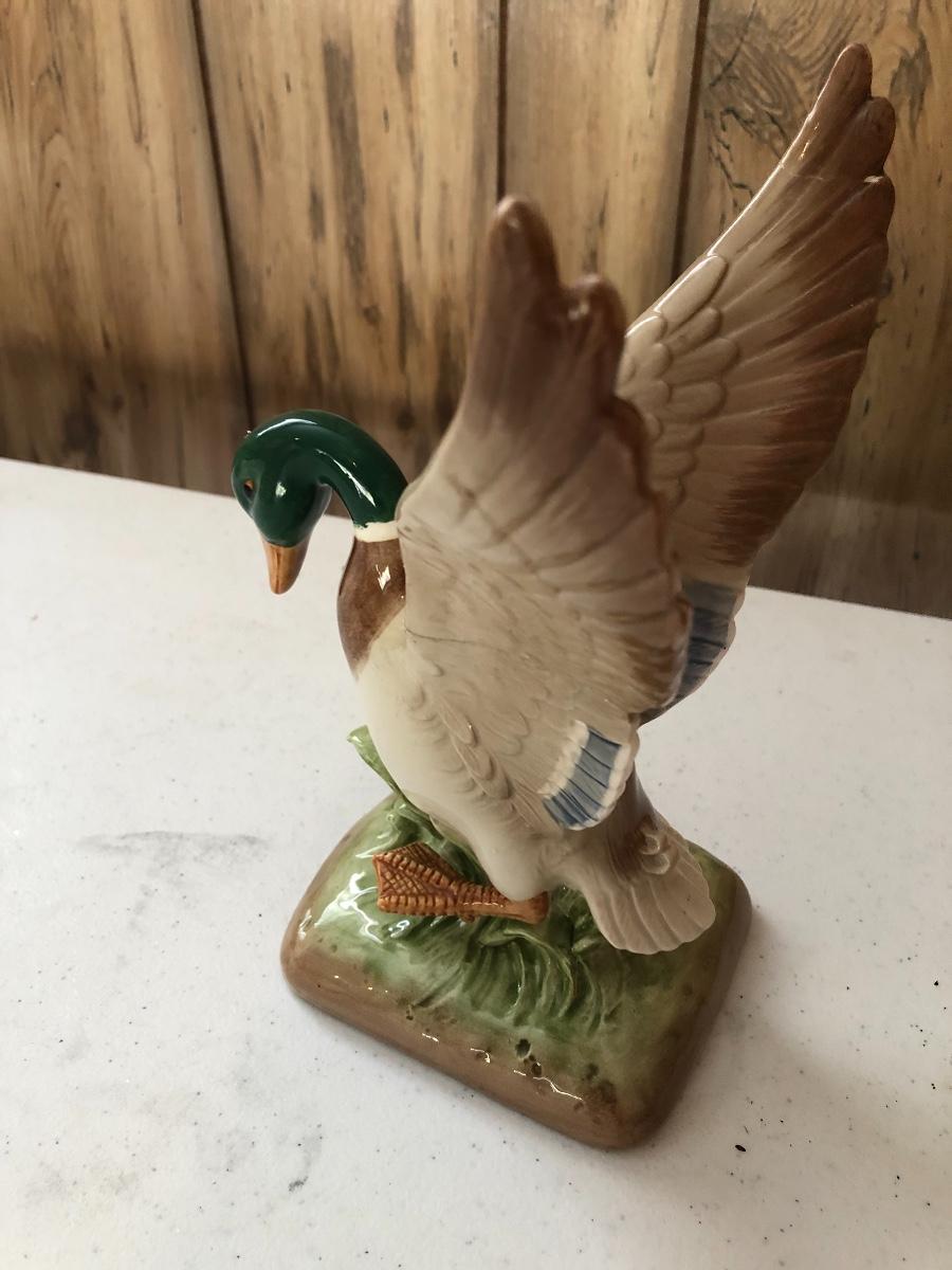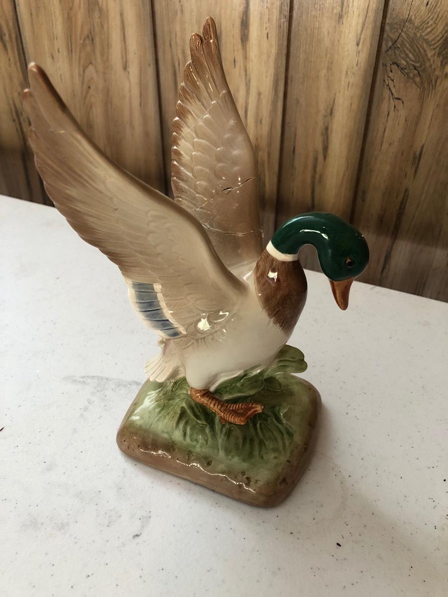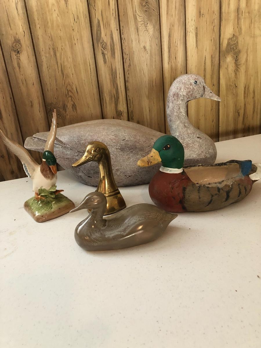 This lot includes five ducks. The largest is a white brown plastic duck measuring 22” (bill to tail). The solid brass duck is 6.5” tall. The last three ducks are ceramic. The small brown ceramic duck is 8” (bill to tail). The duck flapping its’ wings has a 4” x 4.5” base and is 9” tall. The duck planter is 12.5” (bill to tail). Shipping Available.