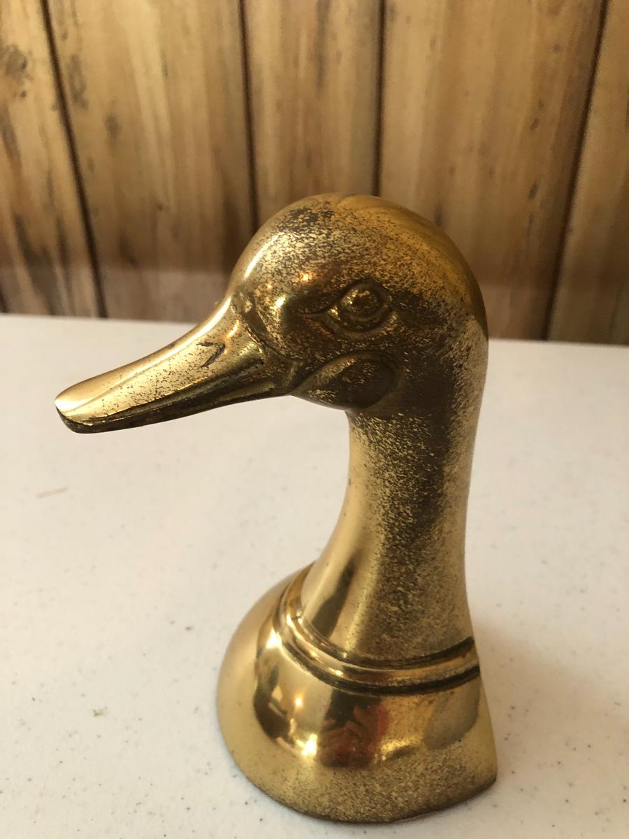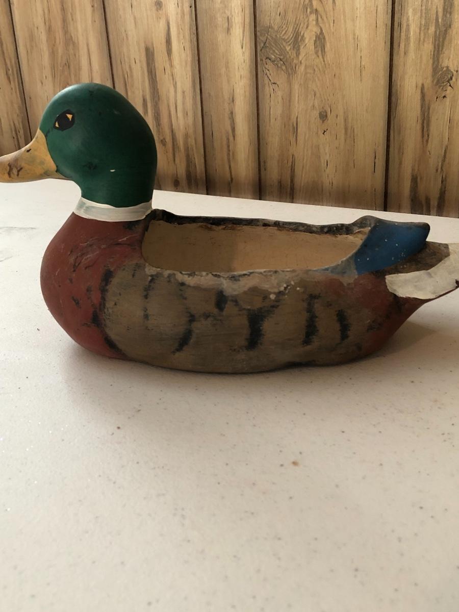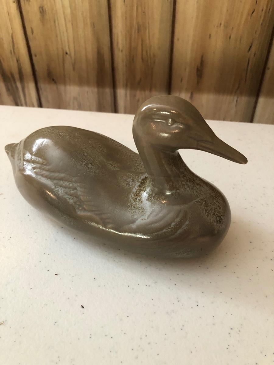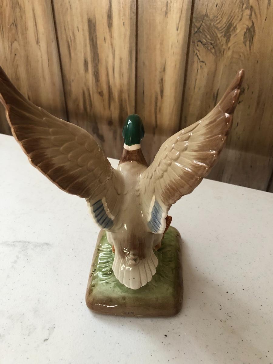This lot includes five ducks. The largest is a white brown plastic duck measuring 22” (bill to tail). The solid brass duck is 6.5” tall. The last three ducks are ceramic. The small brown ceramic duck is 8” (bill to tail). The duck flapping its’ wings has a 4” x 4.5” base and is 9” tall. The duck planter is 12.5” (bill to tail). Shipping Available.