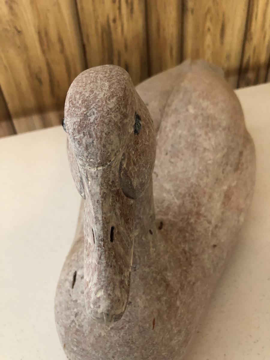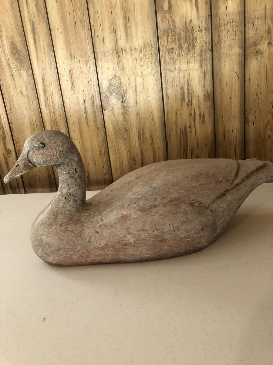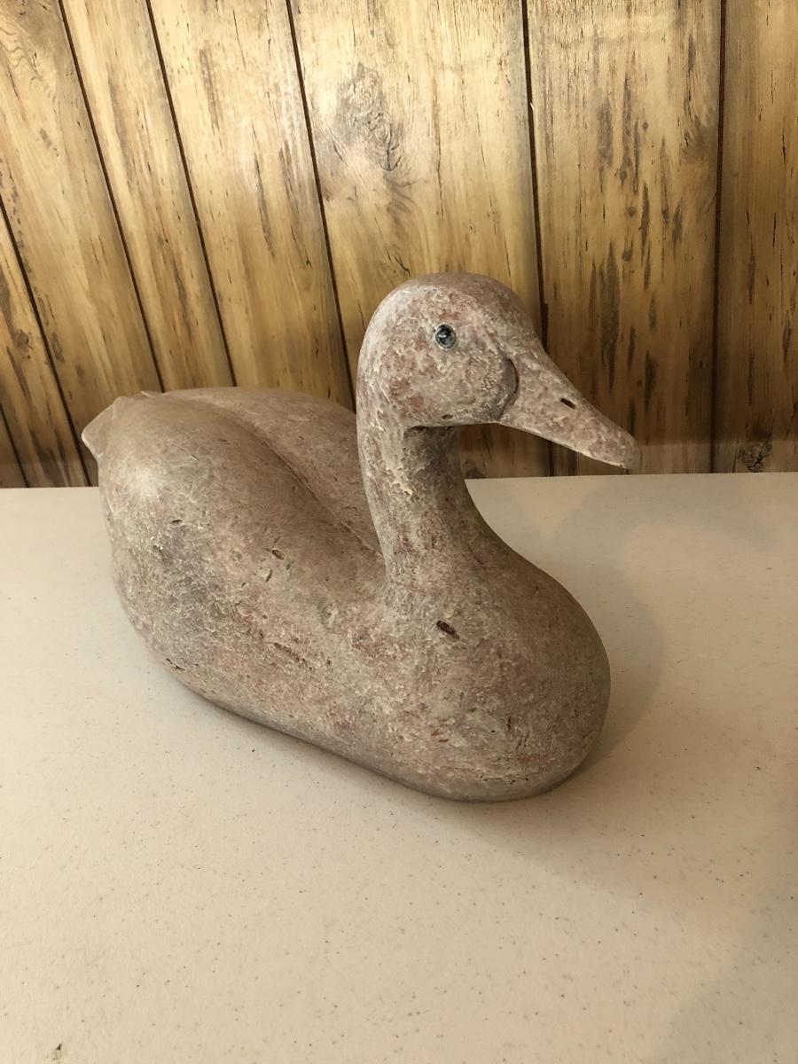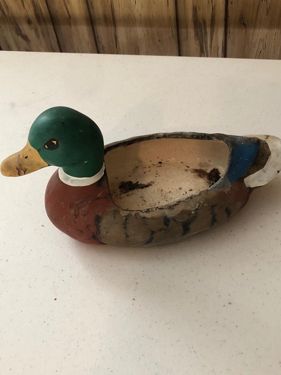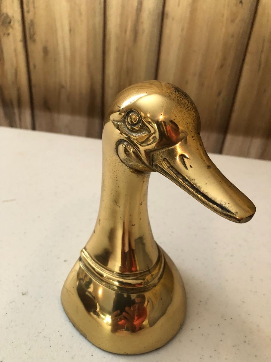 This lot includes five ducks. The largest is a white brown plastic duck measuring 22” (bill to tail). The solid brass duck is 6.5” tall. The last three ducks are ceramic. The small brown ceramic duck is 8” (bill to tail). The duck flapping its’ wings has a 4” x 4.5” base and is 9” tall. The duck planter is 12.5” (bill to tail). Shipping Available.