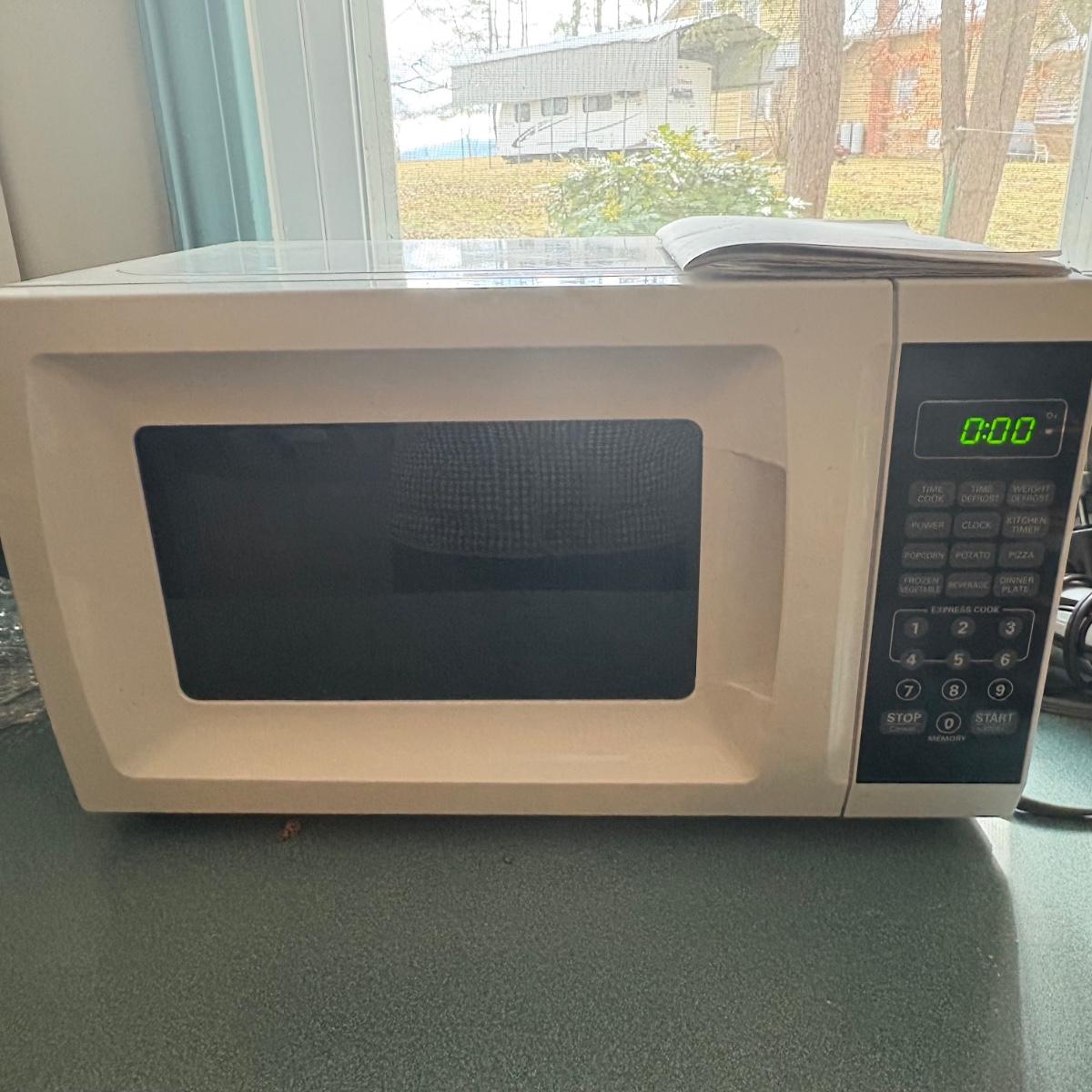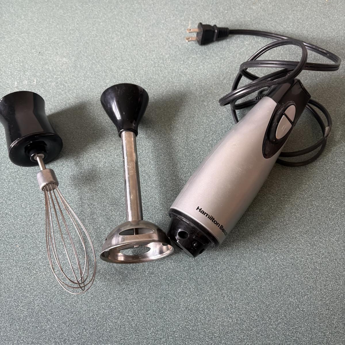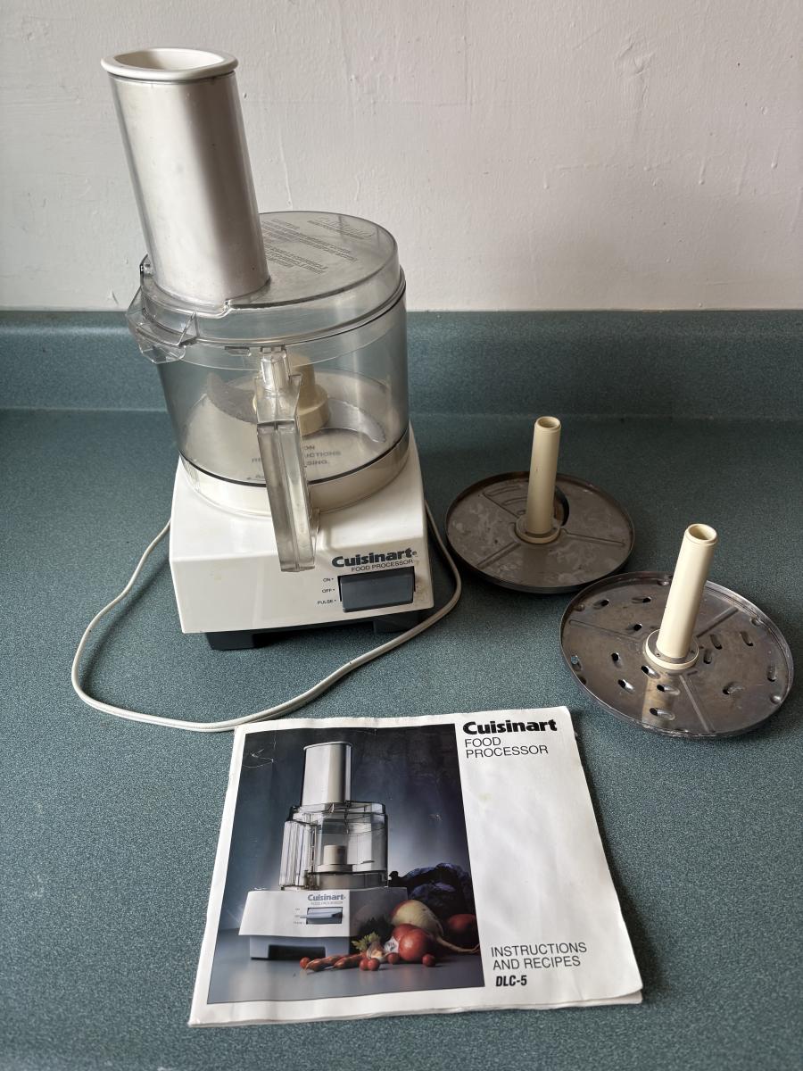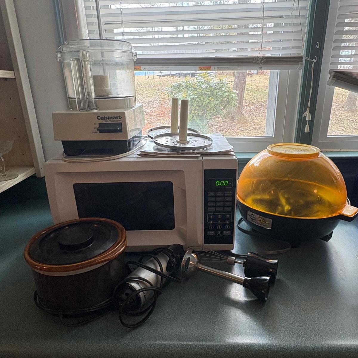 Cuisinart food processor w/chopping, slicing, and grating blades. Slicing blade needs some TLC. Mainstays 700-watt microwave oven measures 17” x 11.5” x 10H. Rival Crockette one-quart slow cooker. West Bend six-quart corn popper. Hamilton Beach hand blender w/chopper and whisk attachments. All powered on when plugged in.
