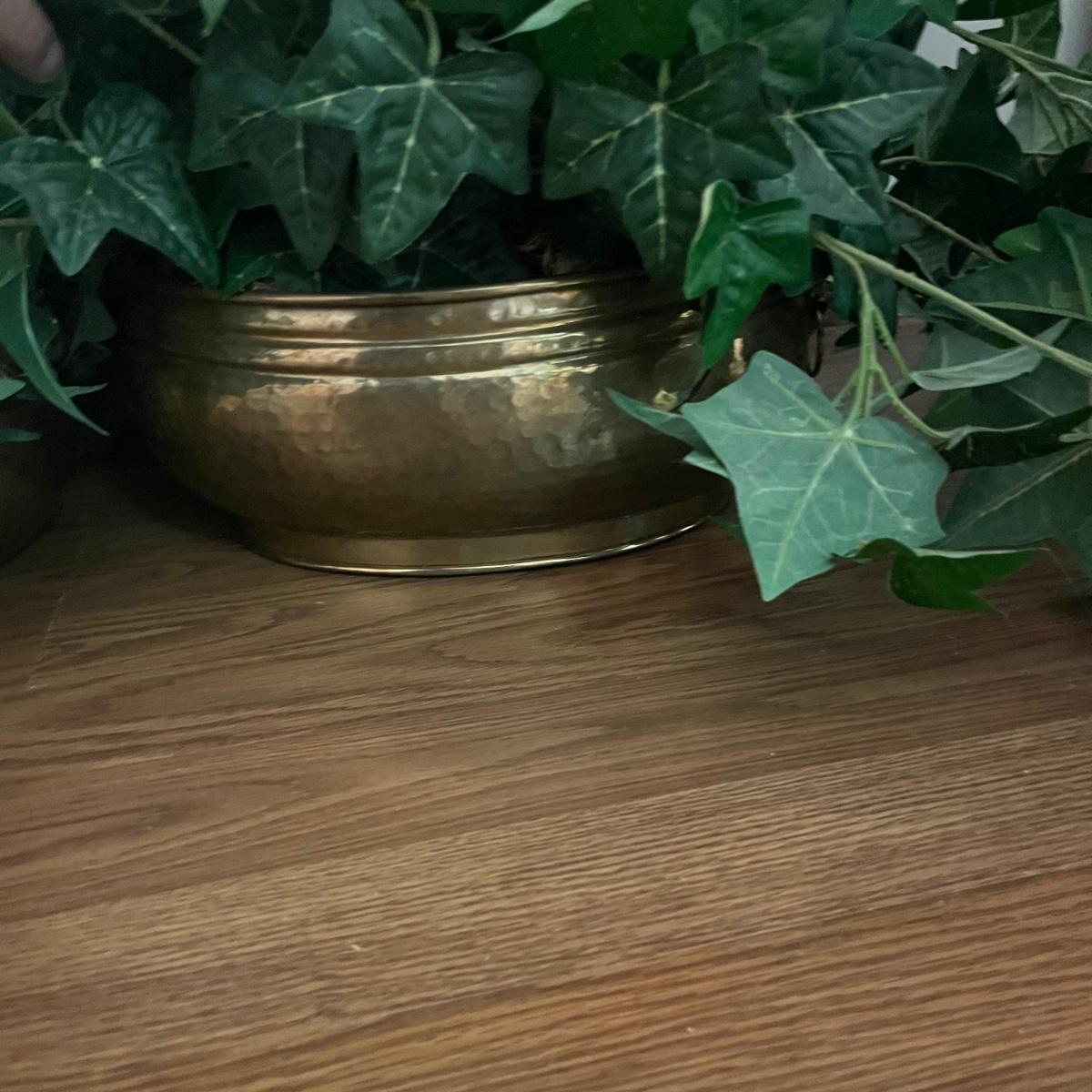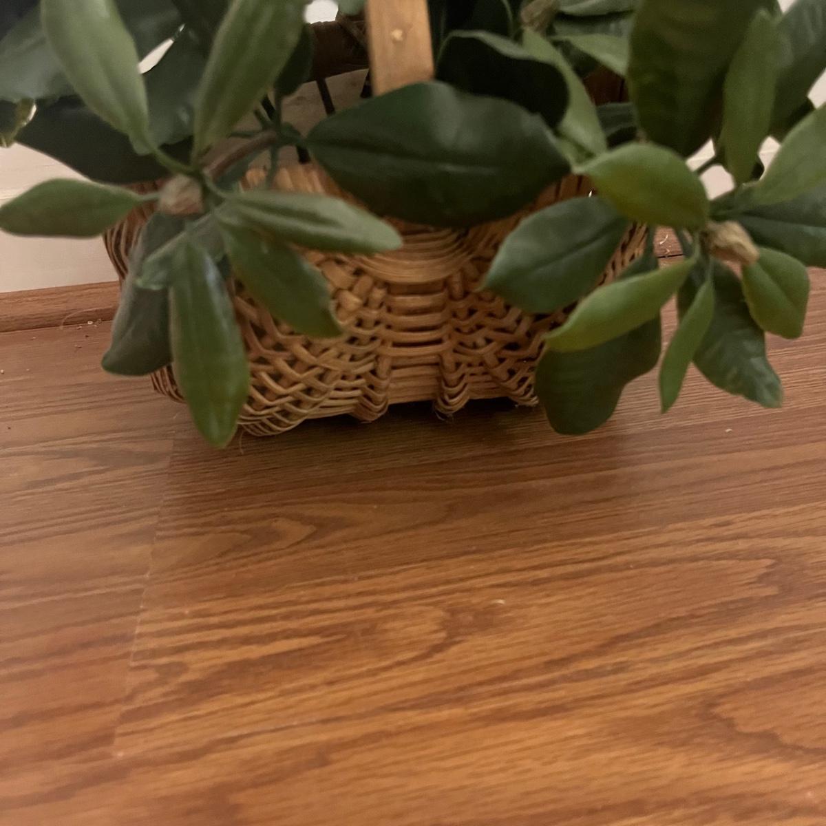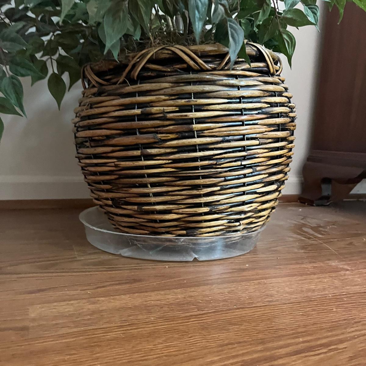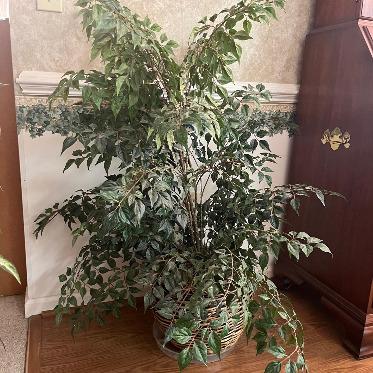 Lot includes five faux house plants. Two have brass pots, two have woven pots and one has a ceramic pot. Largest plant measures 38”D x 45”H.