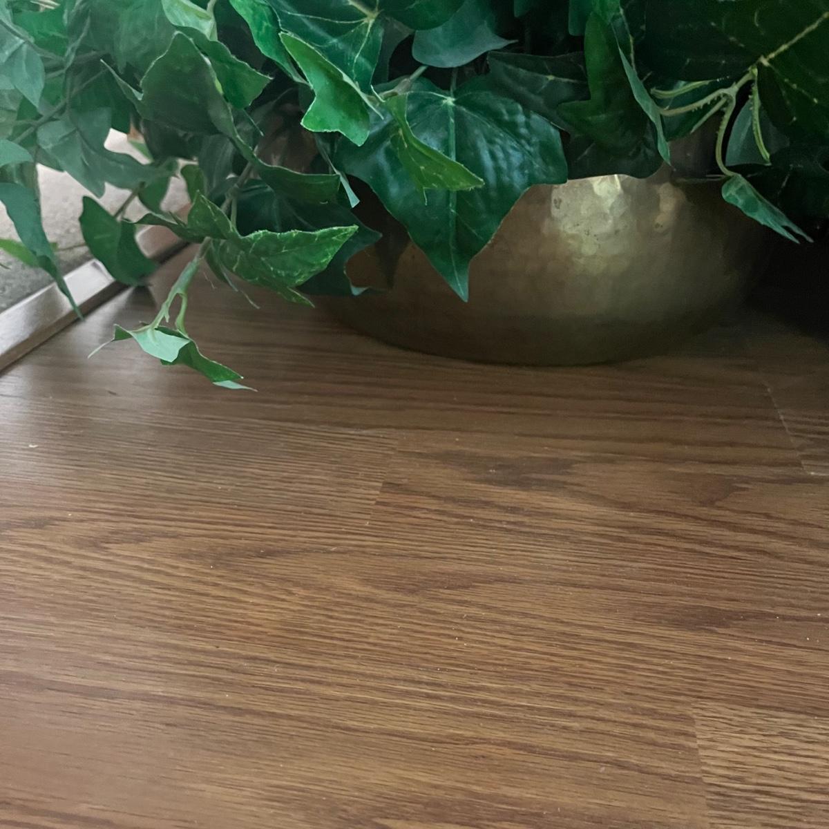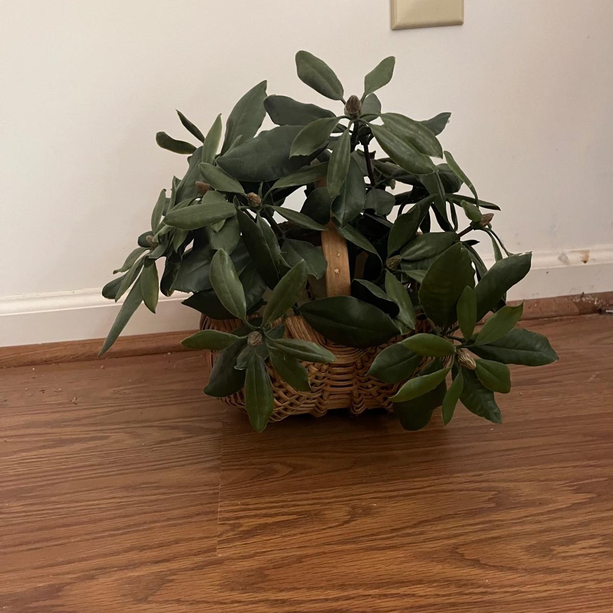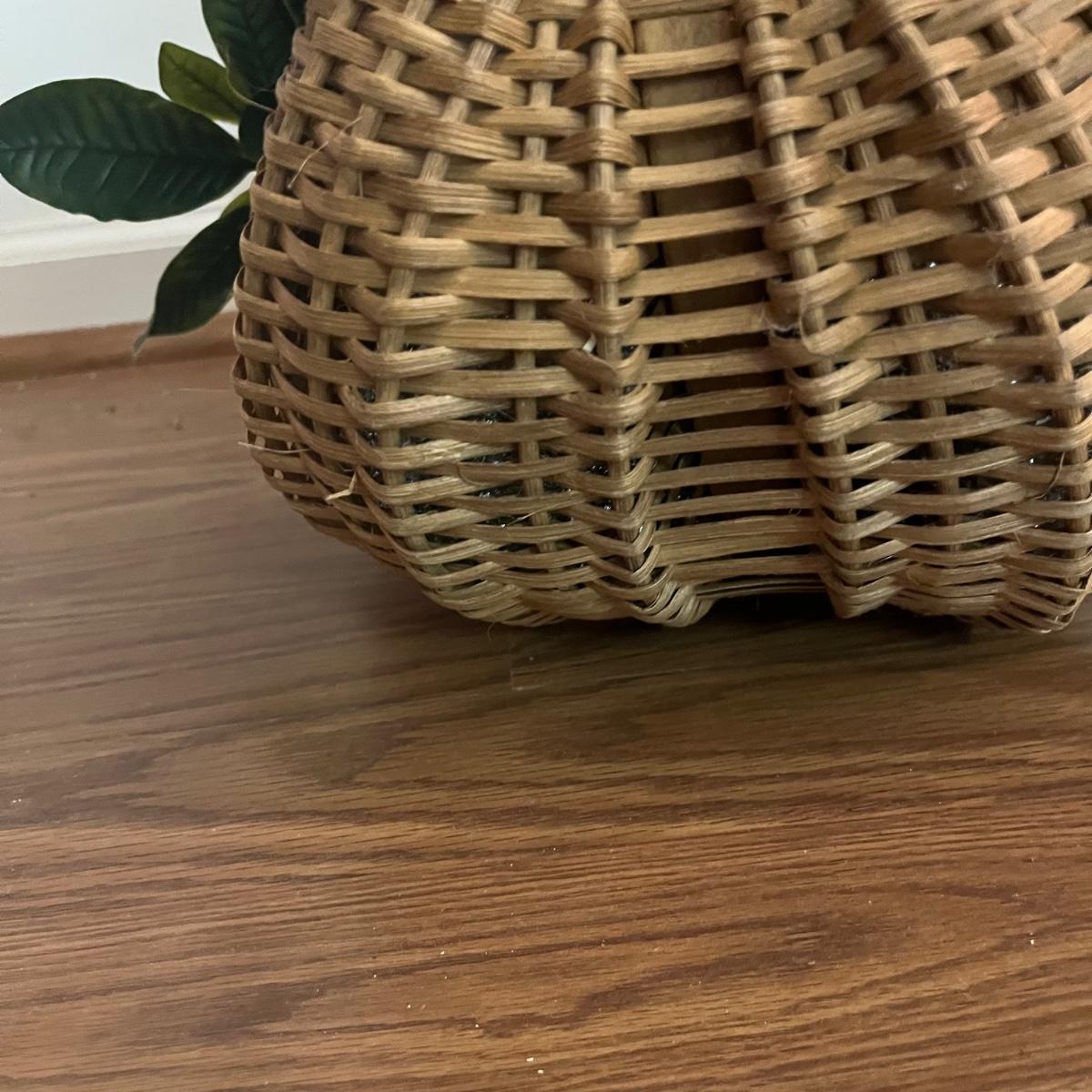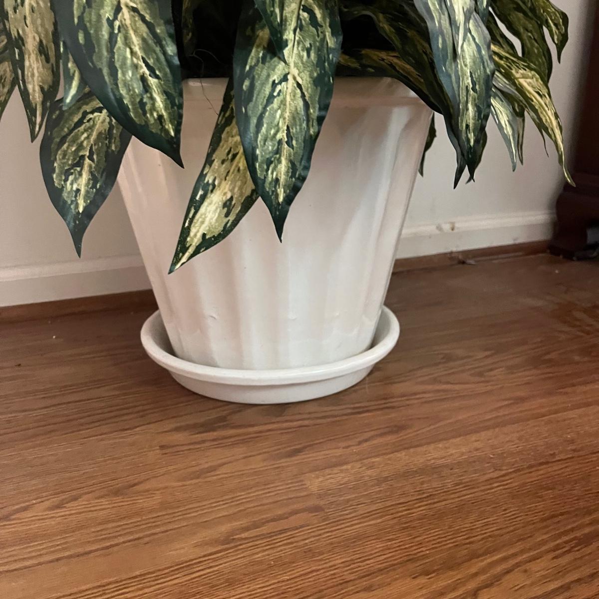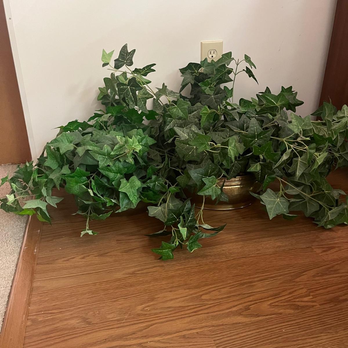 Lot includes five faux house plants. Two have brass pots, two have woven pots and one has a ceramic pot. Largest plant measures 38”D x 45”H.