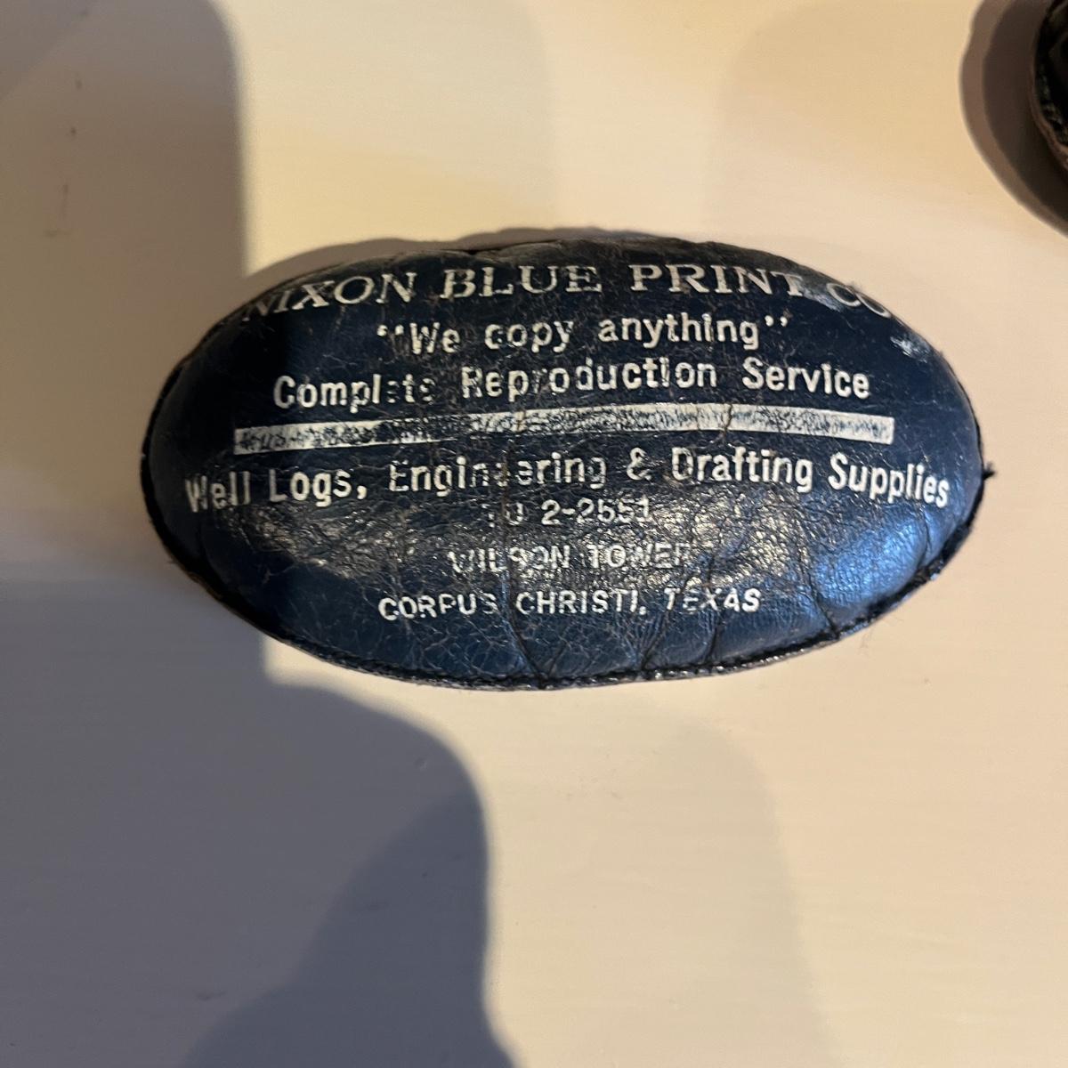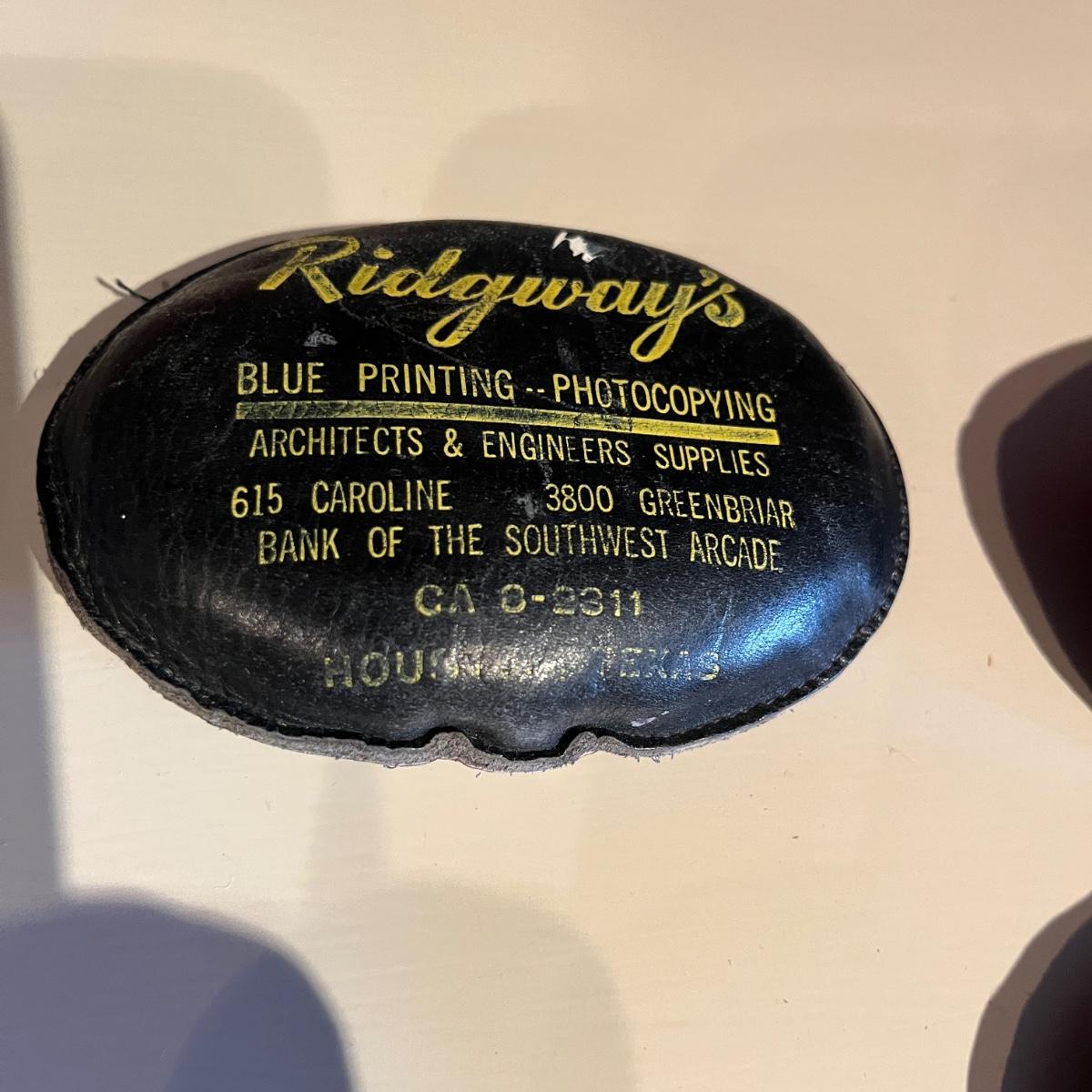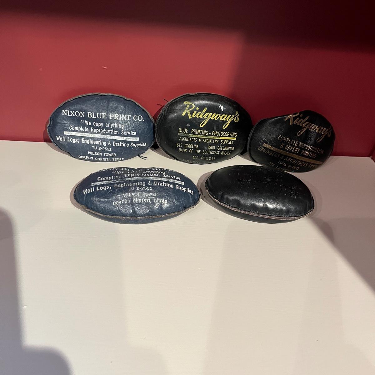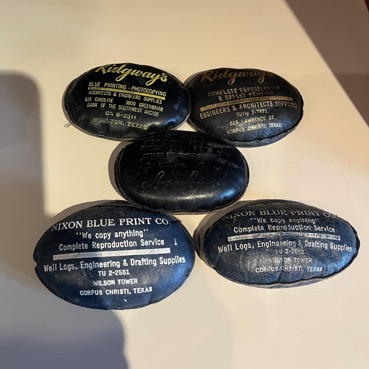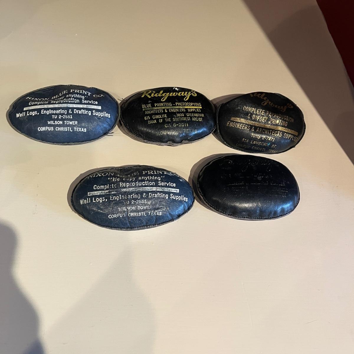 Lot contains five field blueprint weights with two by Nixon and three Ridgways. Largest weight measures 4” x 1” x 3”H.