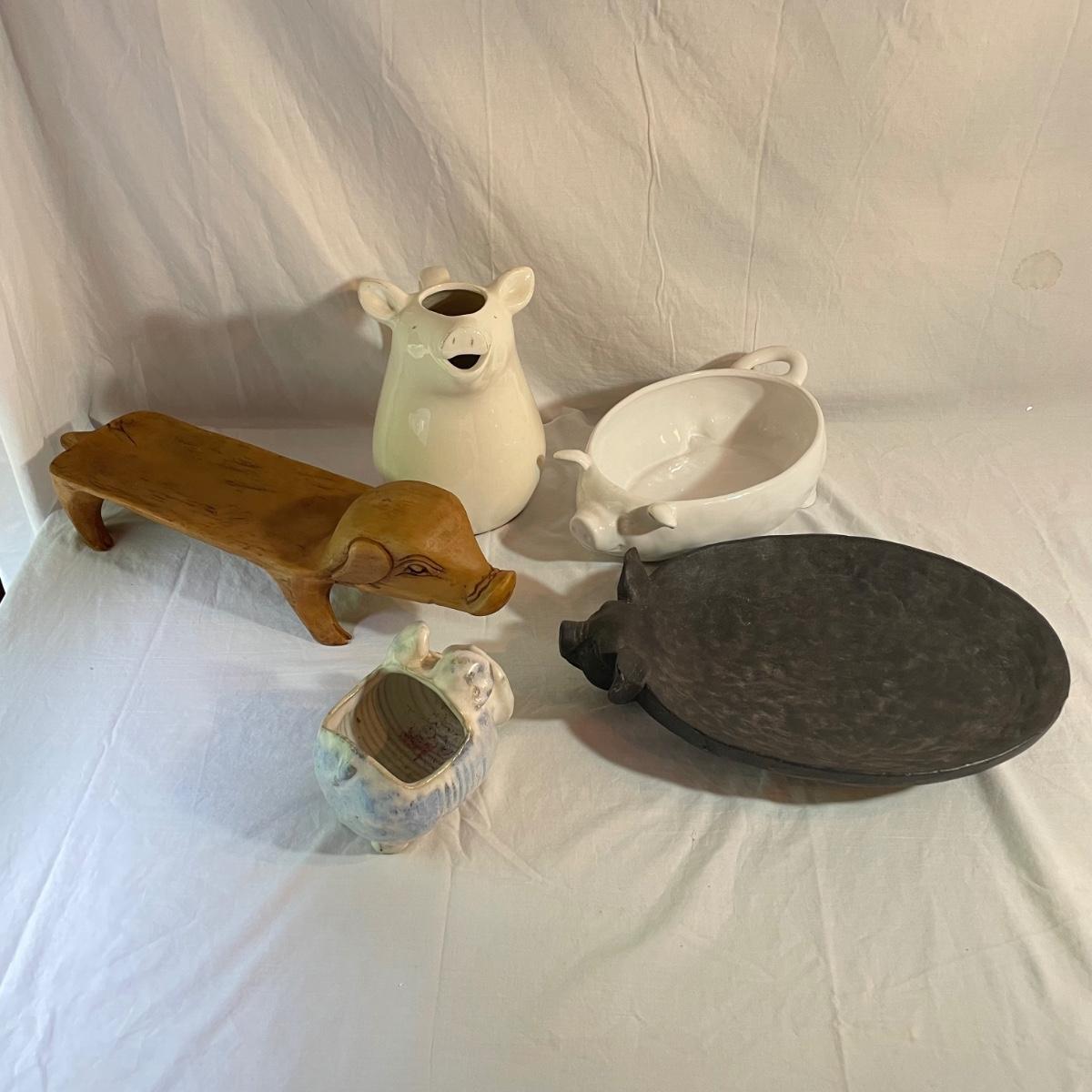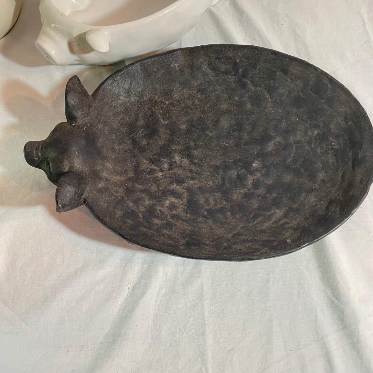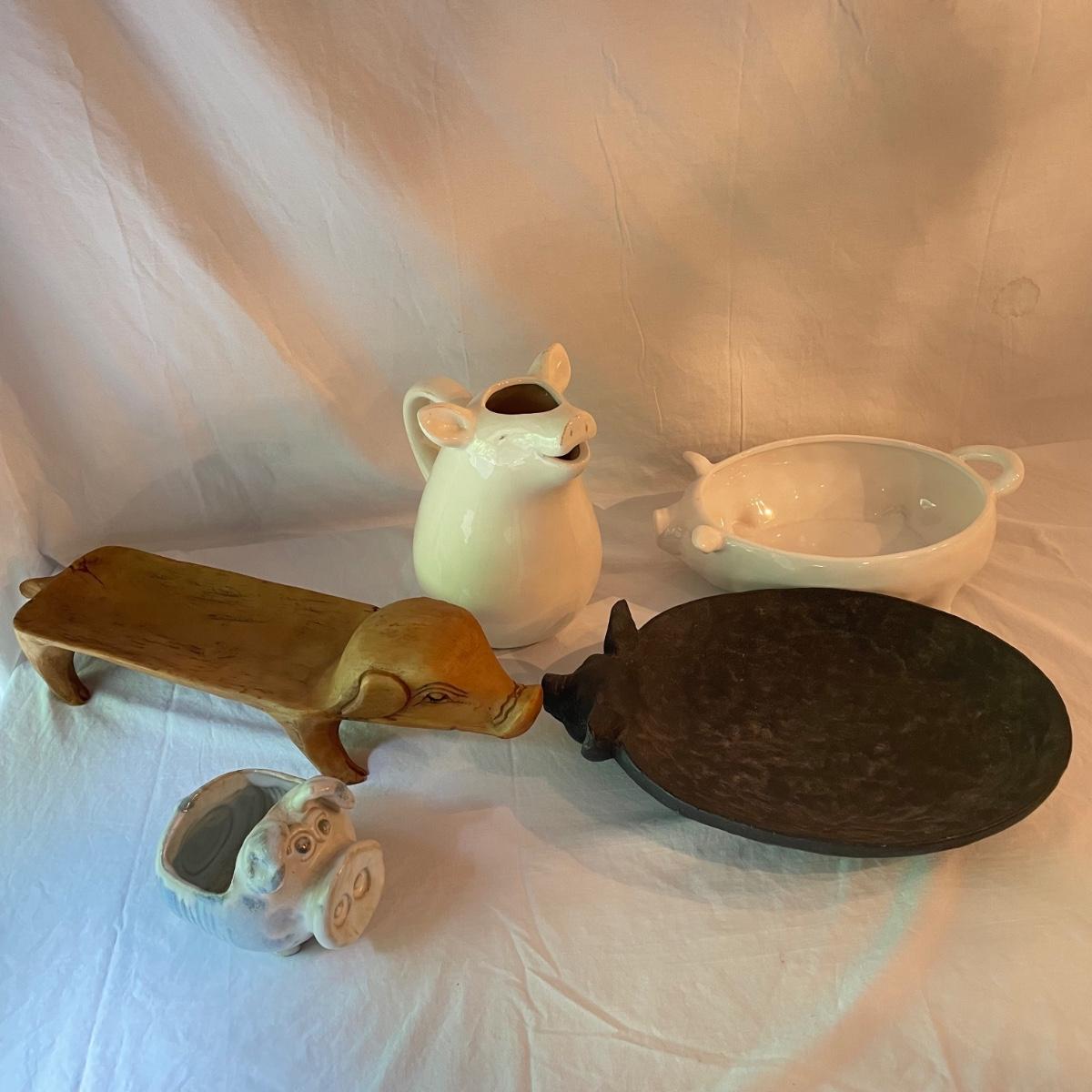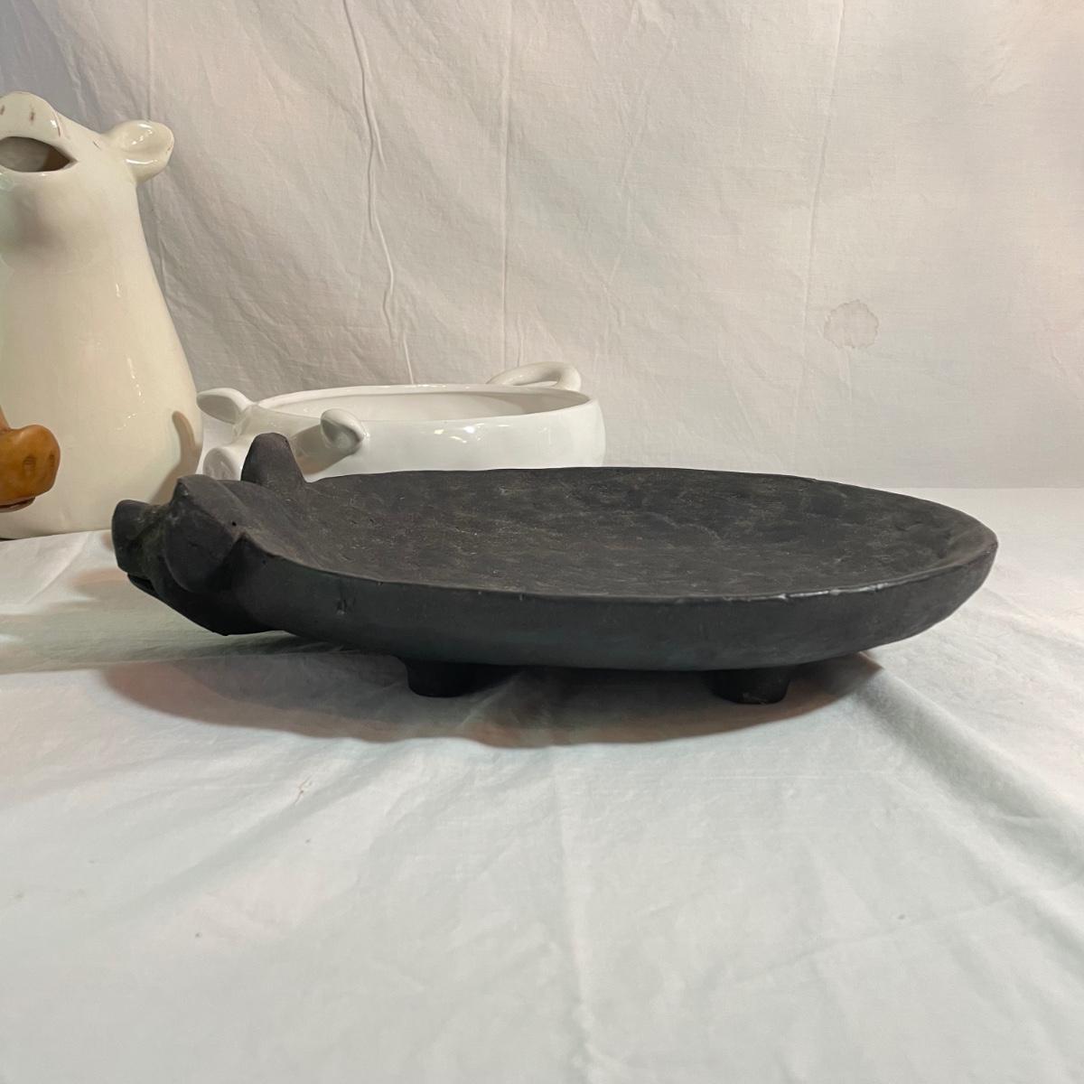 A sweet set of five unique pig dishes and decor. The blueish open-topped ceramic pig likely held pens or markers at some point, the specks inside appear to be ink. The fun pig pitcher shows some crackling and is marked “food safe”. Lot also features a carved wooden tray and a white ceramic bowl from Creative Co-Op. The black pig dish looks like cast iron, but it’s much lighter and likely resin-based. The black pig is 15” x 10” x 2.75”H. Shipping available.