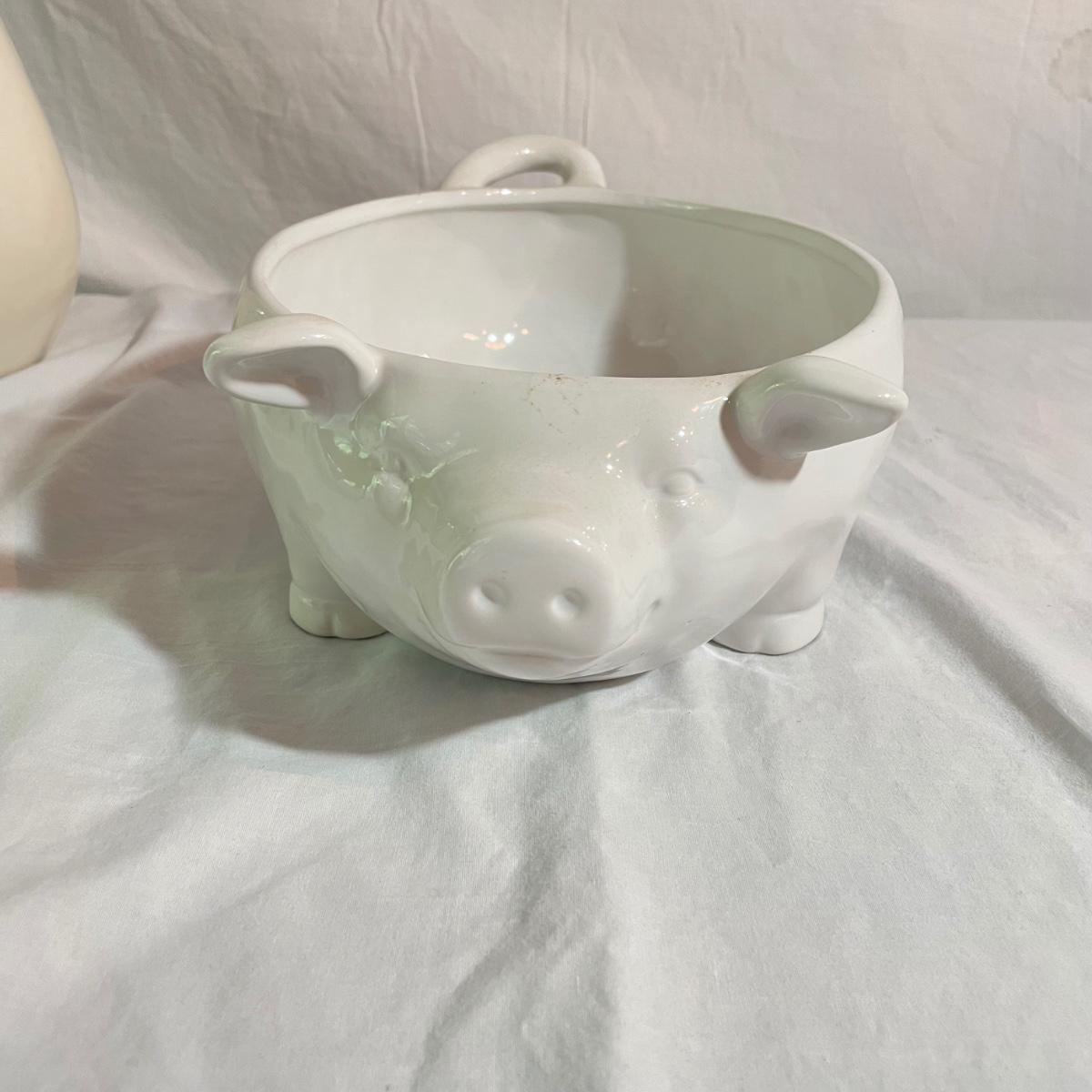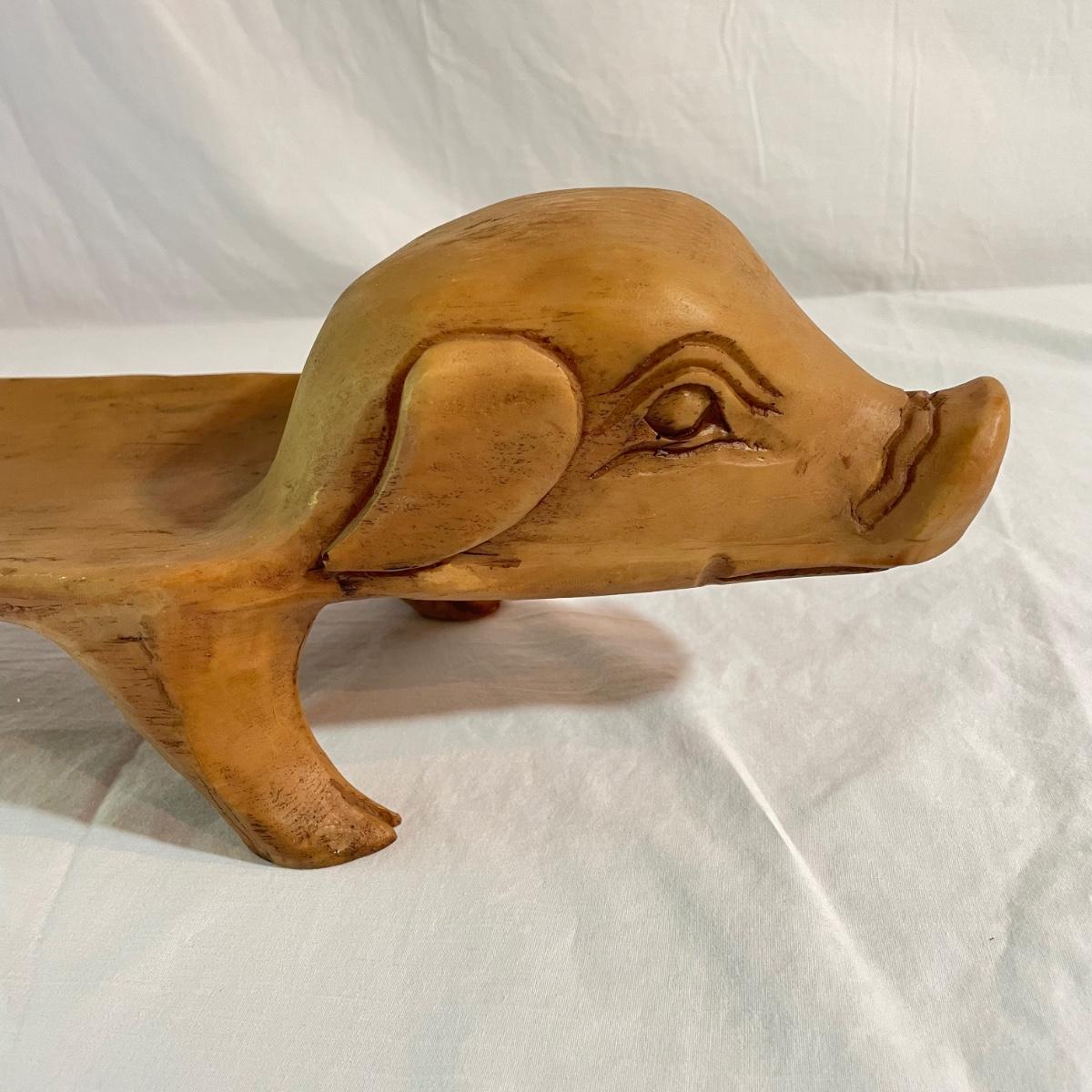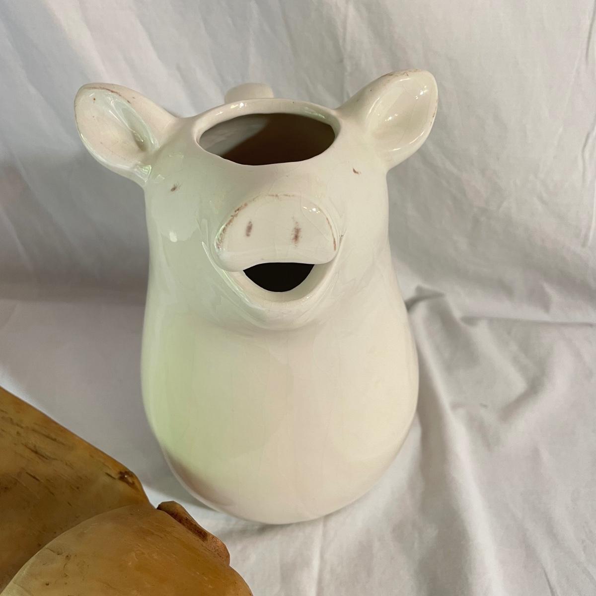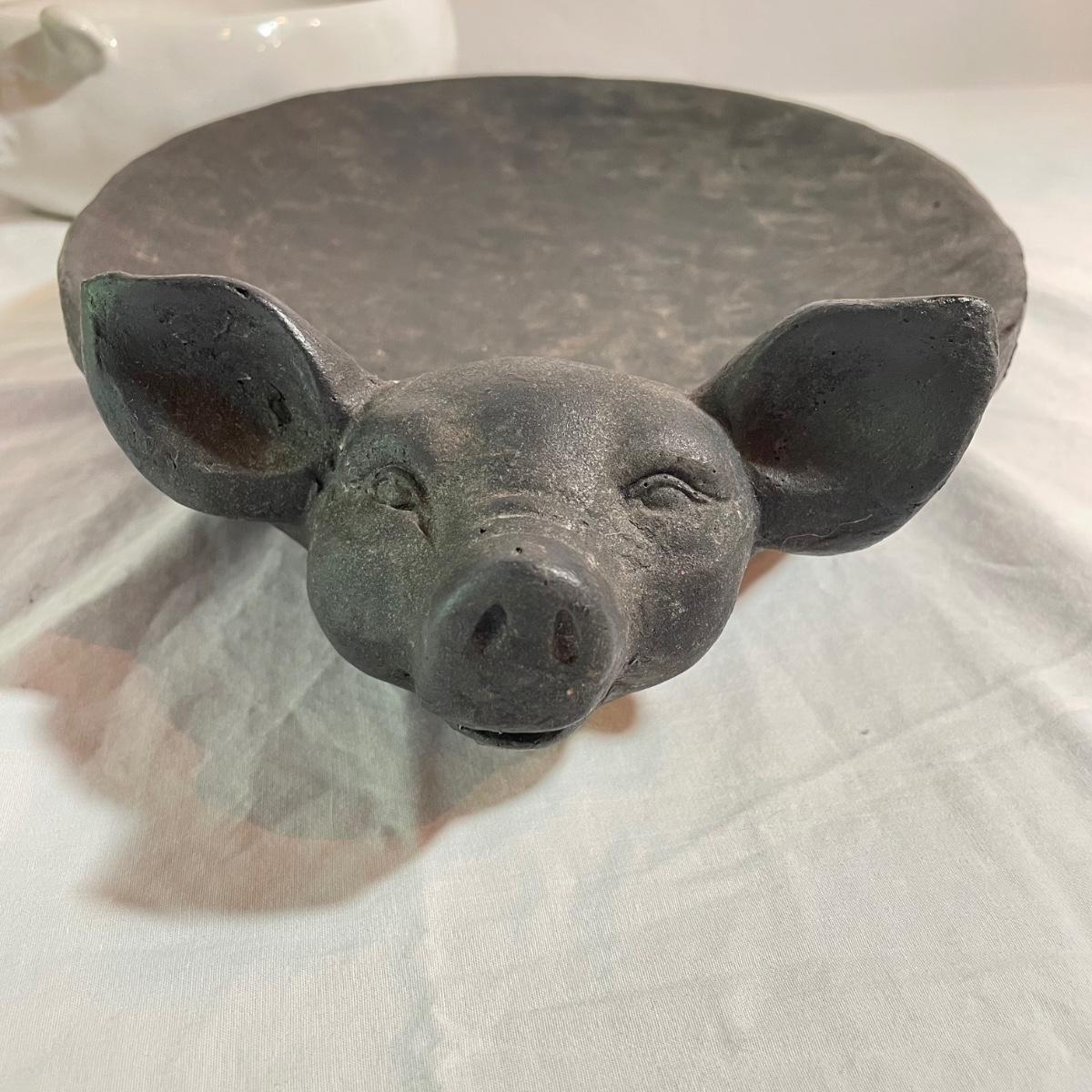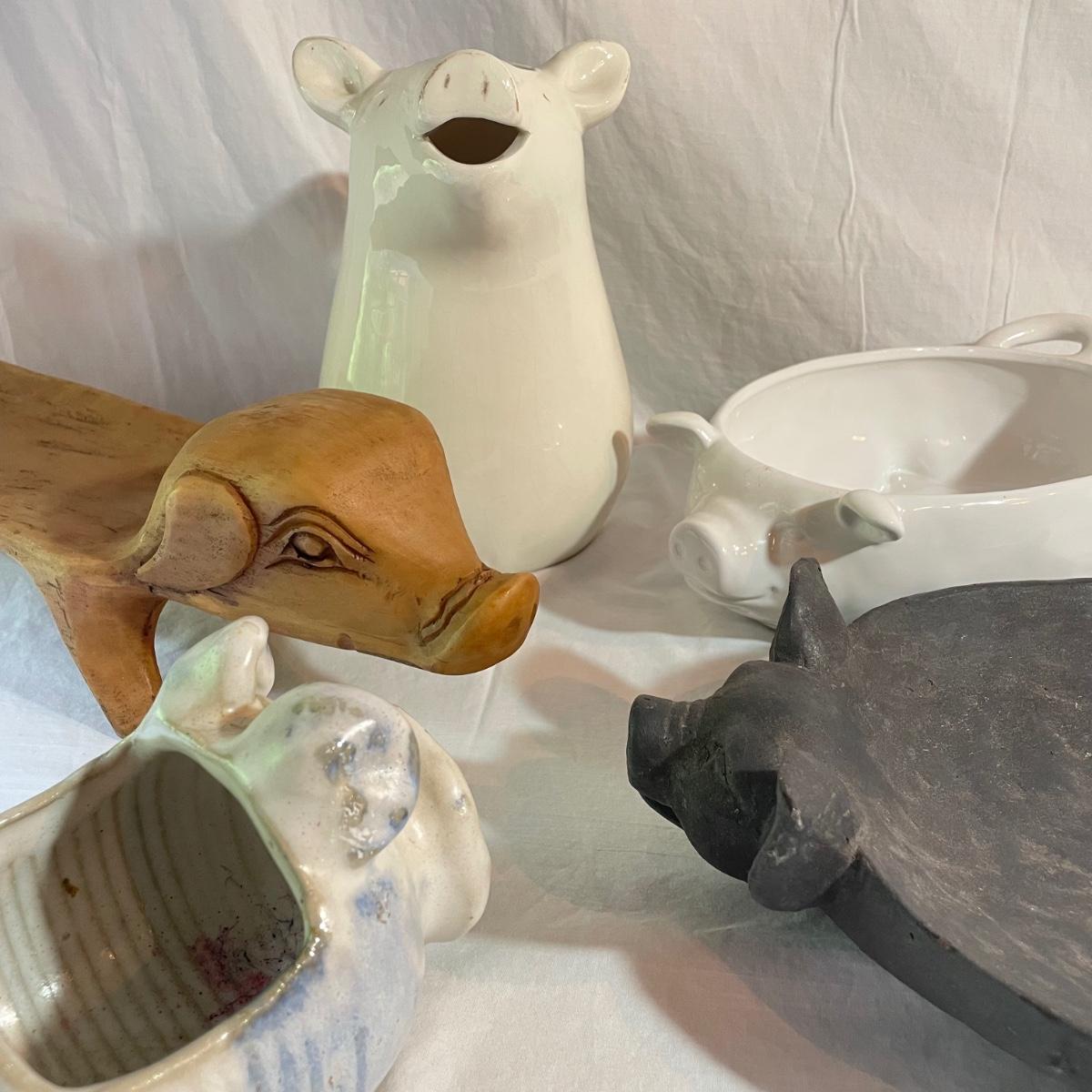 A sweet set of five unique pig dishes and decor. The blueish open-topped ceramic pig likely held pens or markers at some point, the specks inside appear to be ink. The fun pig pitcher shows some crackling and is marked “food safe”. Lot also features a carved wooden tray and a white ceramic bowl from Creative Co-Op. The black pig dish looks like cast iron, but it’s much lighter and likely resin-based. The black pig is 15” x 10” x 2.75”H. Shipping available.