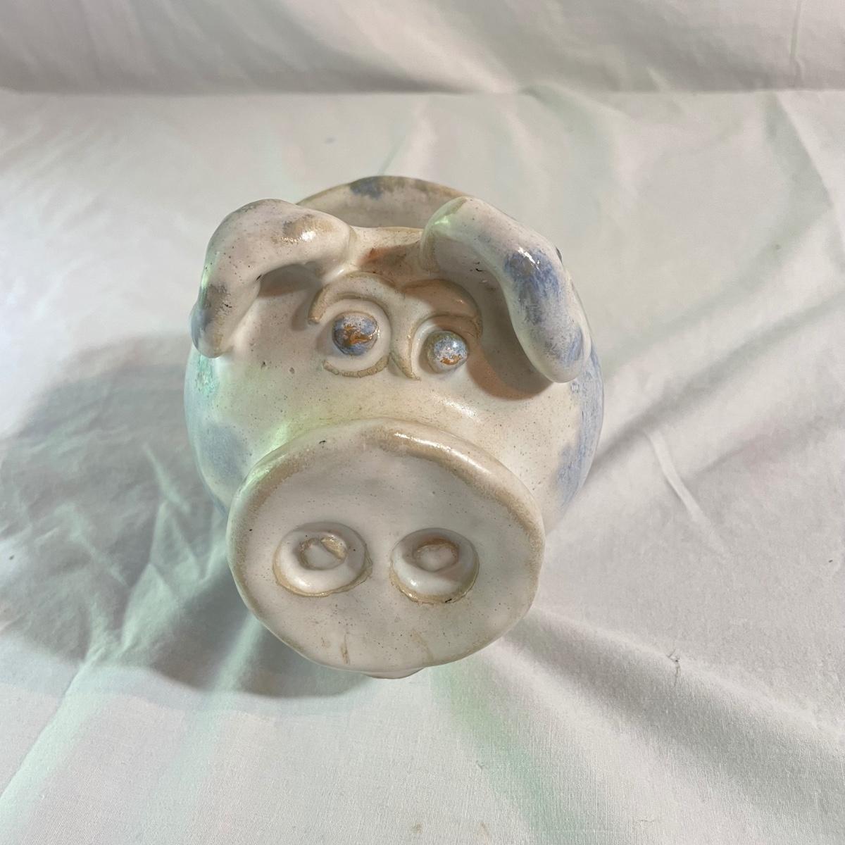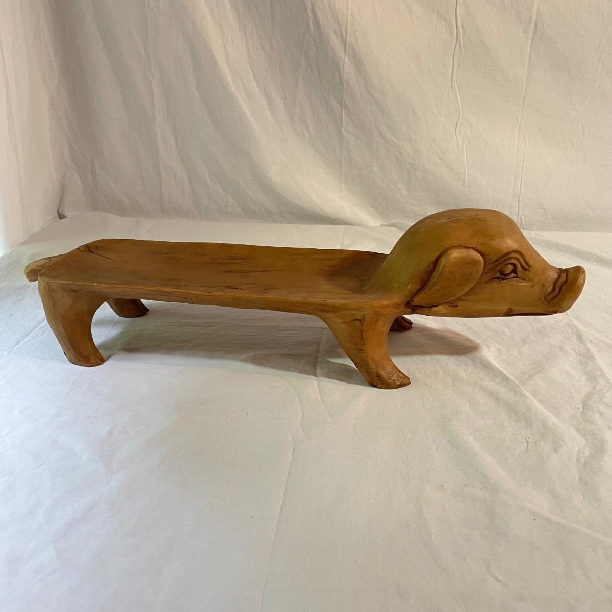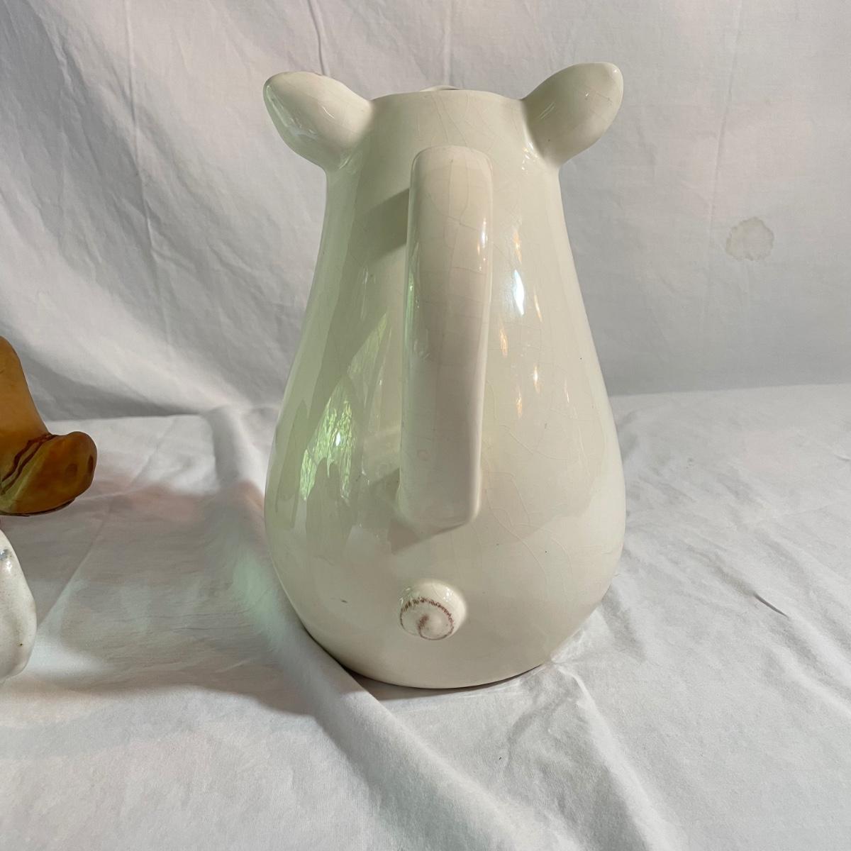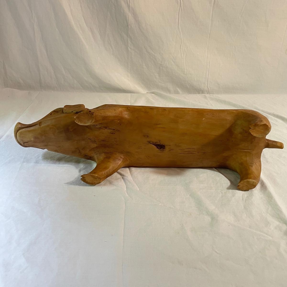 A sweet set of five unique pig dishes and decor. The blueish open-topped ceramic pig likely held pens or markers at some point, the specks inside appear to be ink. The fun pig pitcher shows some crackling and is marked “food safe”. Lot also features a carved wooden tray and a white ceramic bowl from Creative Co-Op. The black pig dish looks like cast iron, but it’s much lighter and likely resin-based. The black pig is 15” x 10” x 2.75”H. Shipping available.