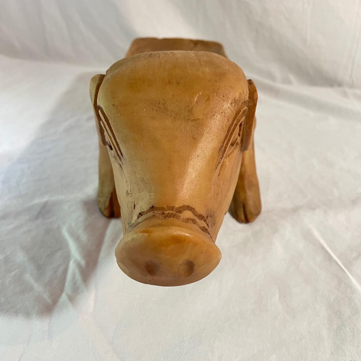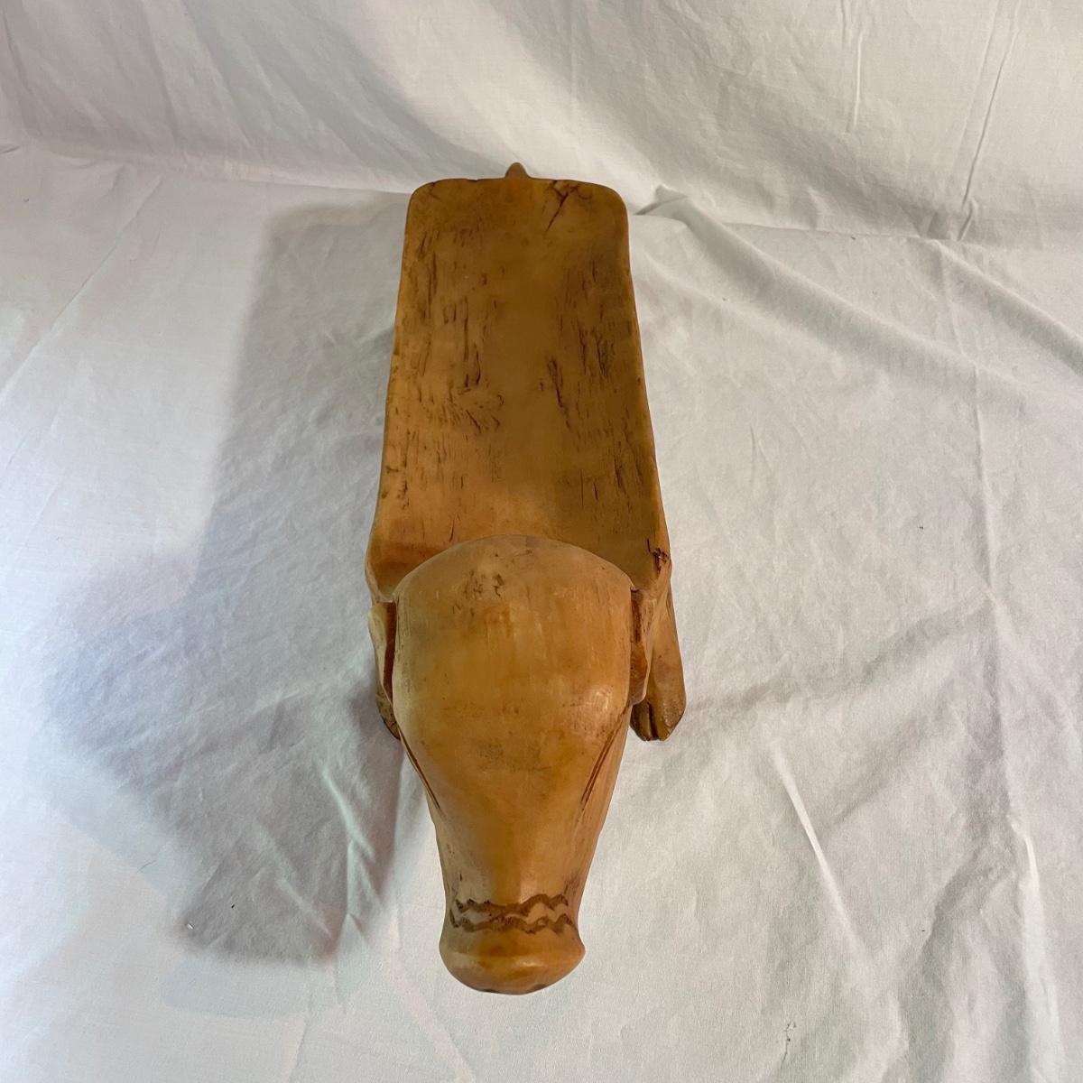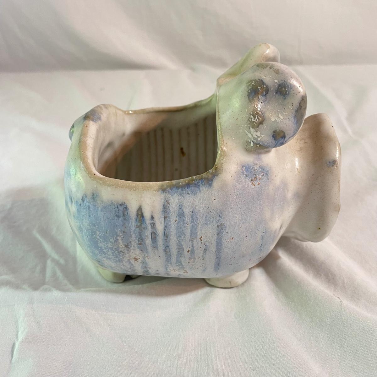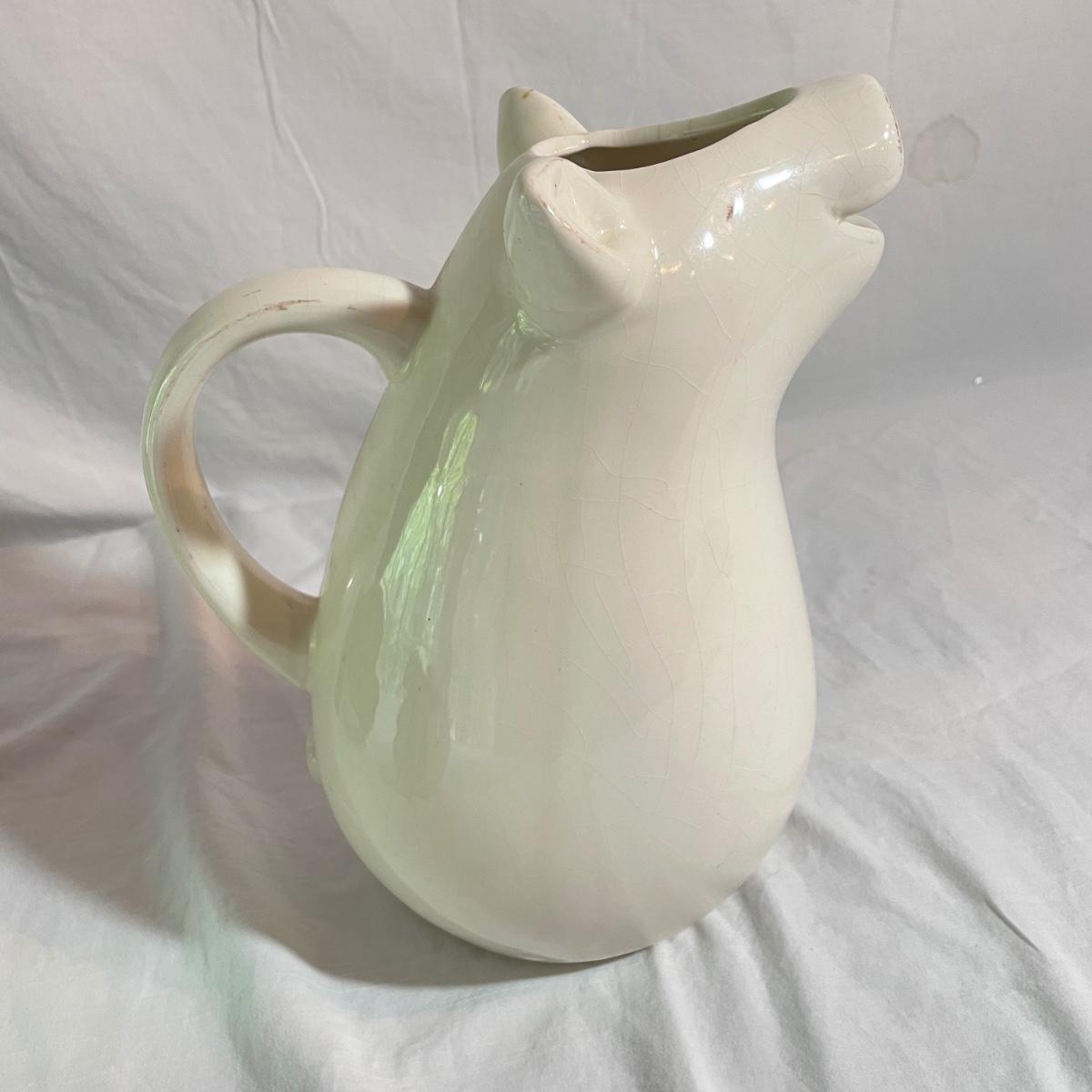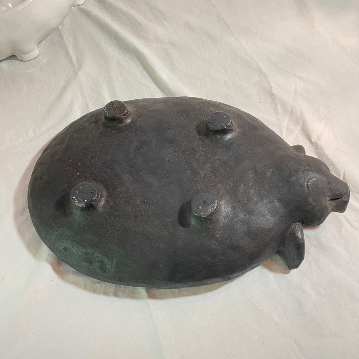A sweet set of five unique pig dishes and decor. The blueish open-topped ceramic pig likely held pens or markers at some point, the specks inside appear to be ink. The fun pig pitcher shows some crackling and is marked “food safe”. Lot also features a carved wooden tray and a white ceramic bowl from Creative Co-Op. The black pig dish looks like cast iron, but it’s much lighter and likely resin-based. The black pig is 15” x 10” x 2.75”H. Shipping available.