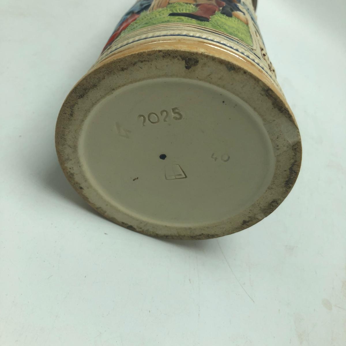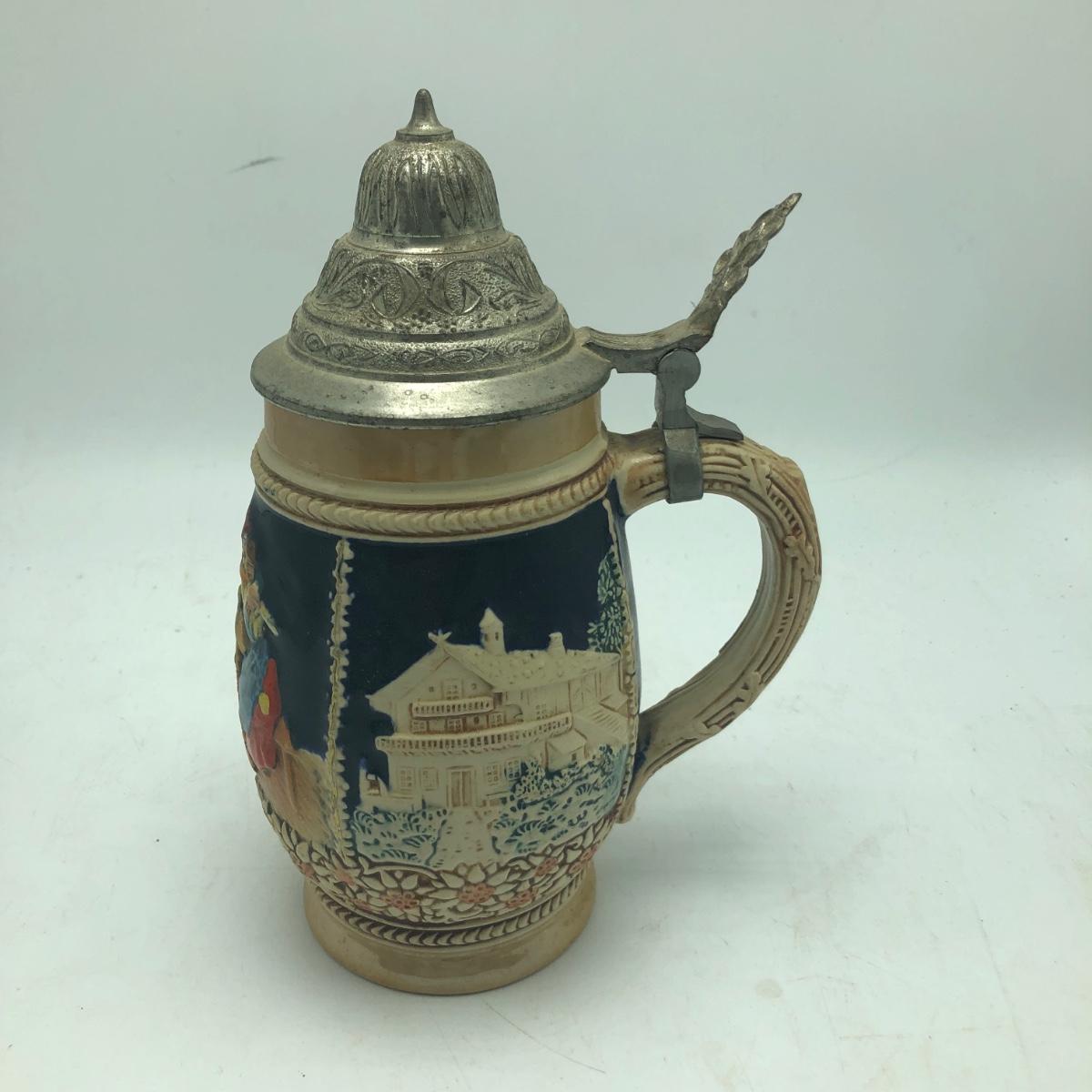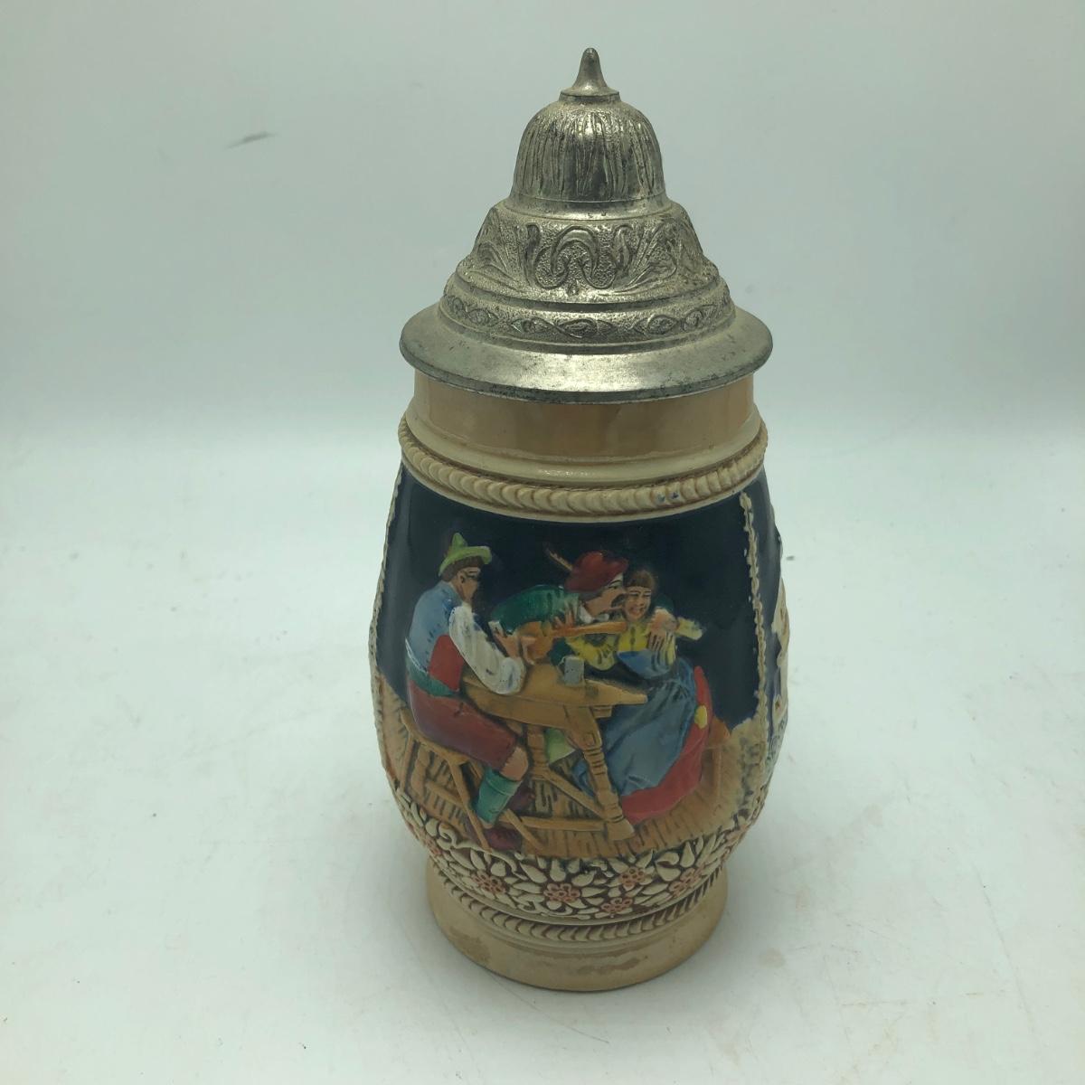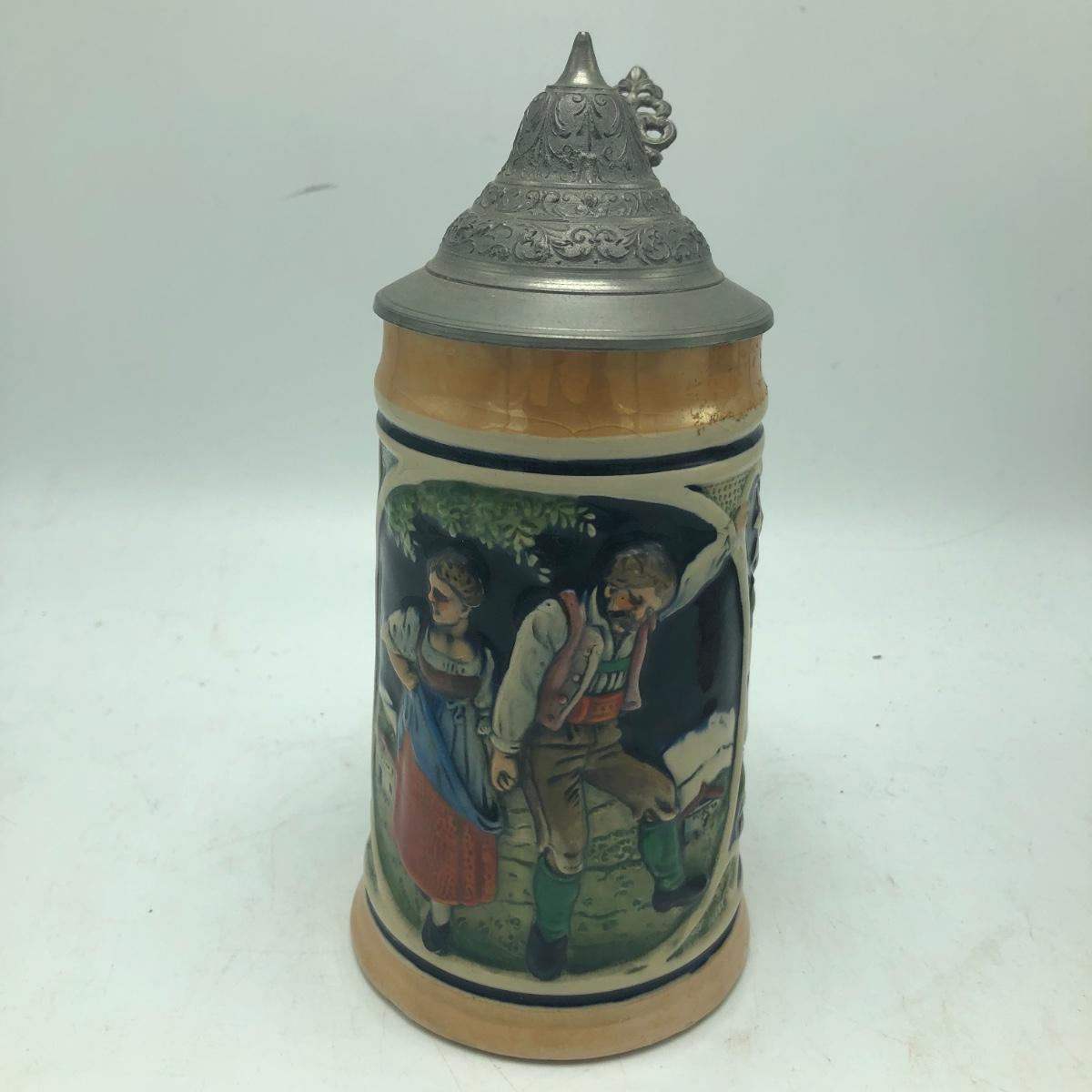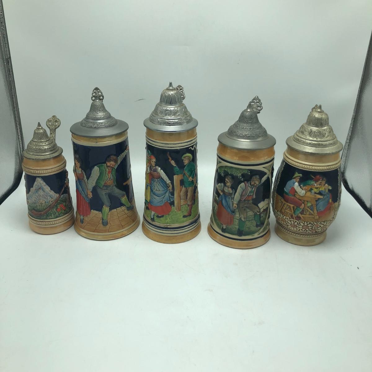 Lot contains five German beer steins that depict German life. Tallest stein measures 3.5” x 5.5” x 9”.