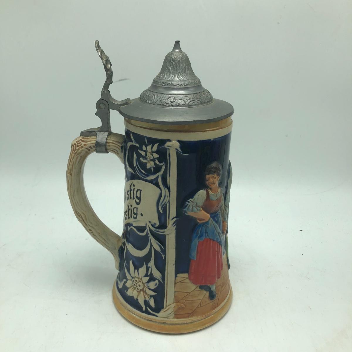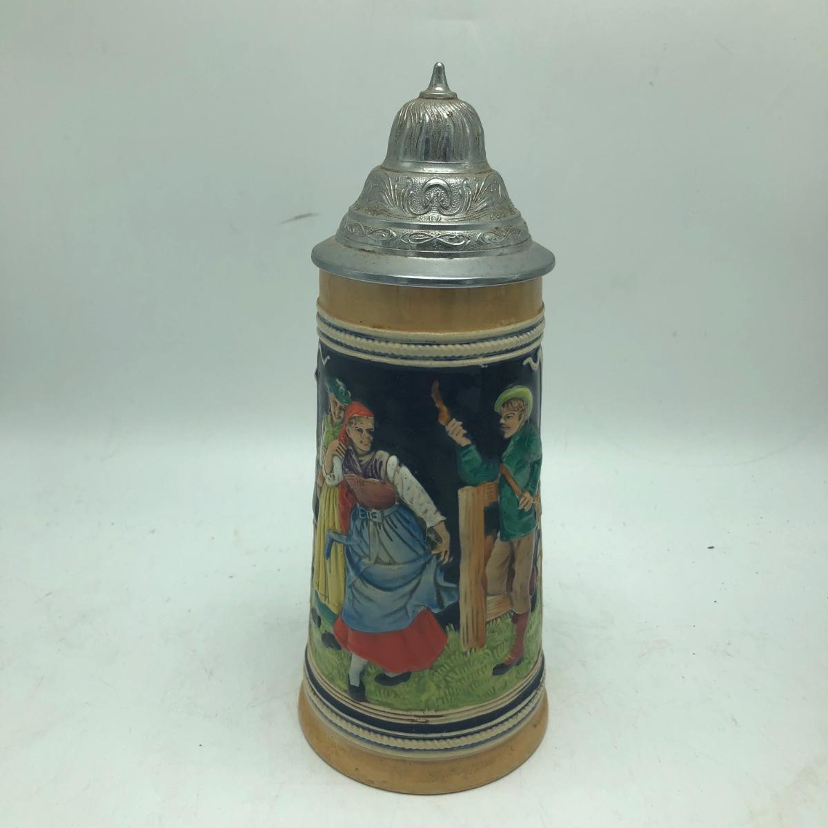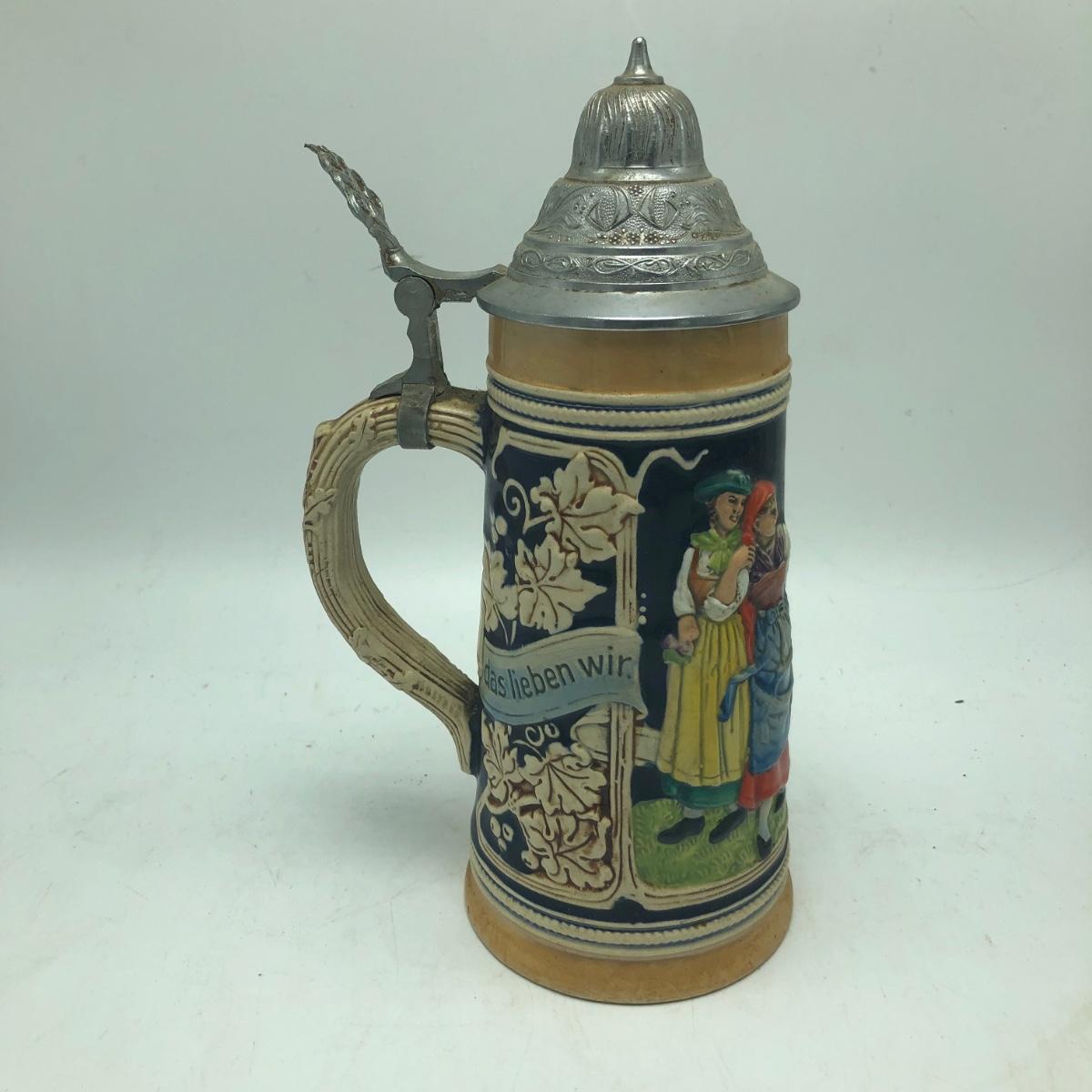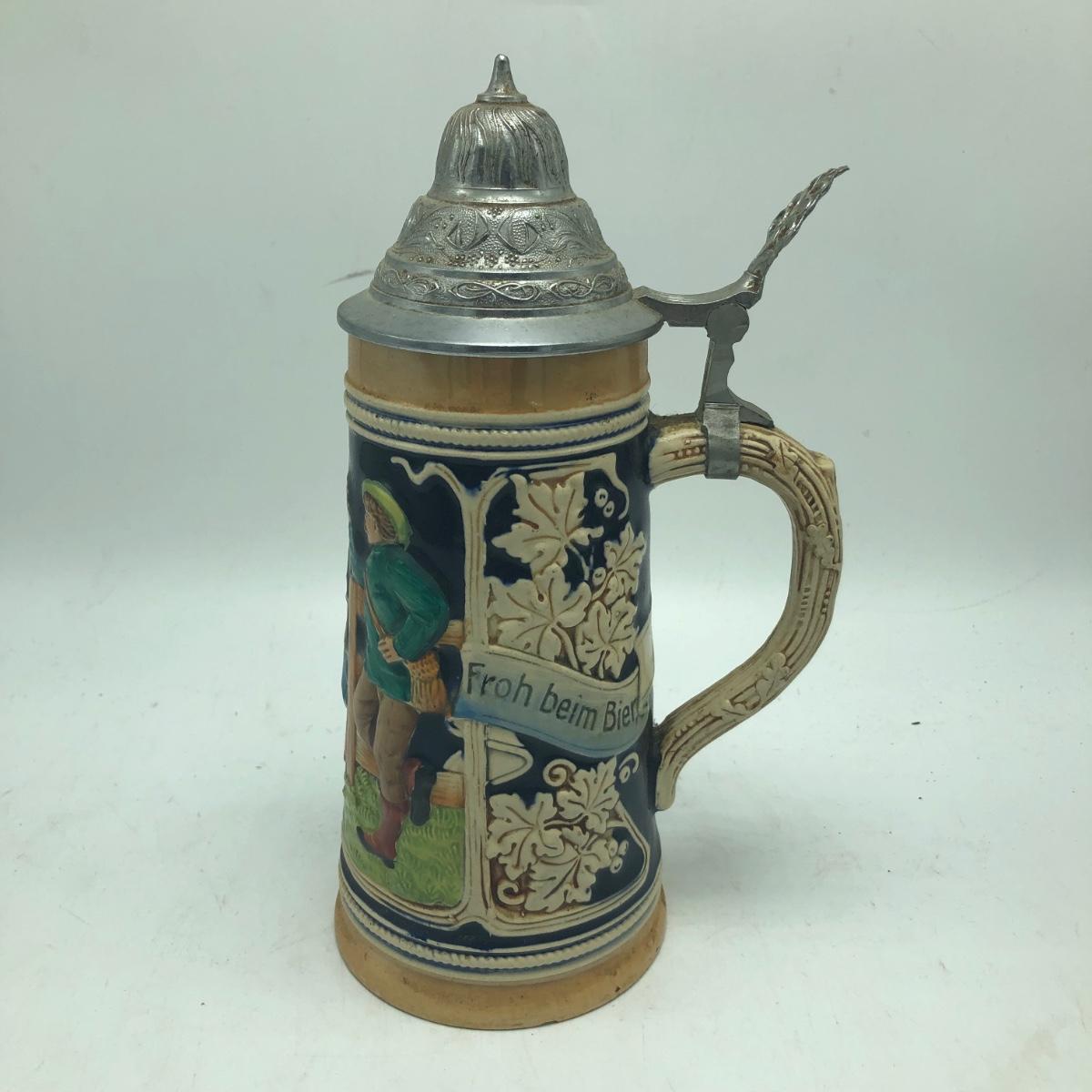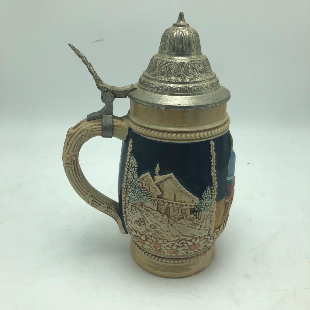 Lot contains five German beer steins that depict German life. Tallest stein measures 3.5” x 5.5” x 9”.