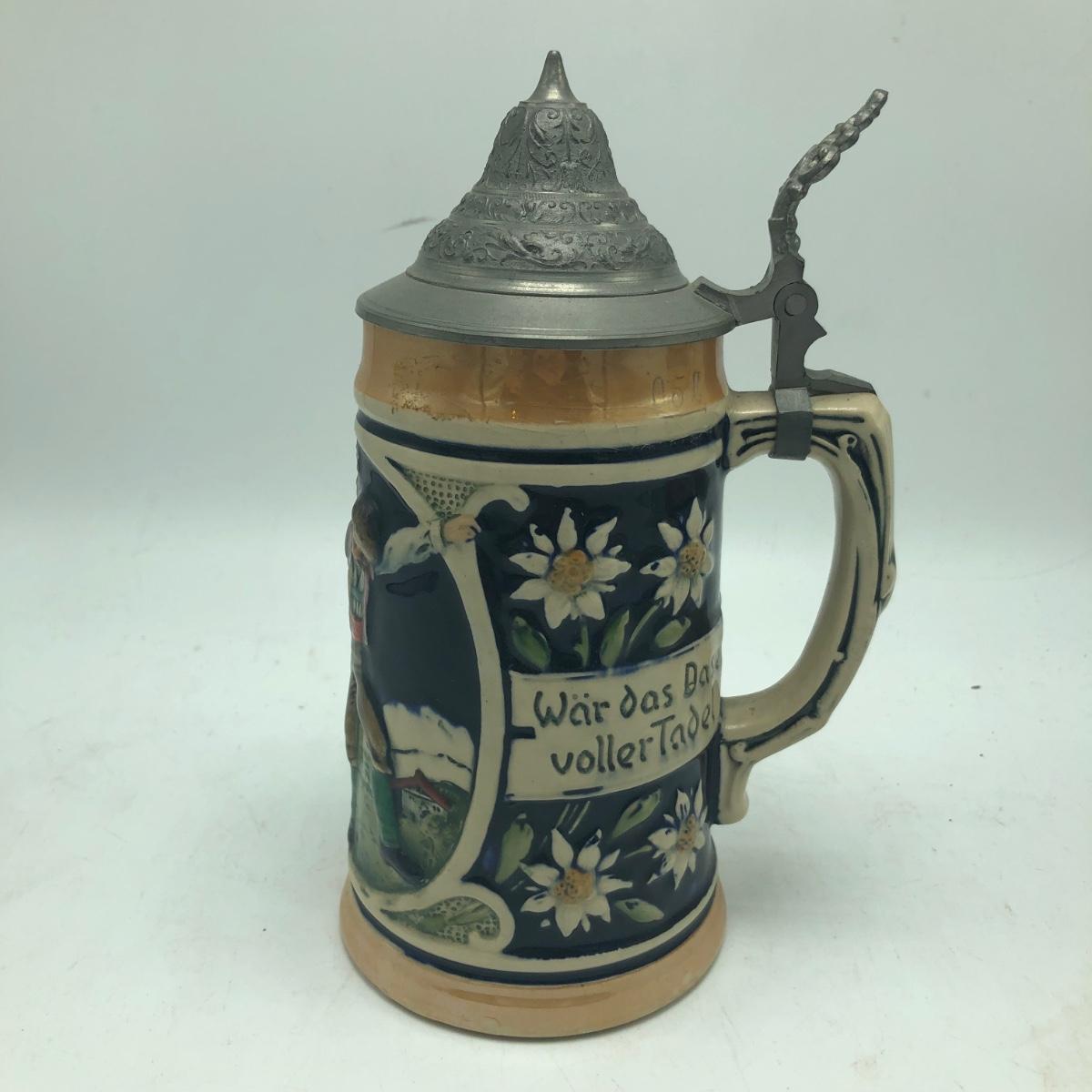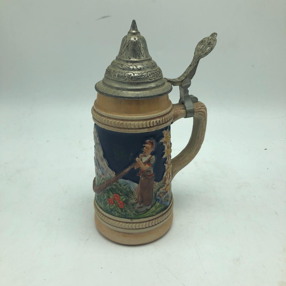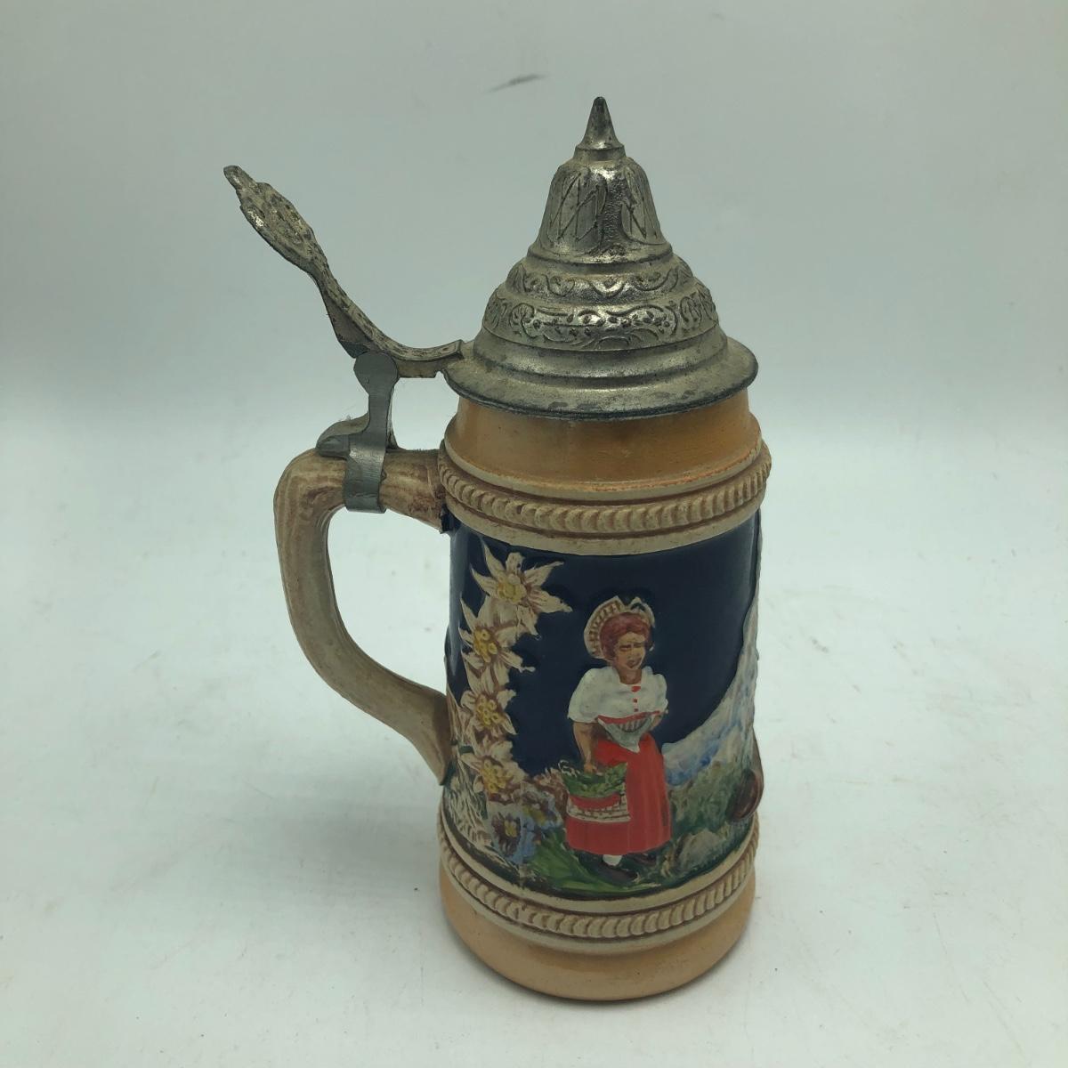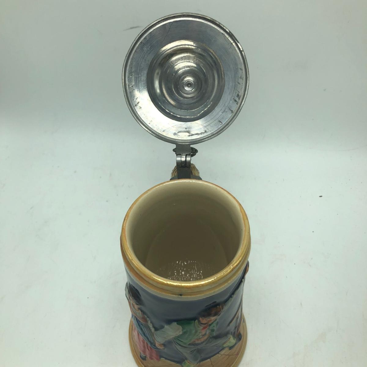 Lot contains five German beer steins that depict German life. Tallest stein measures 3.5” x 5.5” x 9”.