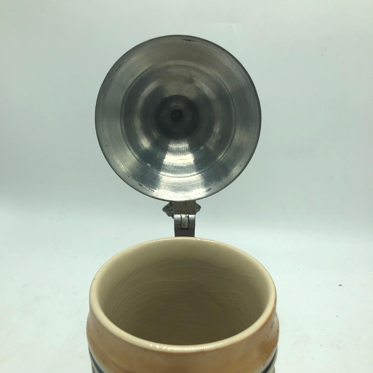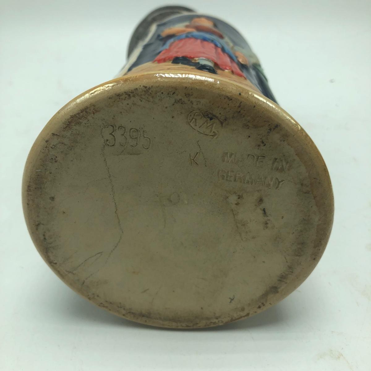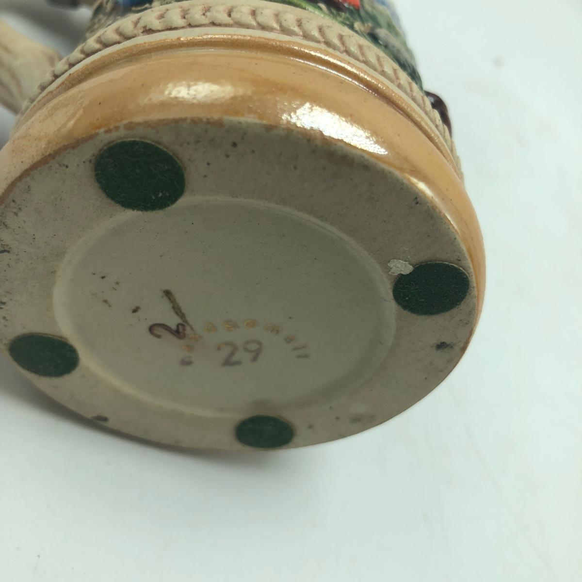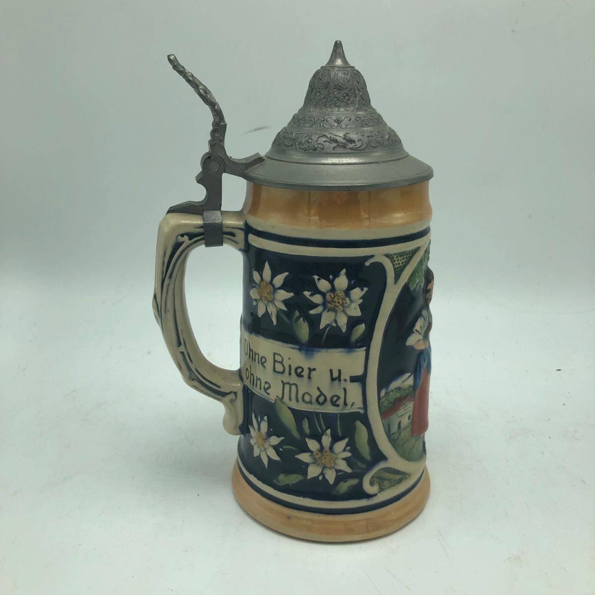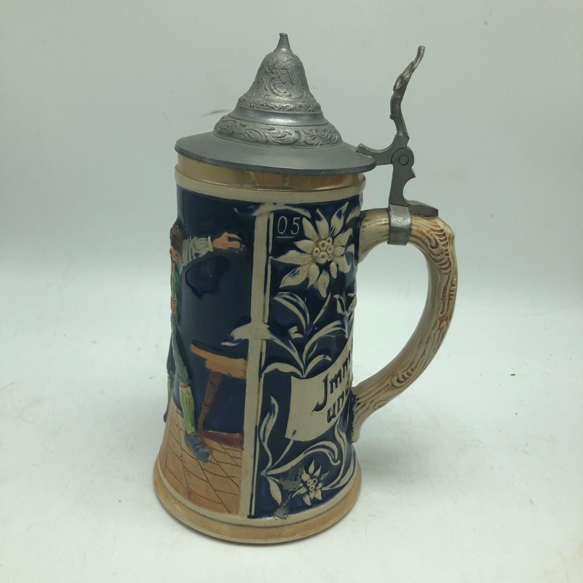 Lot contains five German beer steins that depict German life. Tallest stein measures 3.5” x 5.5” x 9”.