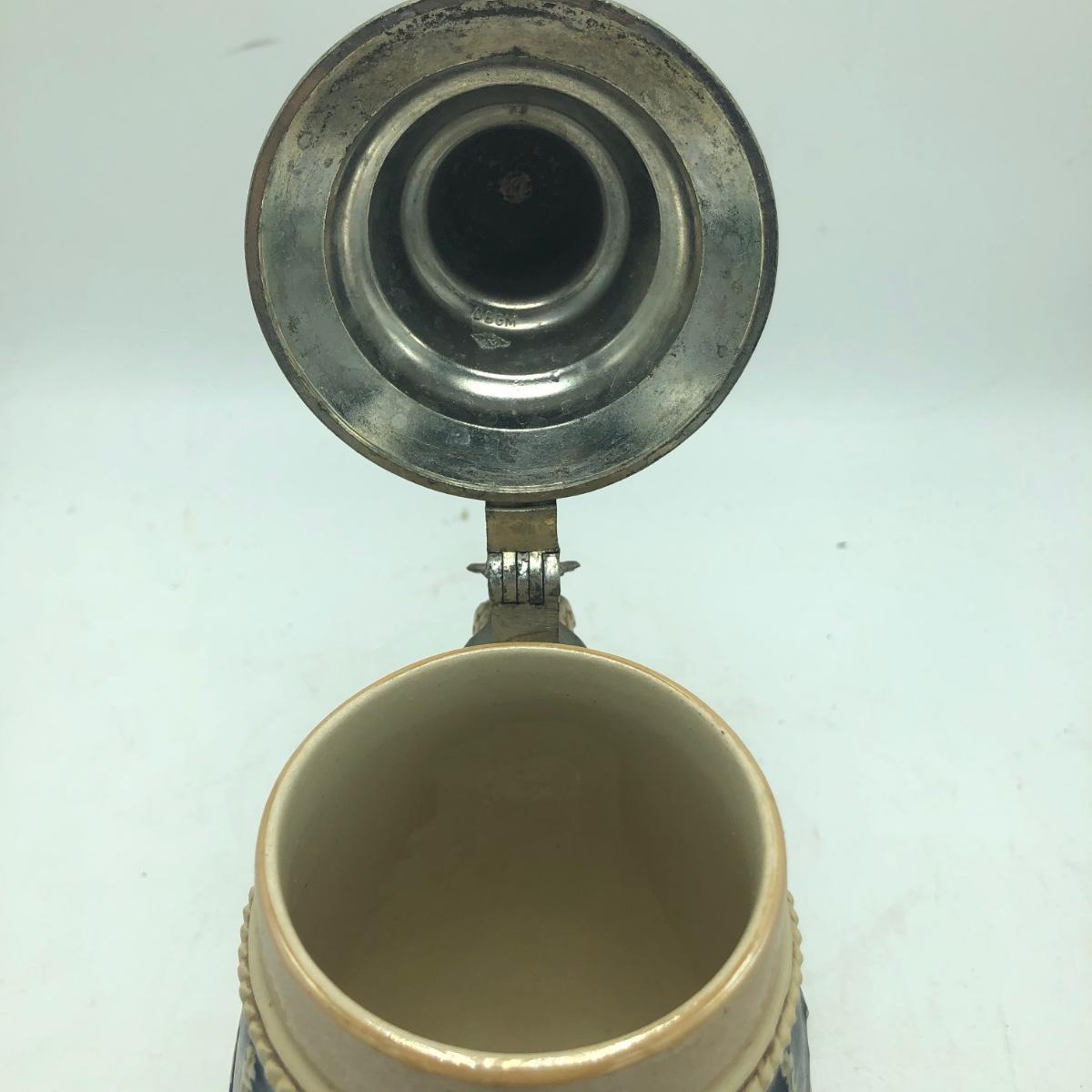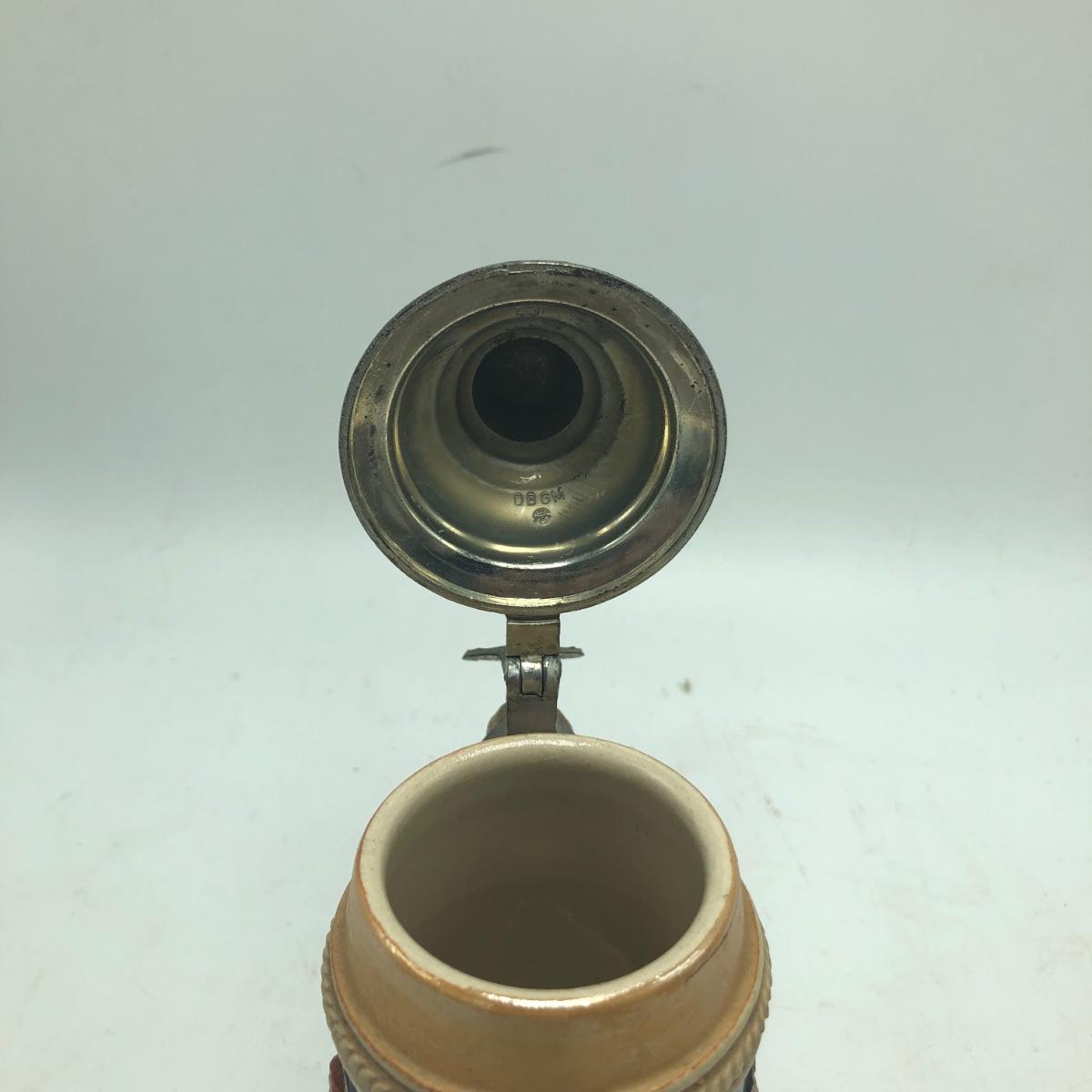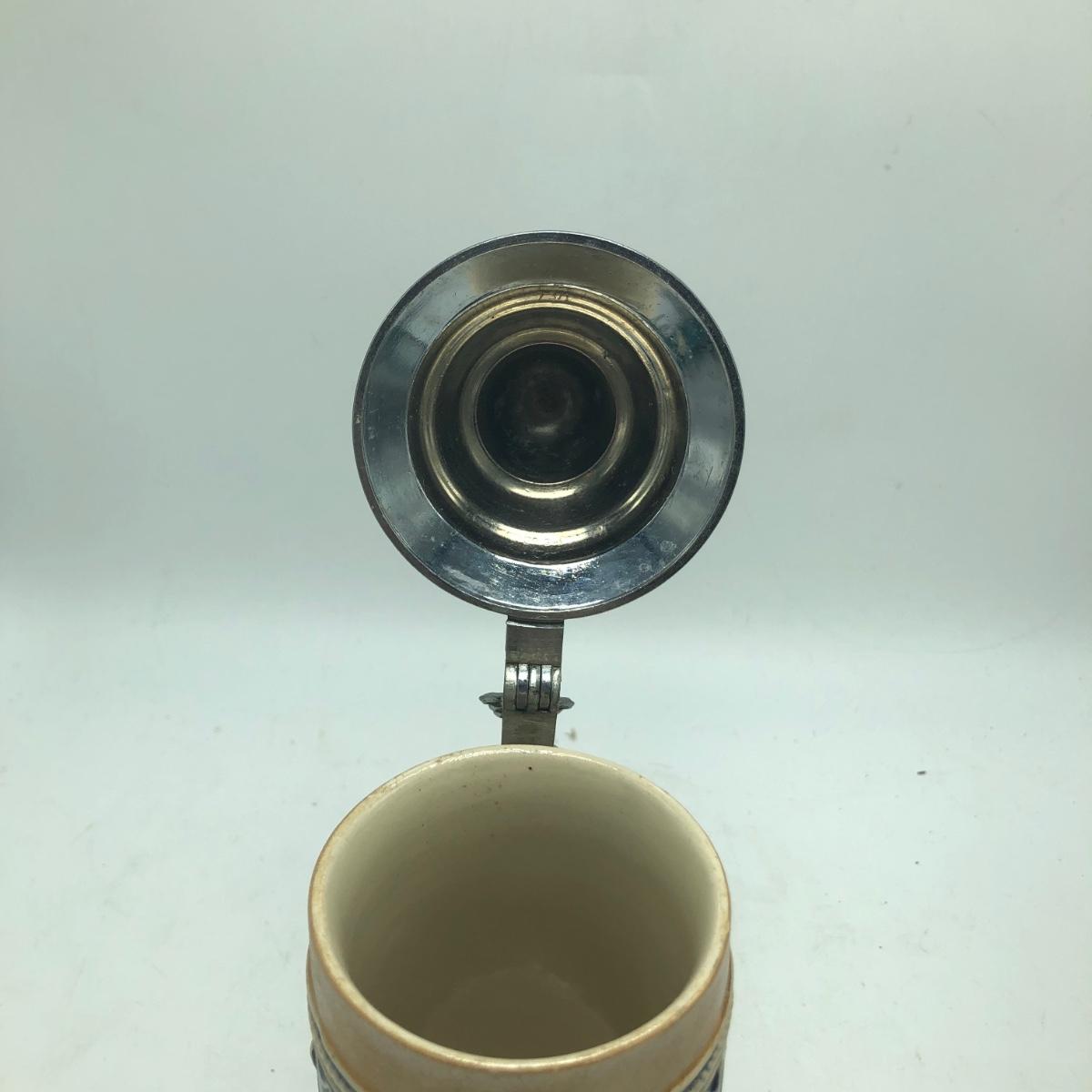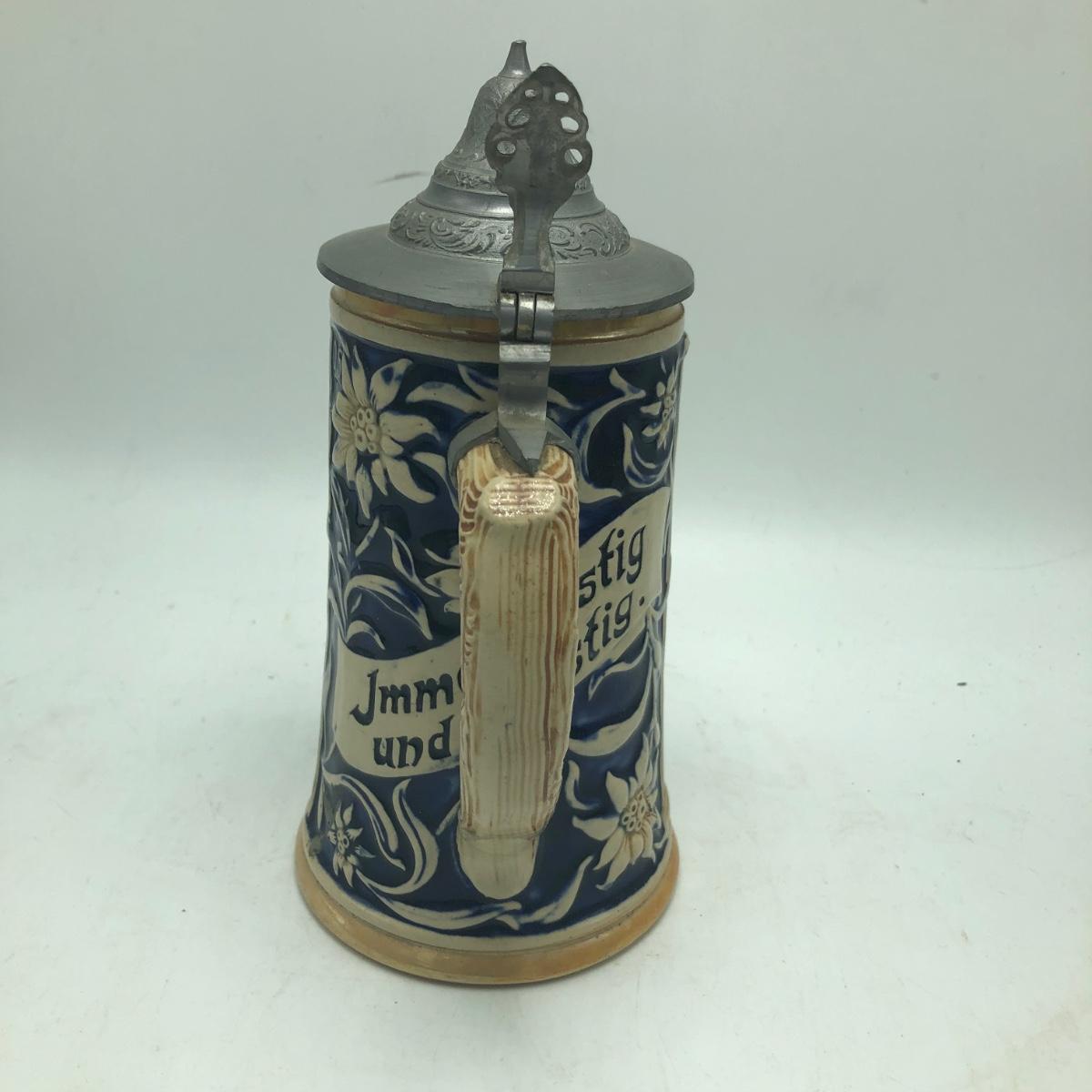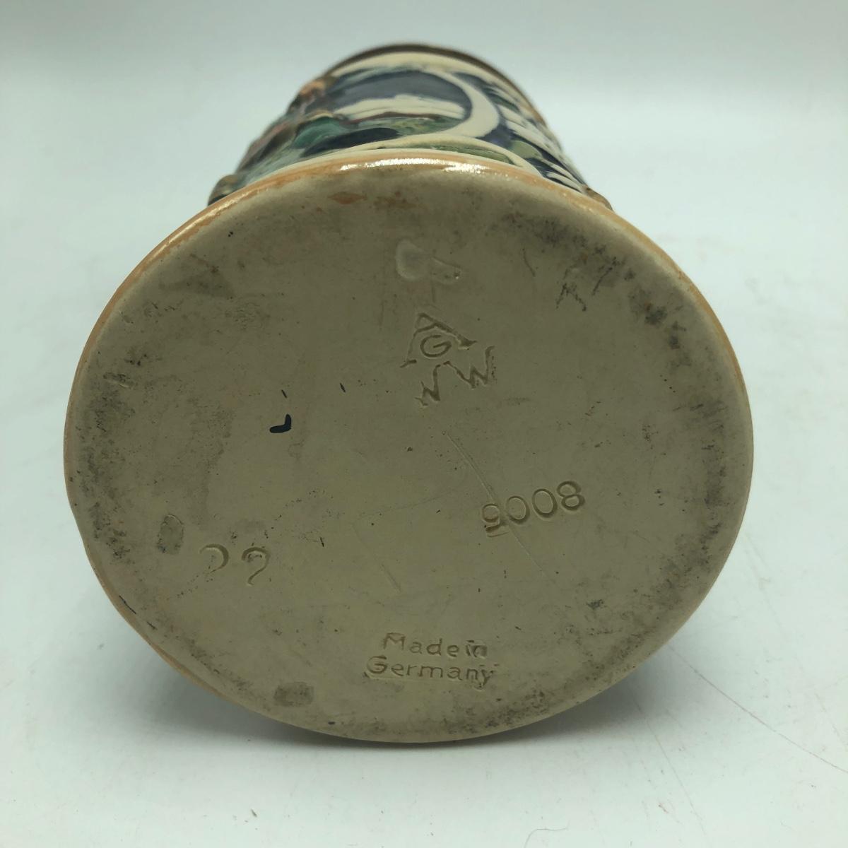 Lot contains five German beer steins that depict German life. Tallest stein measures 3.5” x 5.5” x 9”.