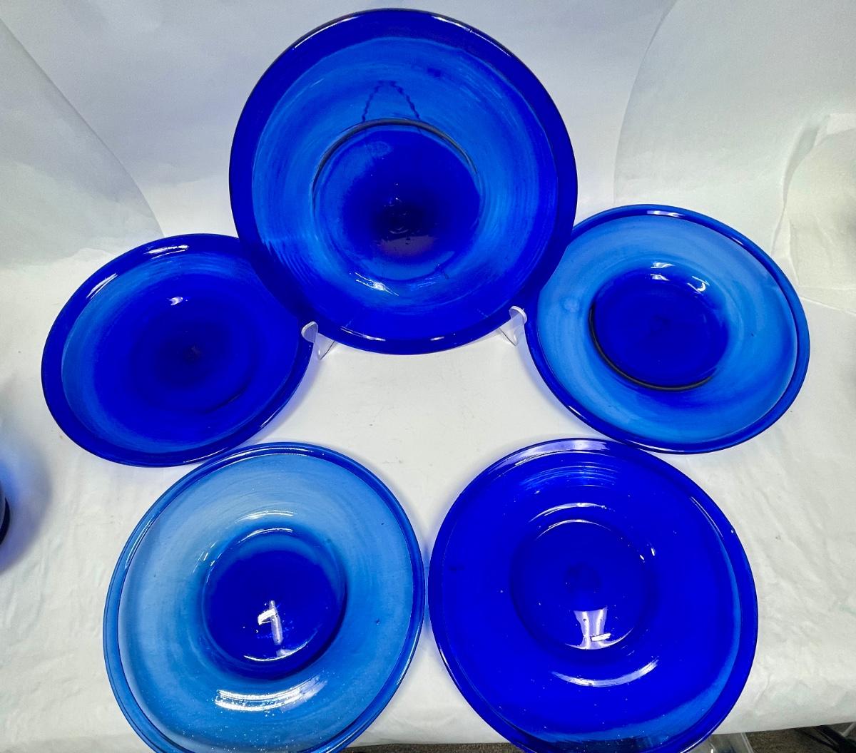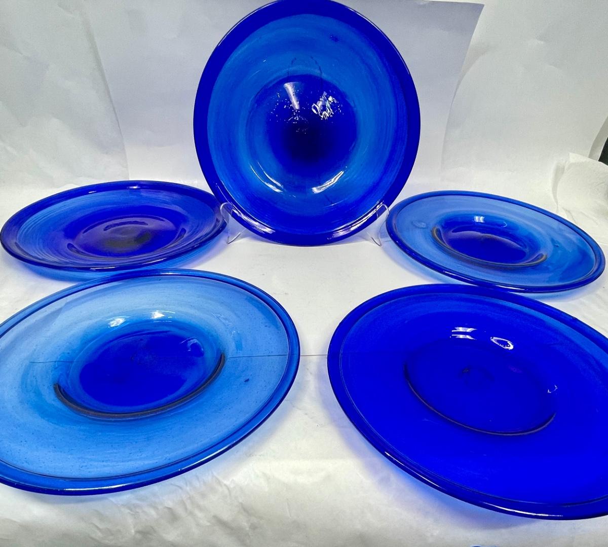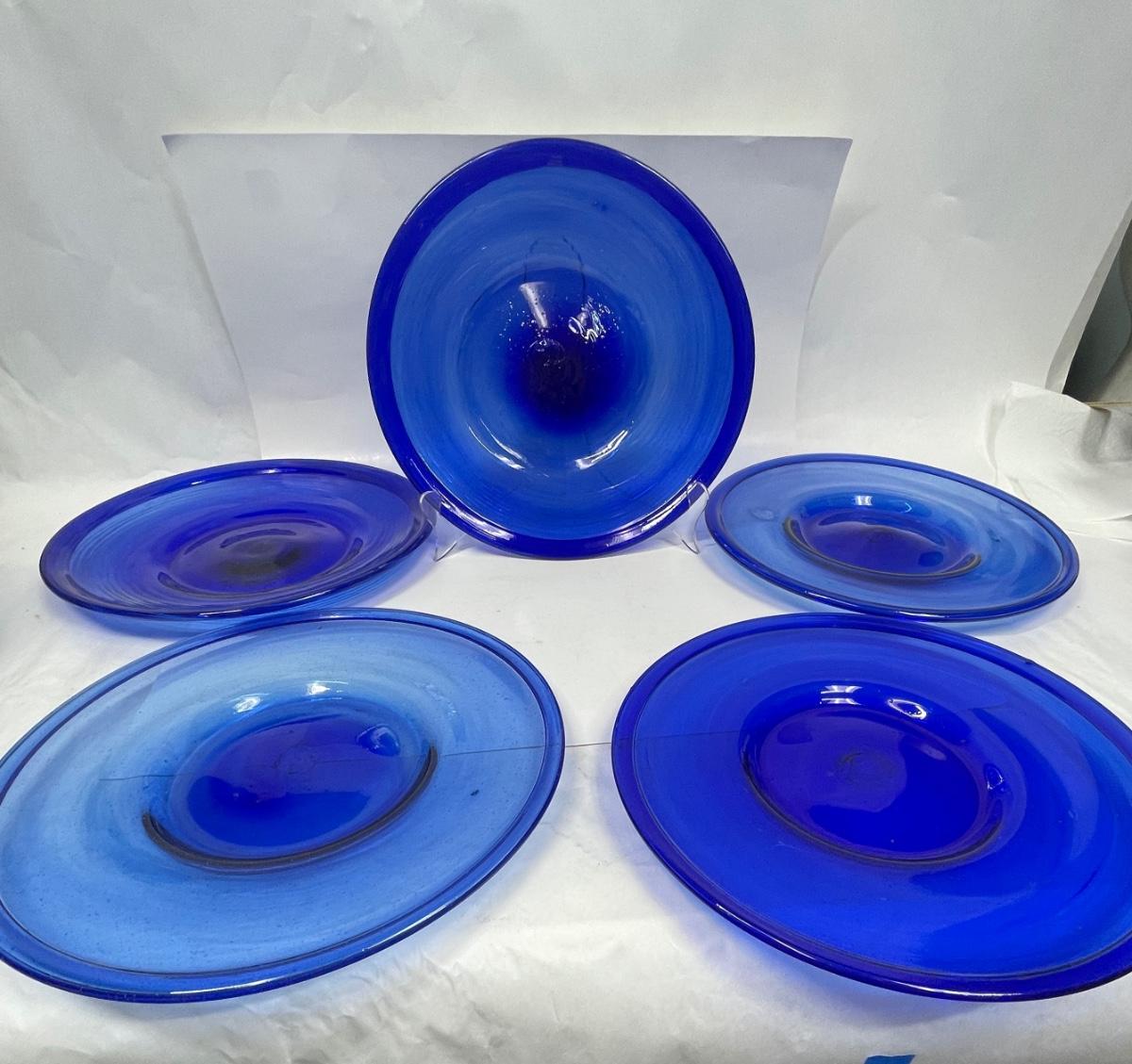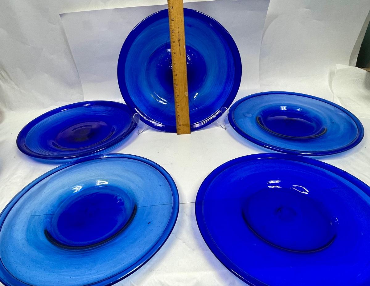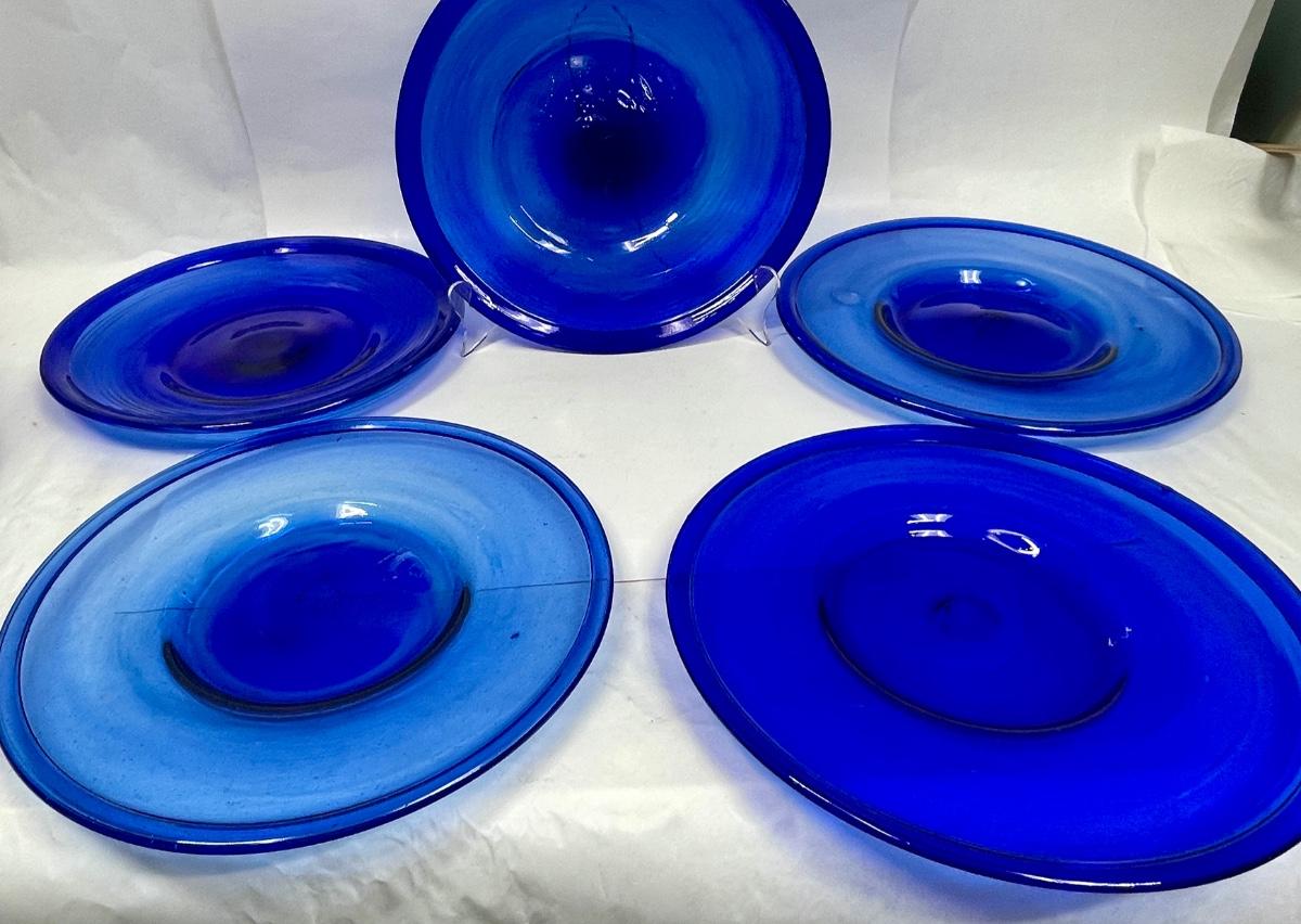 Five Large Cobalt Blue Blown Glass Plates from Mexico