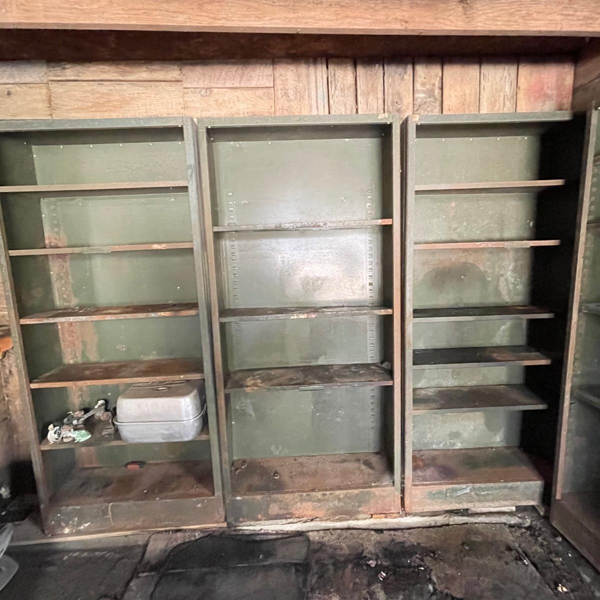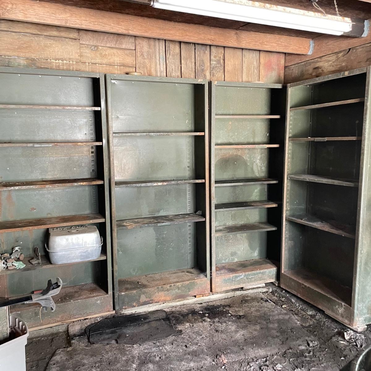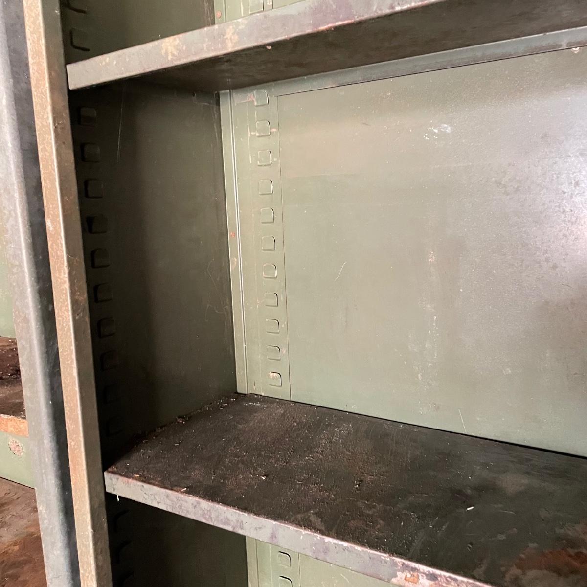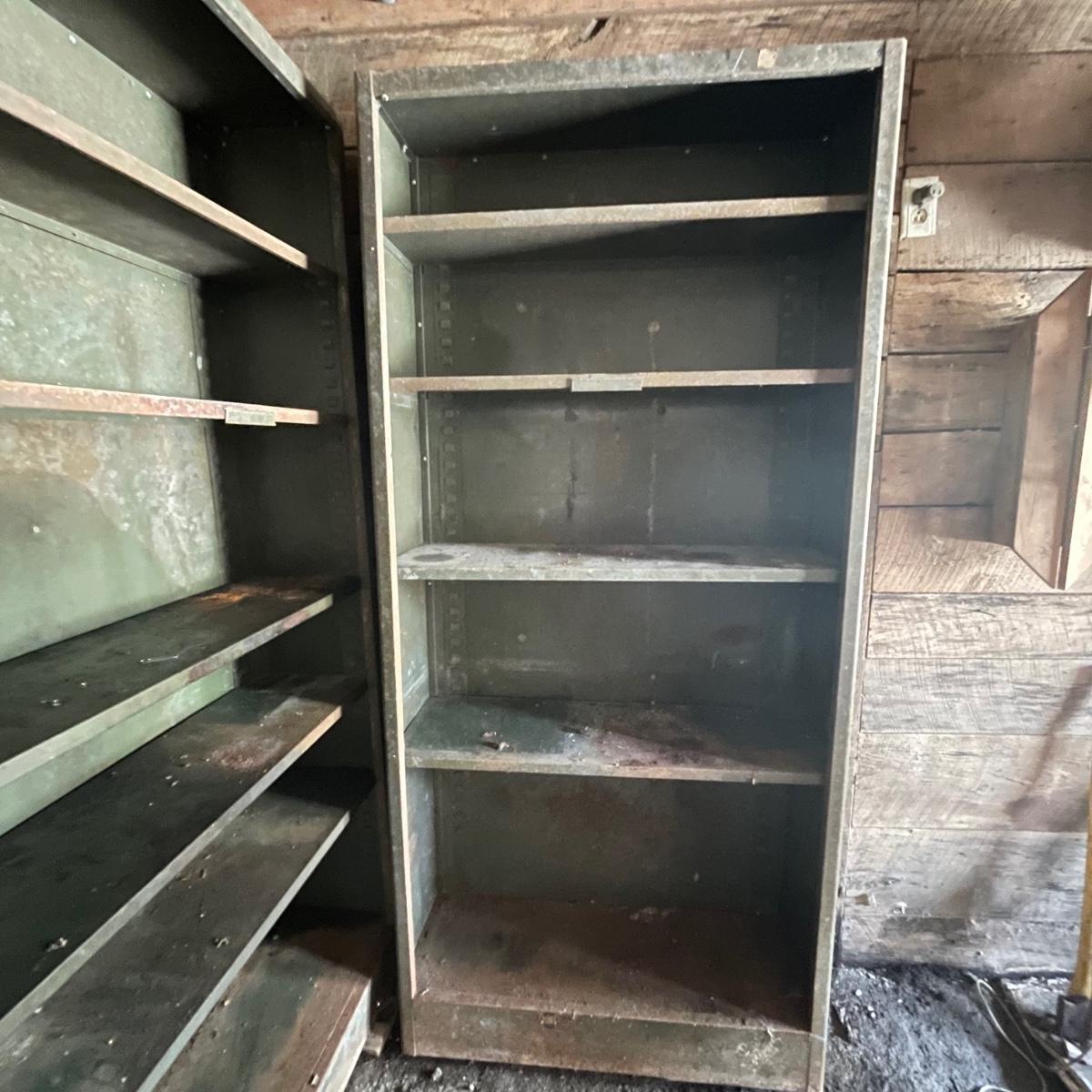 Five metal shelf units with green paint. All show rust, but appear to be structurally sound. Each shelf unit measures 36” x 12” x 78”. Interior shelves are adjustable but were not tested and may be stuck in place for some. See images. Local pick up only. Please bring help to load.