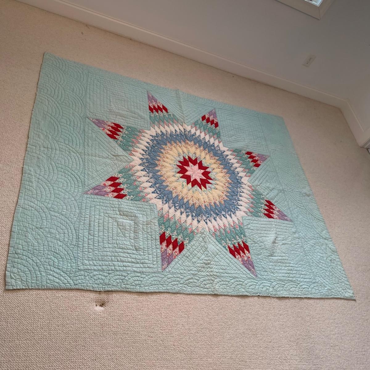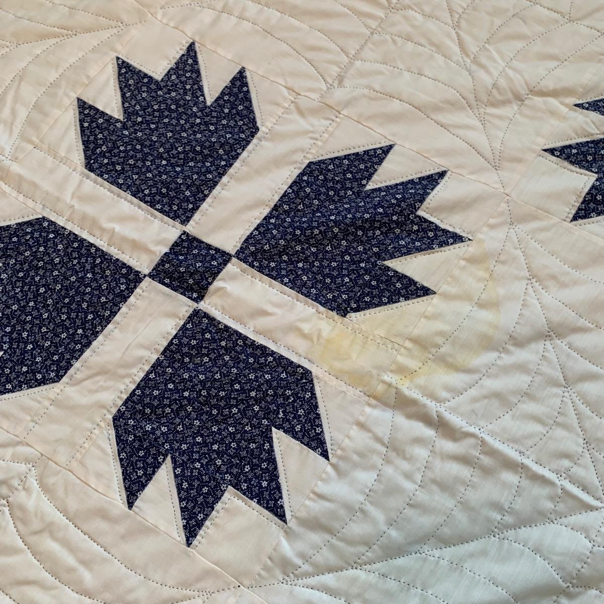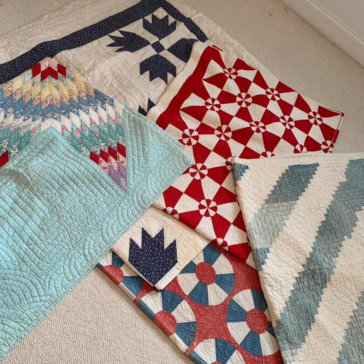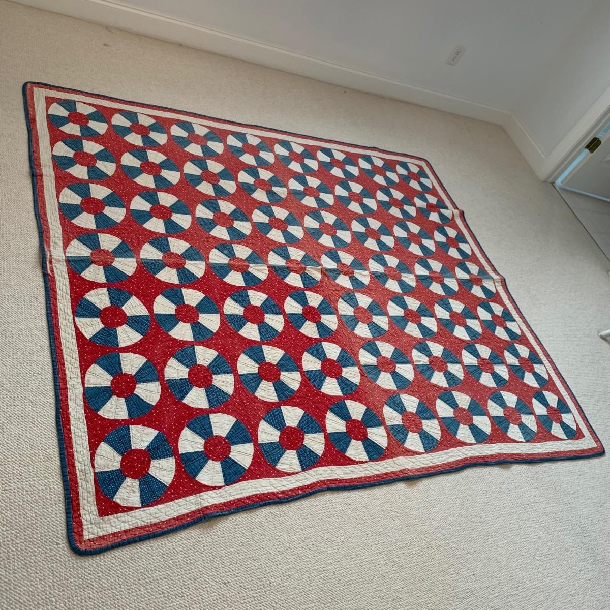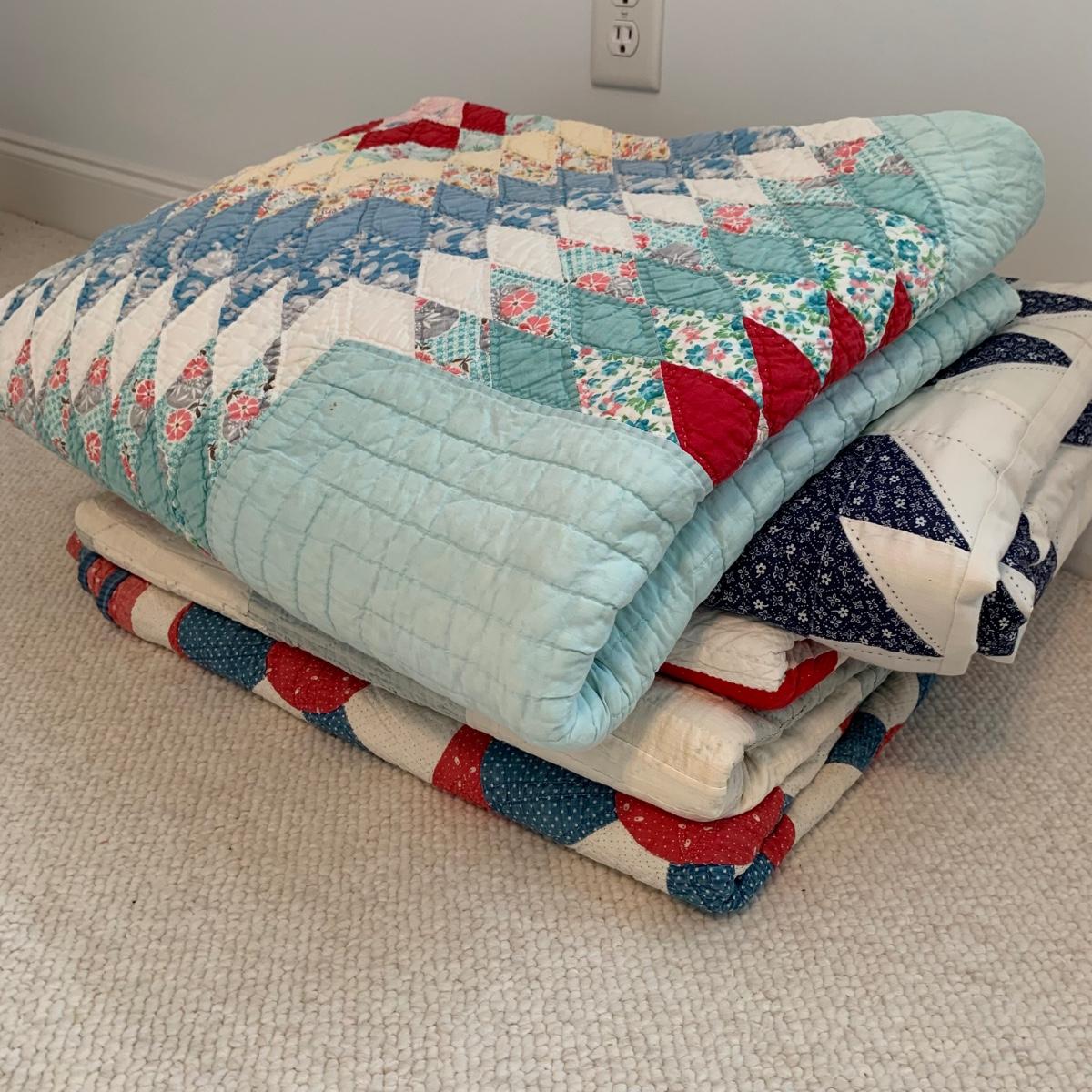 A collection of five handmade quilts. Four are similar in size; the quilt with the red, white, and blue circles measures approximately 71” x 82”. There is one very large white and blue quilt that is 100” x 102”. There are some stains and areas of wear throughout the quilts, see photos.
