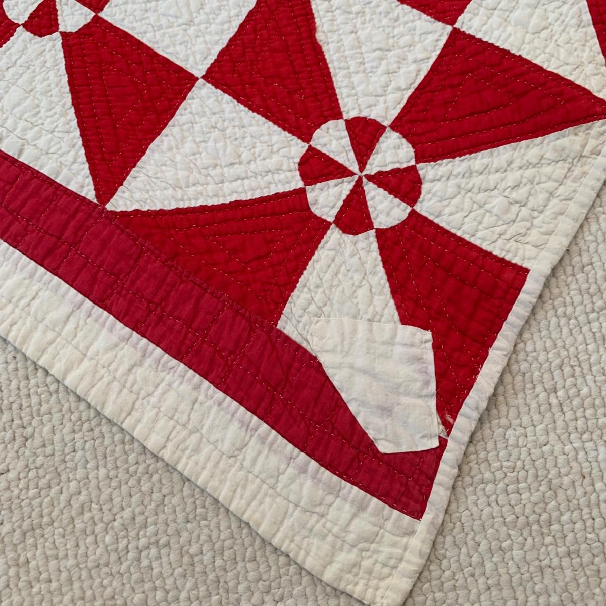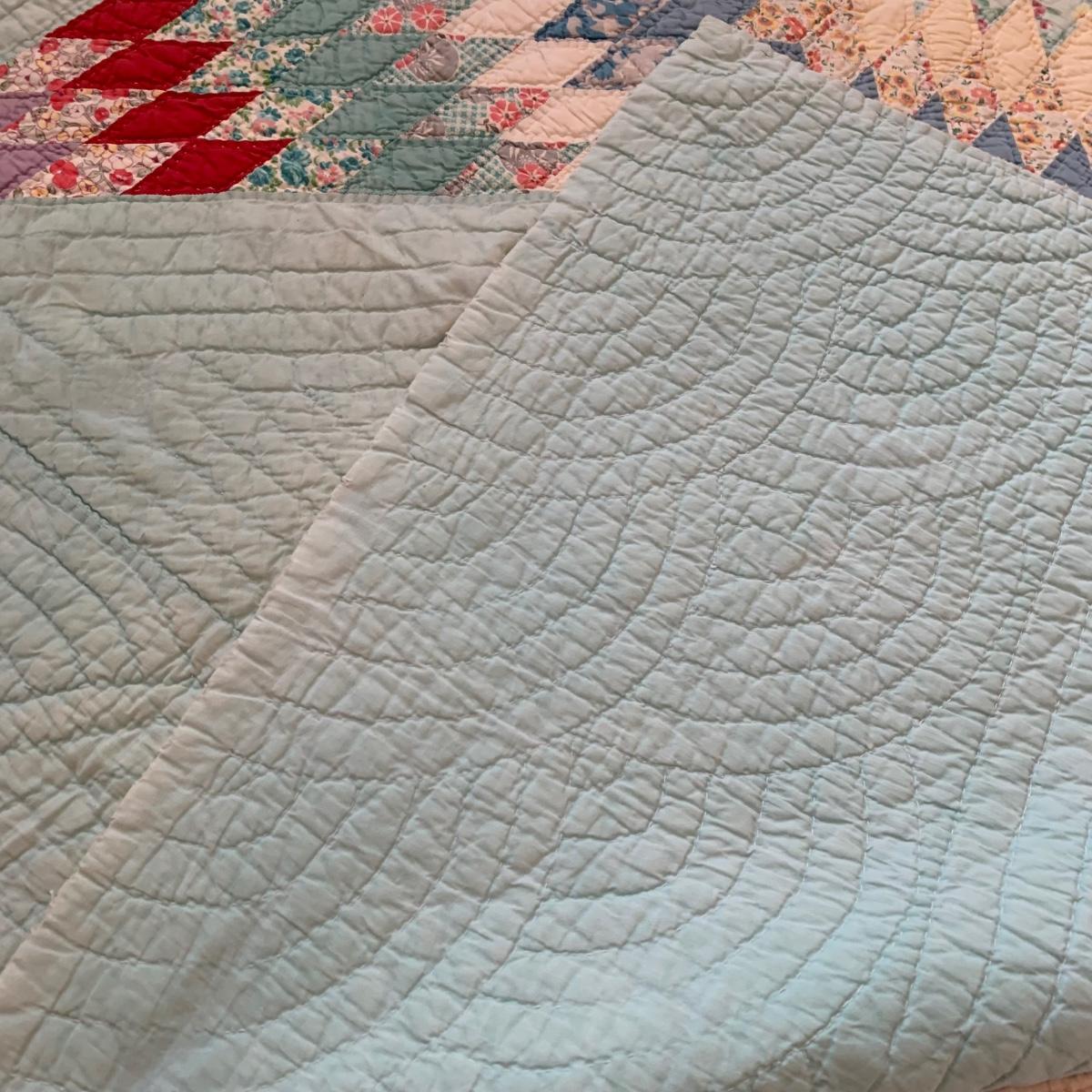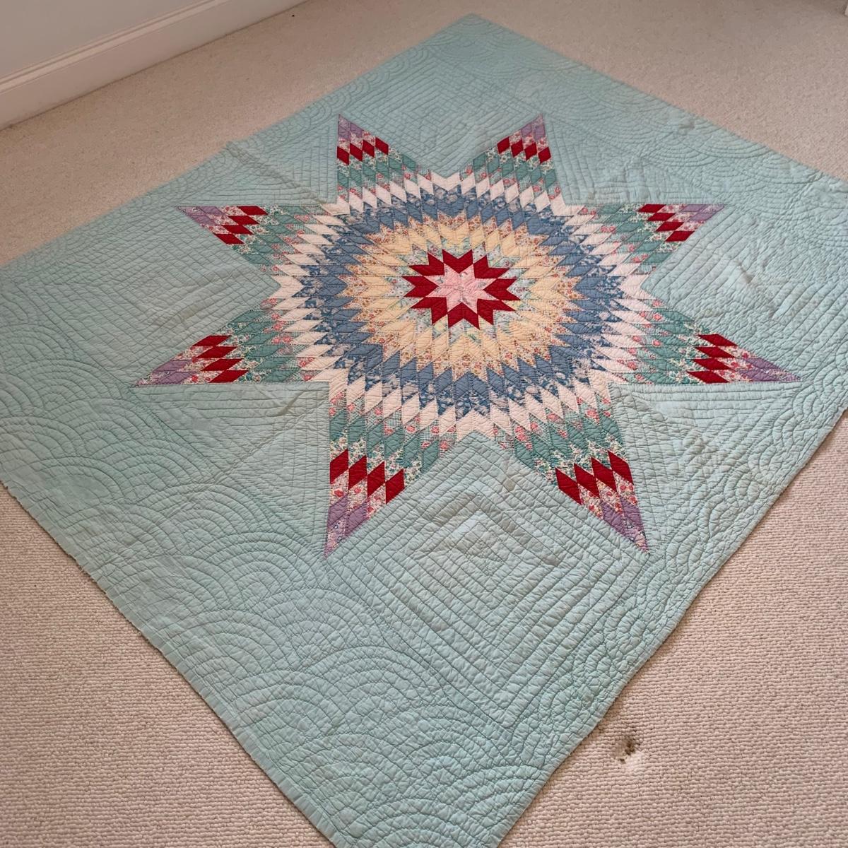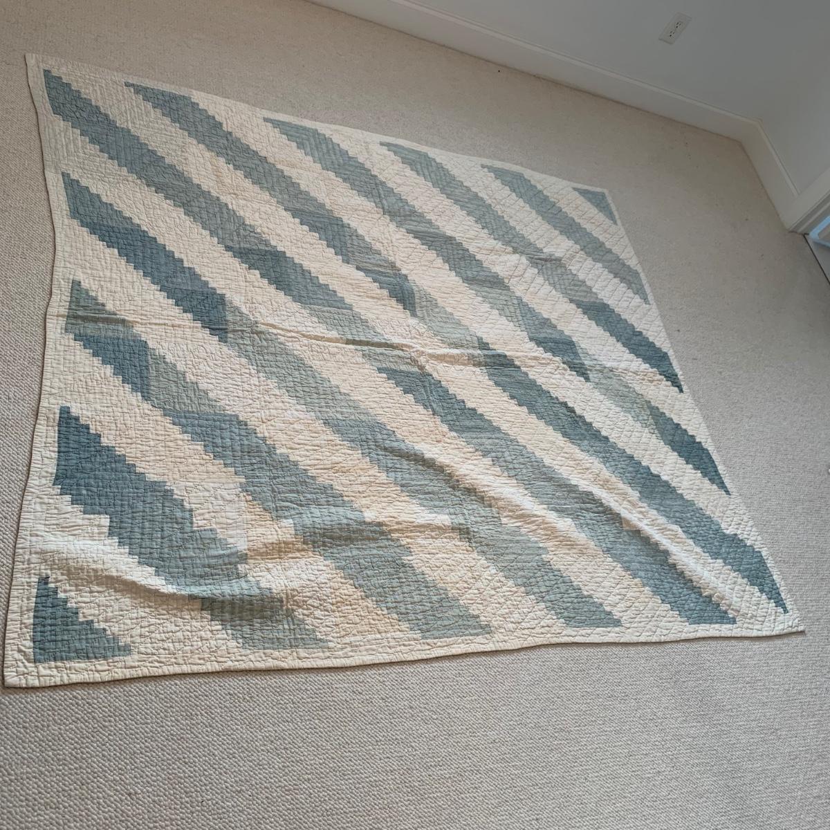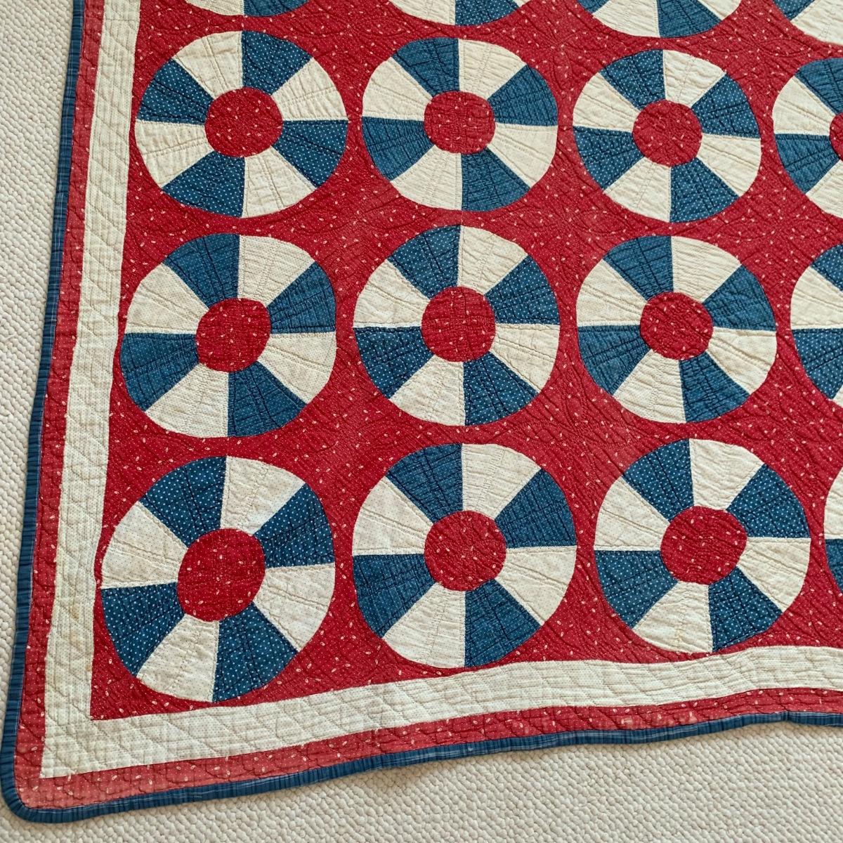 A collection of five handmade quilts. Four are similar in size; the quilt with the red, white, and blue circles measures approximately 71” x 82”. There is one very large white and blue quilt that is 100” x 102”. There are some stains and areas of wear throughout the quilts, see photos.