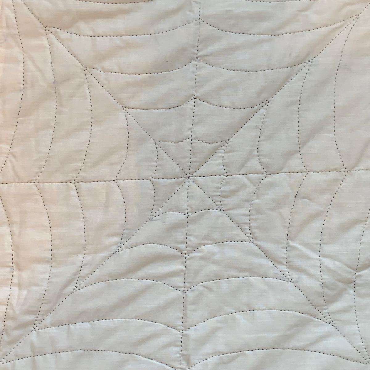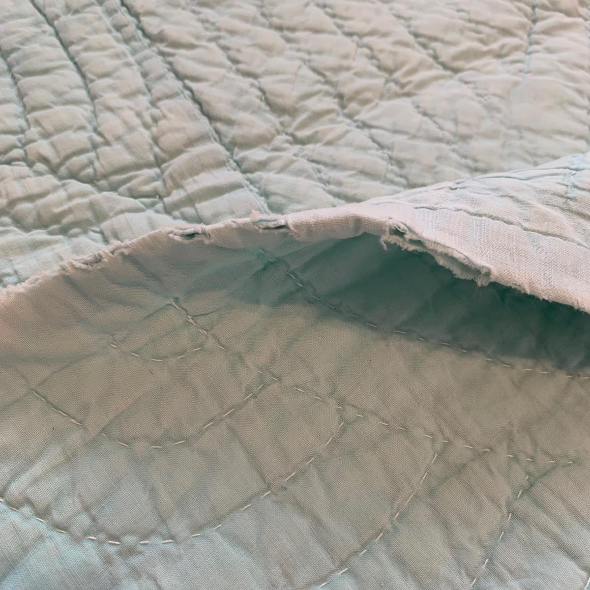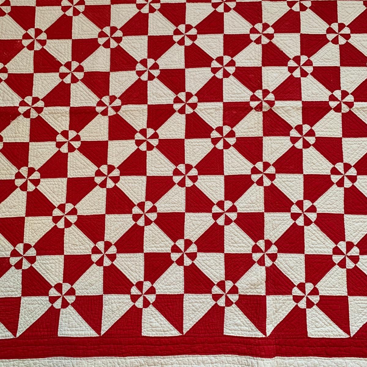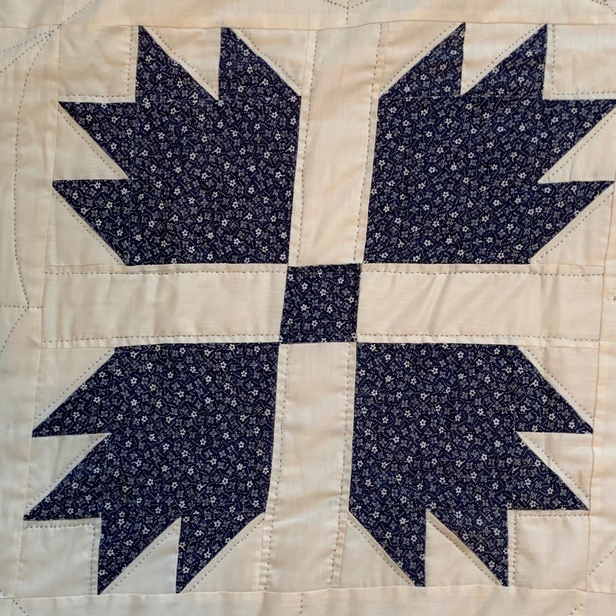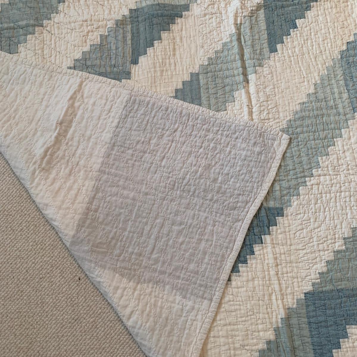 A collection of five handmade quilts. Four are similar in size; the quilt with the red, white, and blue circles measures approximately 71” x 82”. There is one very large white and blue quilt that is 100” x 102”. There are some stains and areas of wear throughout the quilts, see photos.