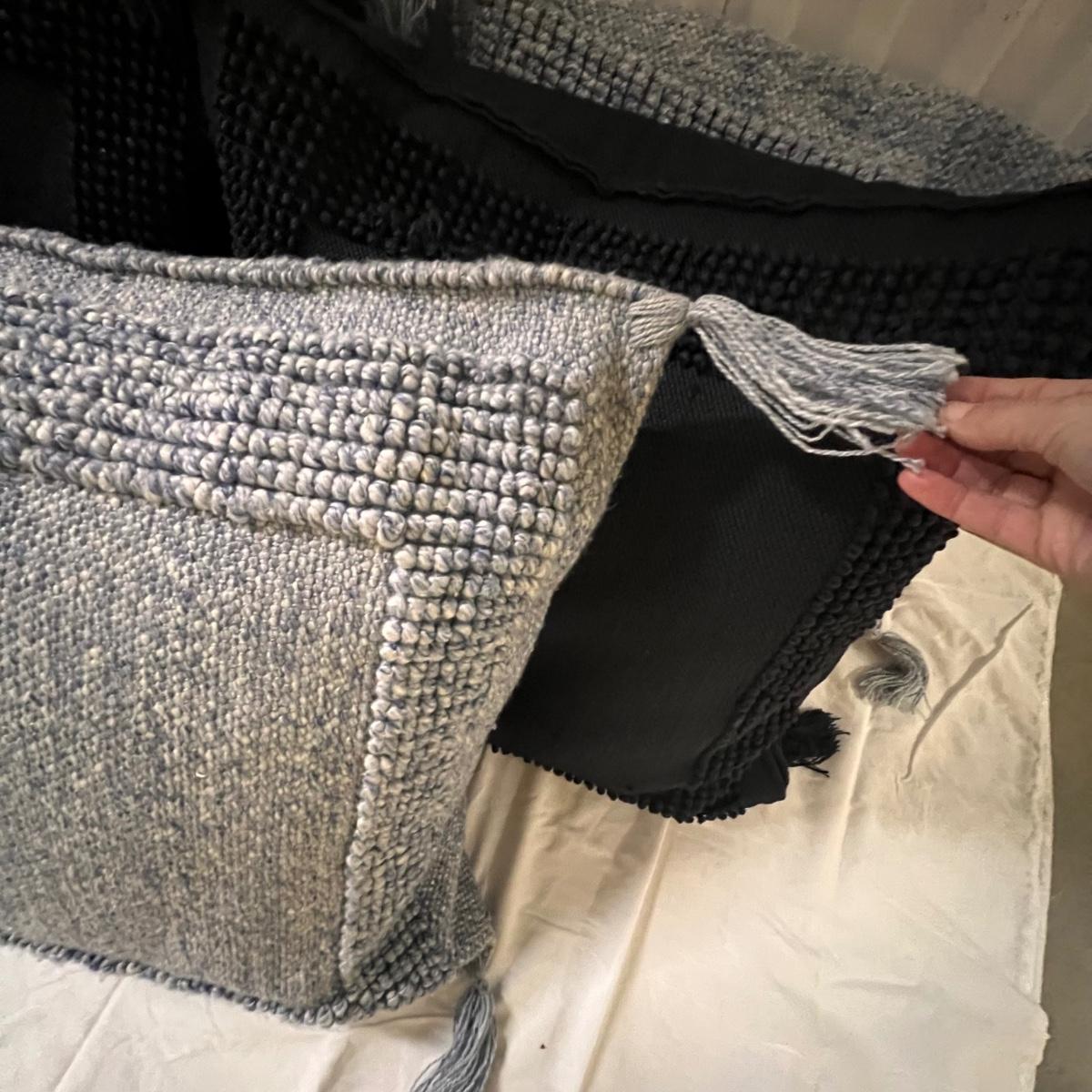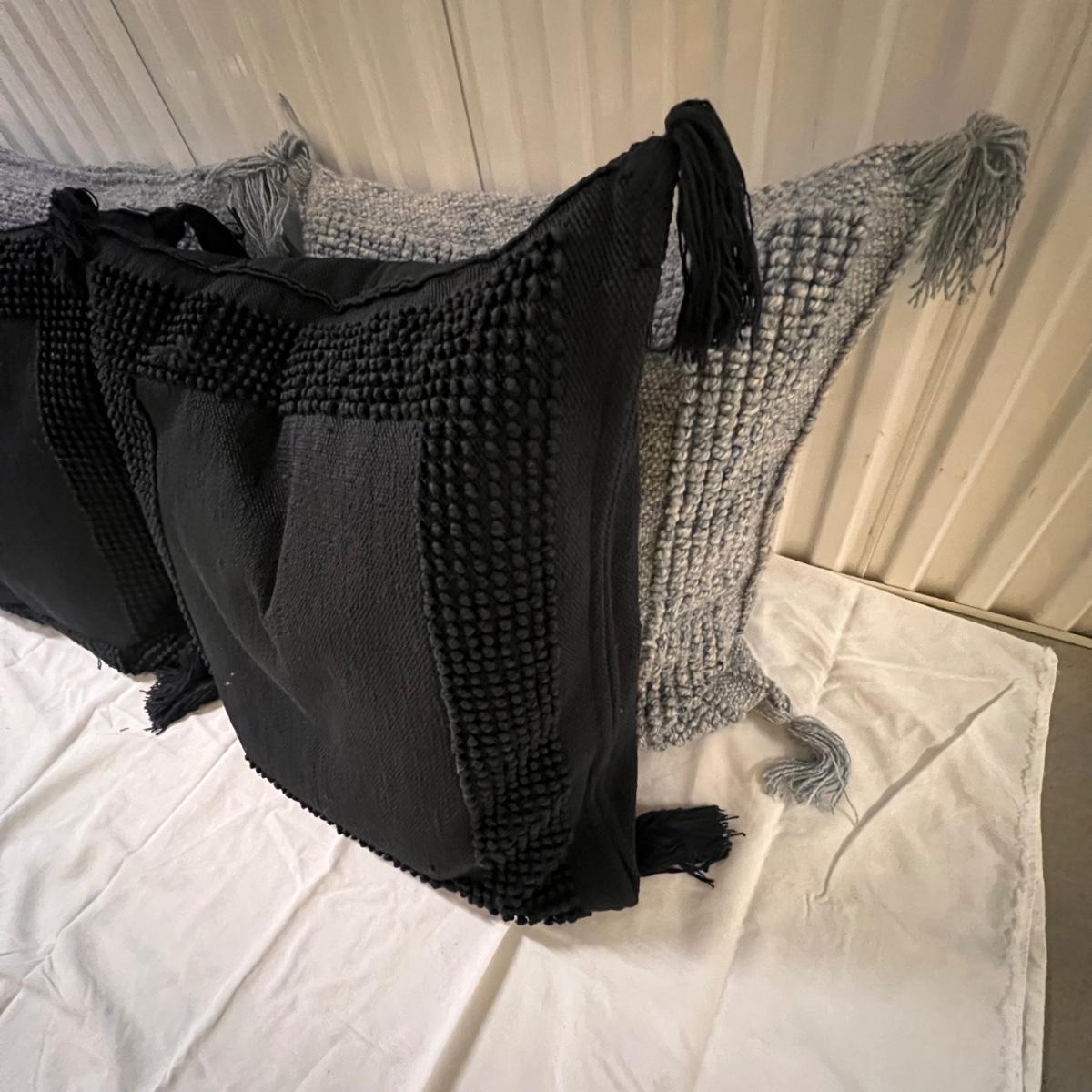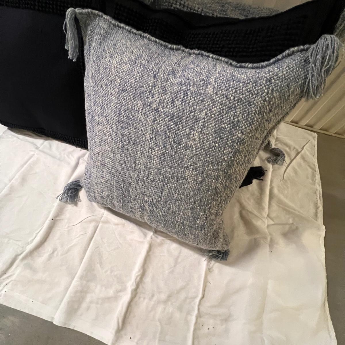 Three blue and two black accent cushions are all Serena & Lily and all have removable covers. They are polyester but have a macrame wool-like look and texture with tassels.