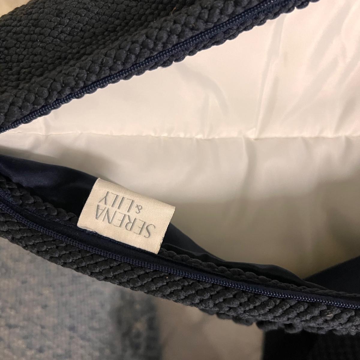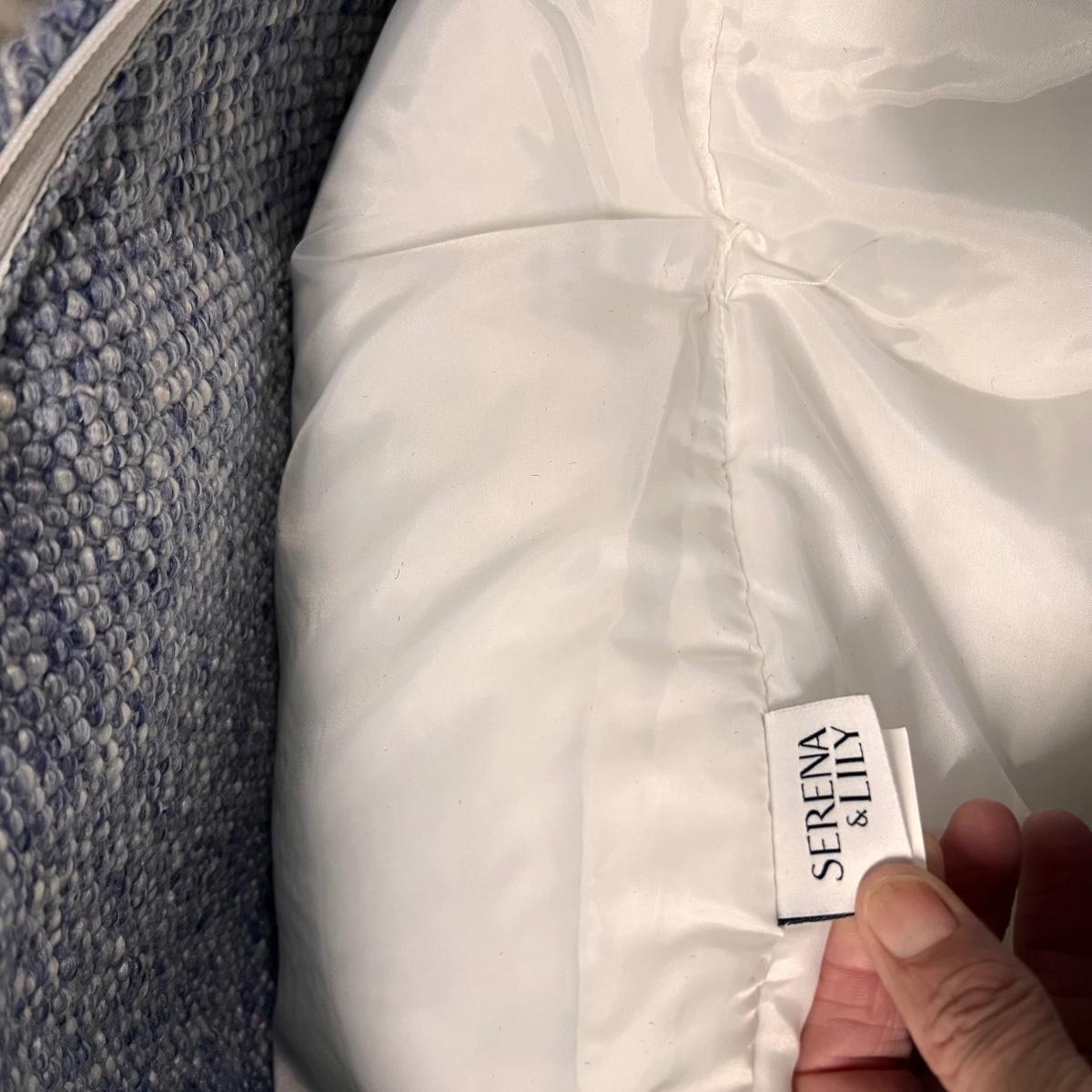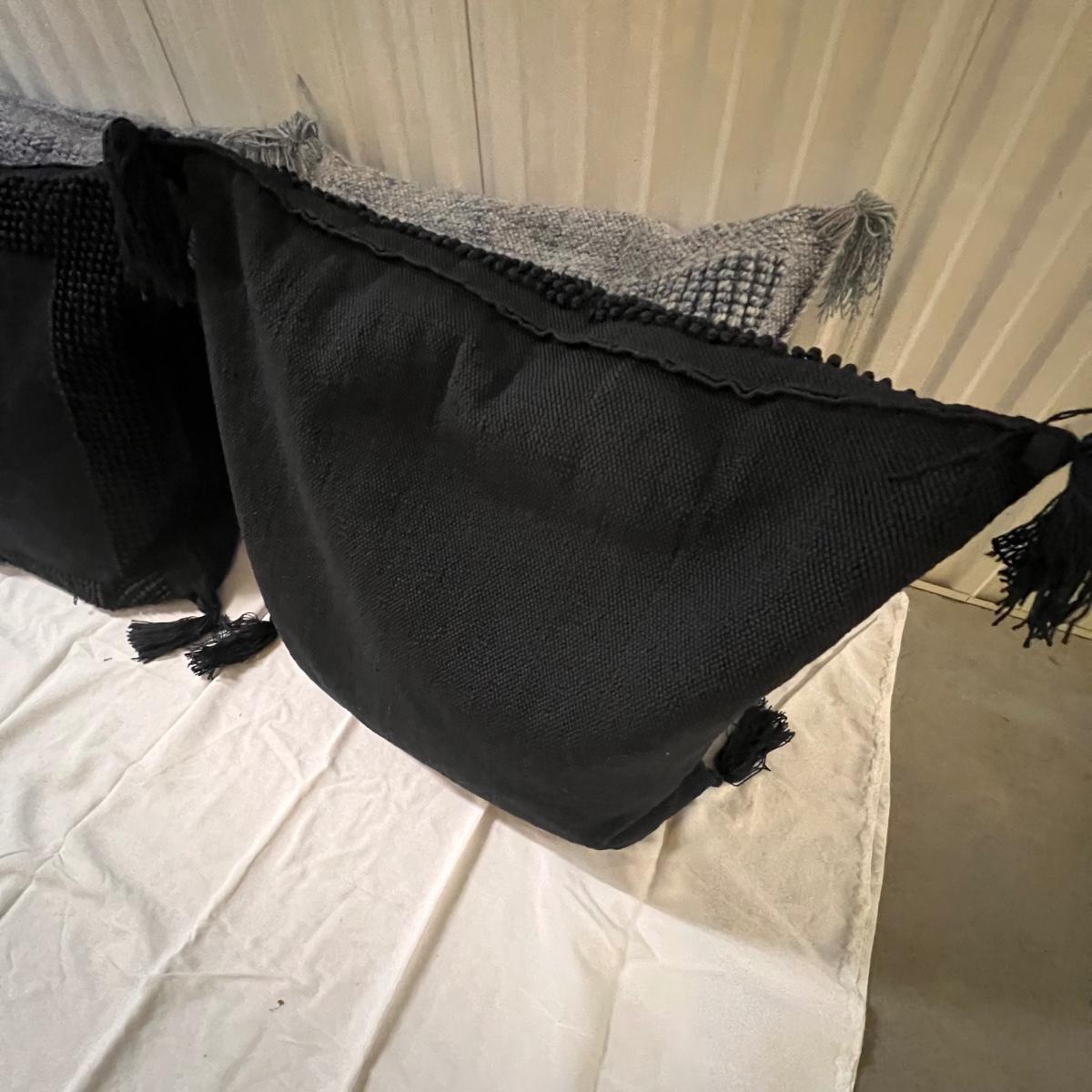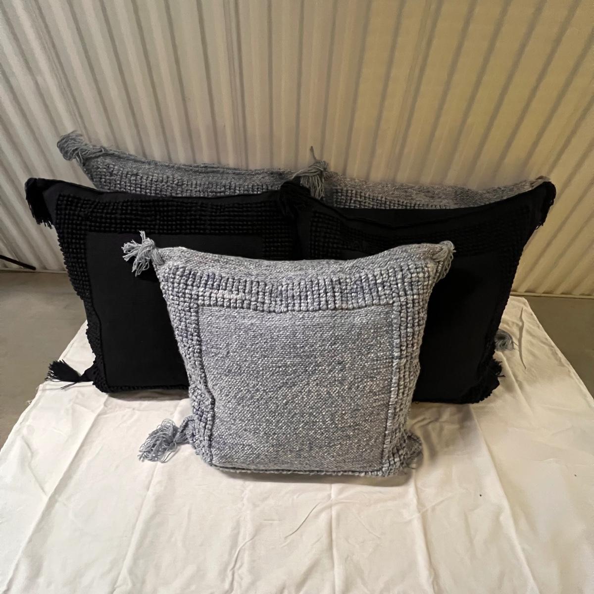 Three blue and two black accent cushions are all Serena & Lily and all have removable covers. They are polyester but have a macrame wool-like look and texture with tassels.