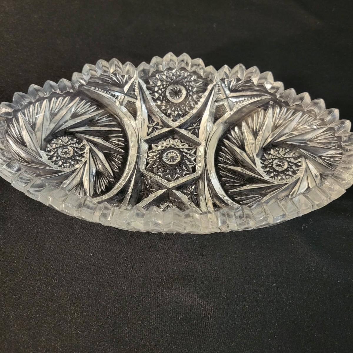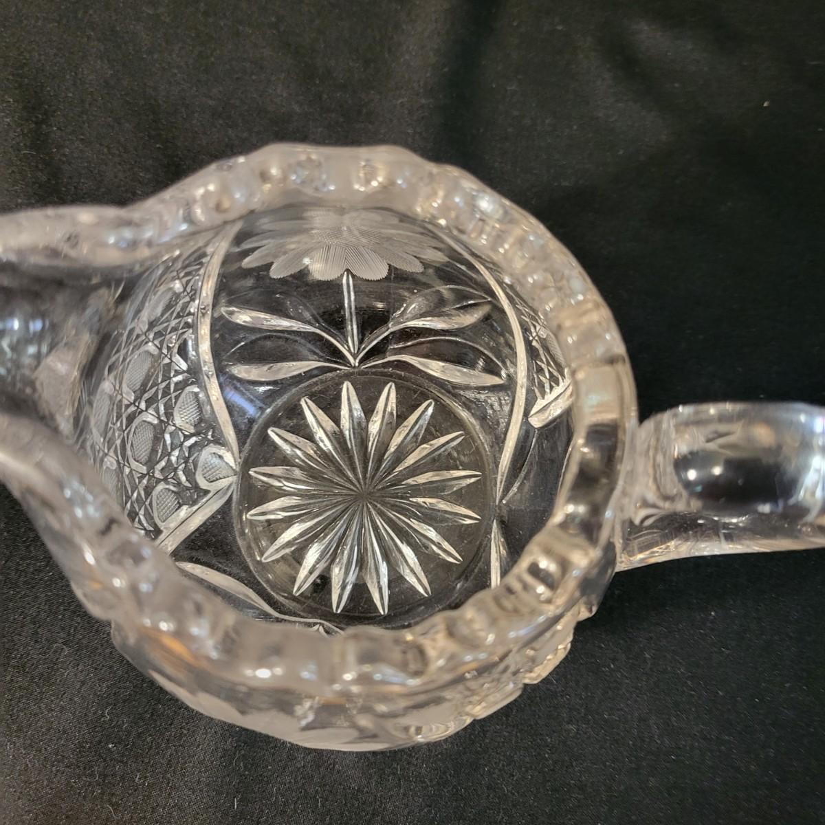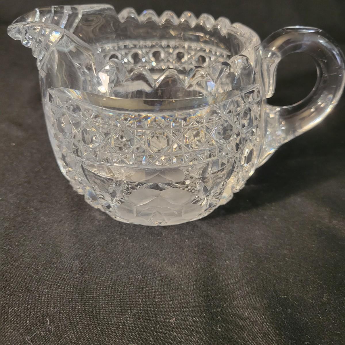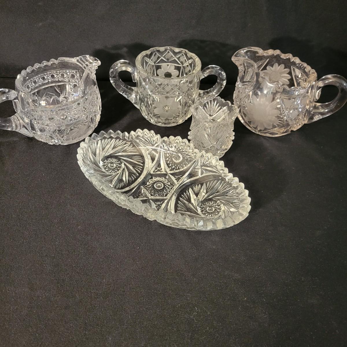 An assortment of five crystal and molded glass pieces in excellent condition. It appears that four pieces are molded glass and the pitcher on the left is leaded crystal. The candy dish measures approximately 8" x 4.5" x 1" Shipping available