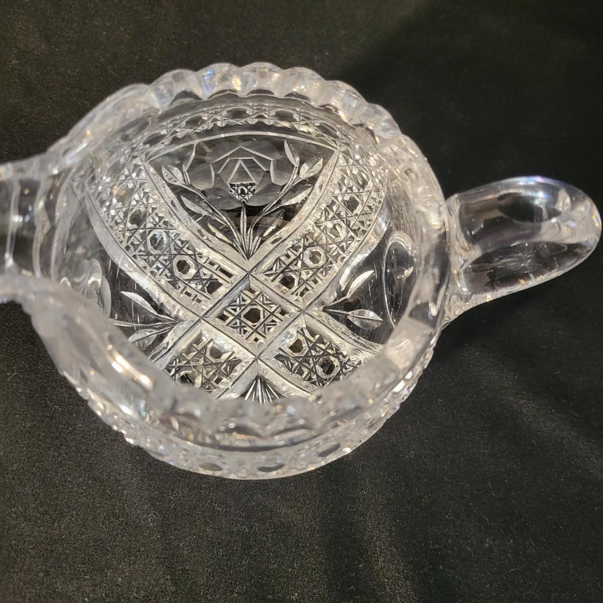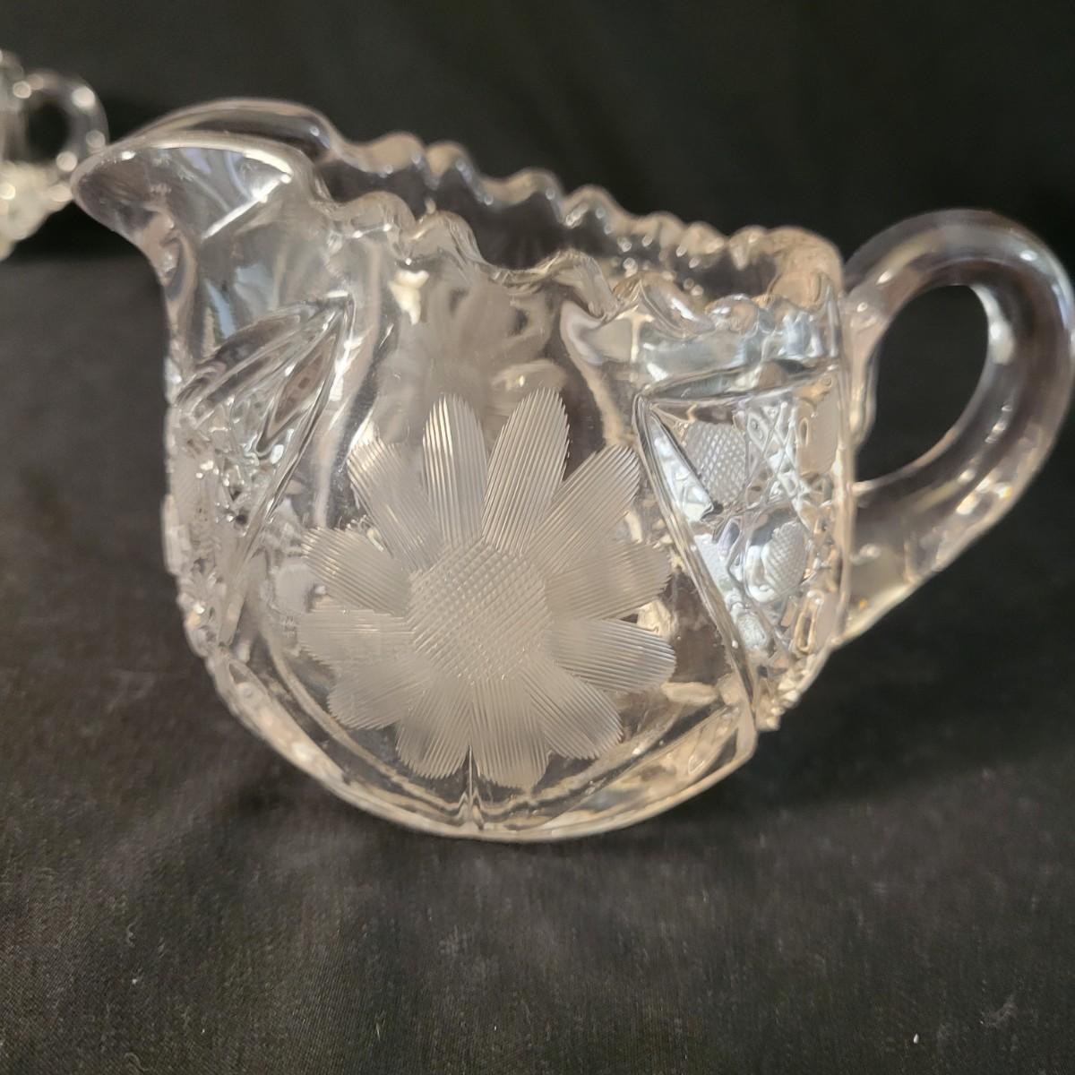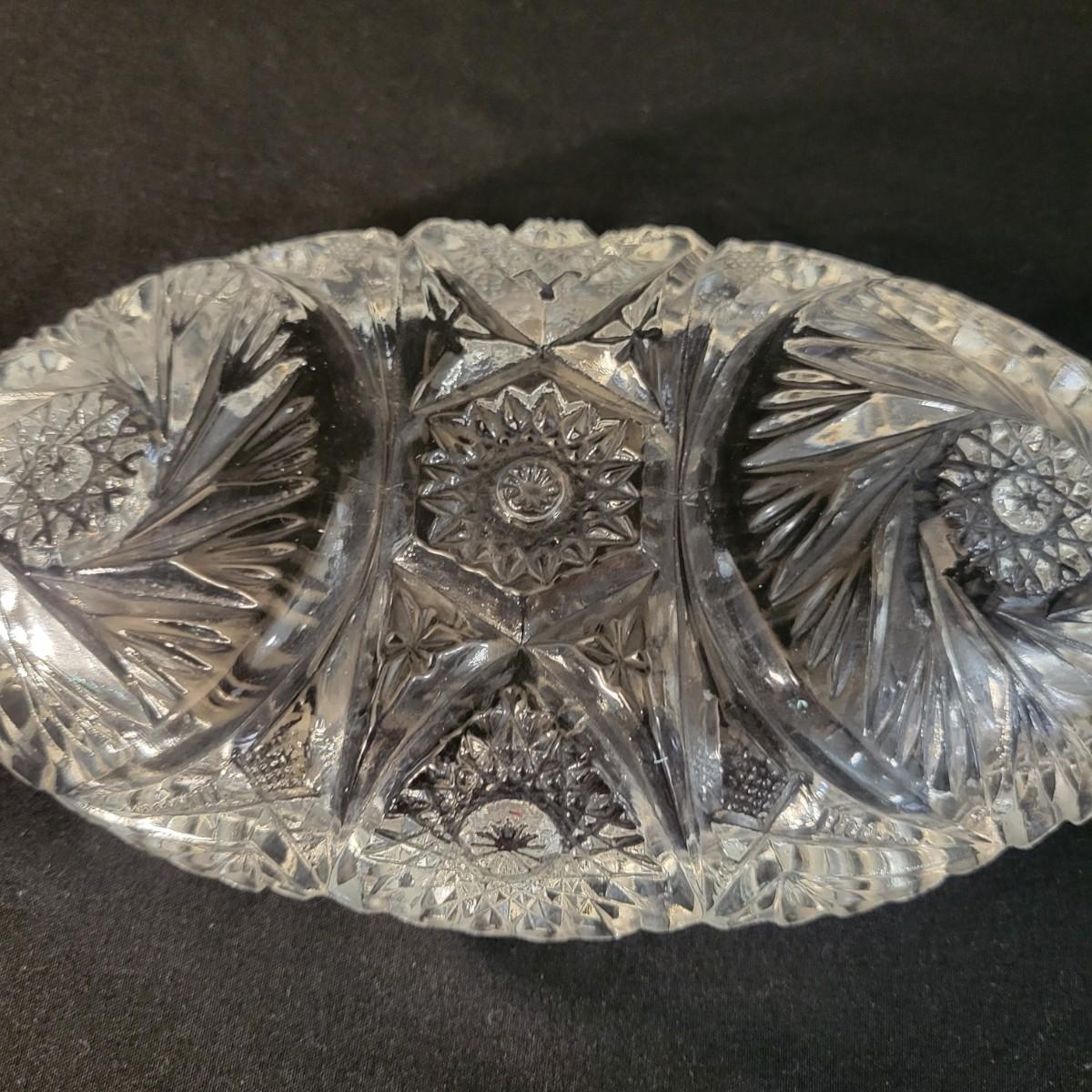 An assortment of five crystal and molded glass pieces in excellent condition. It appears that four pieces are molded glass and the pitcher on the left is leaded crystal. The candy dish measures approximately 8" x 4.5" x 1" Shipping available