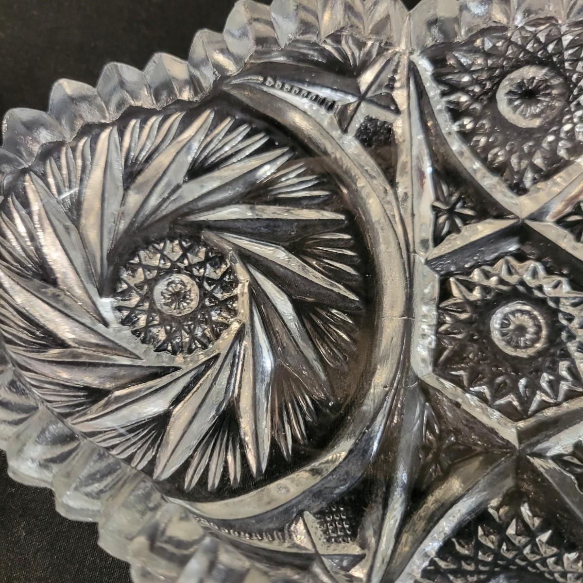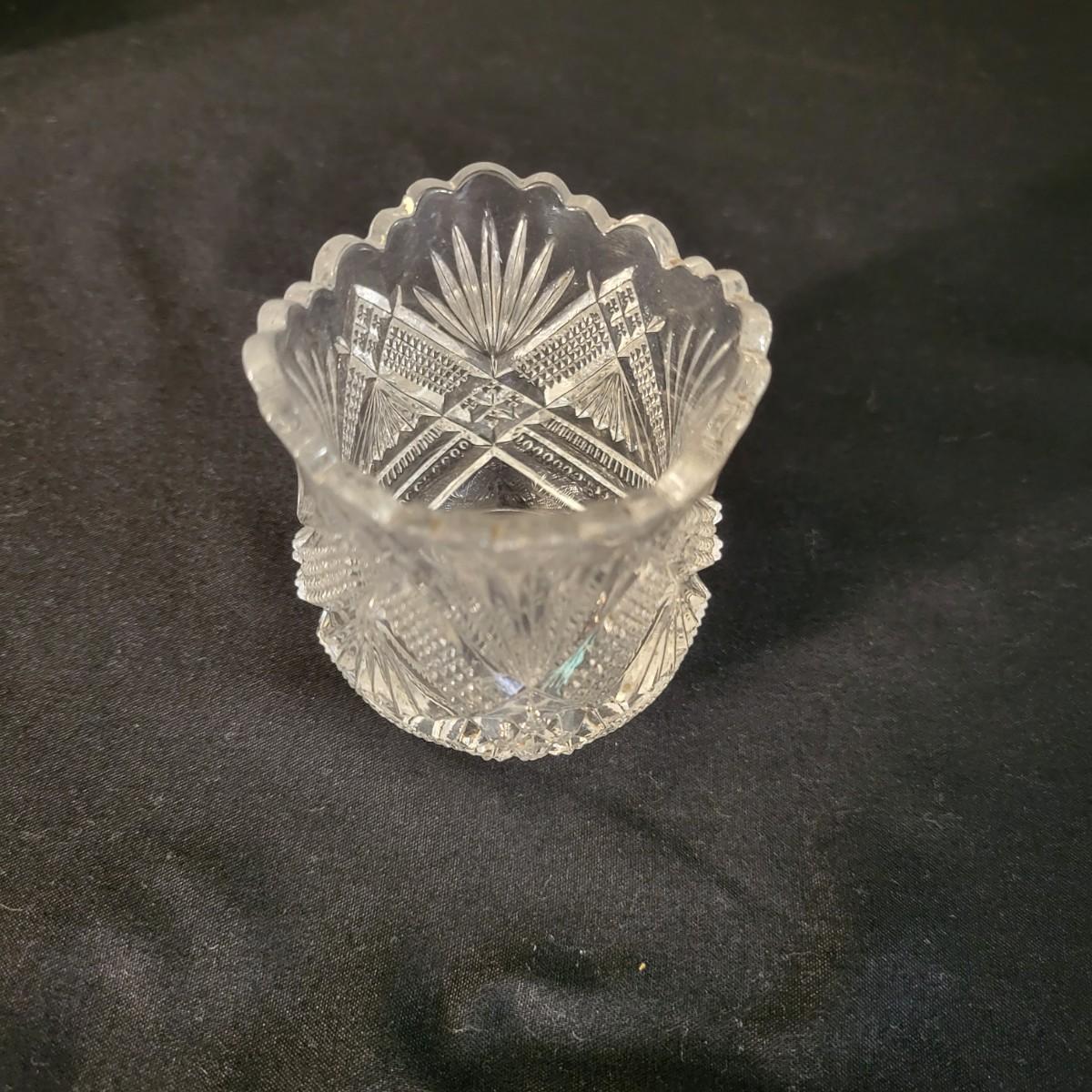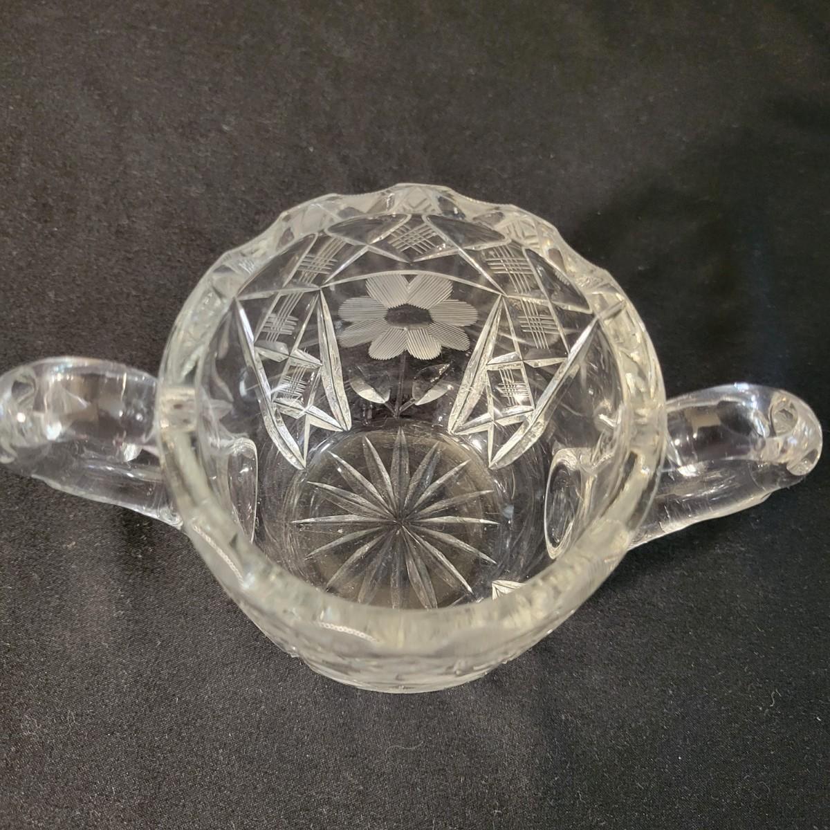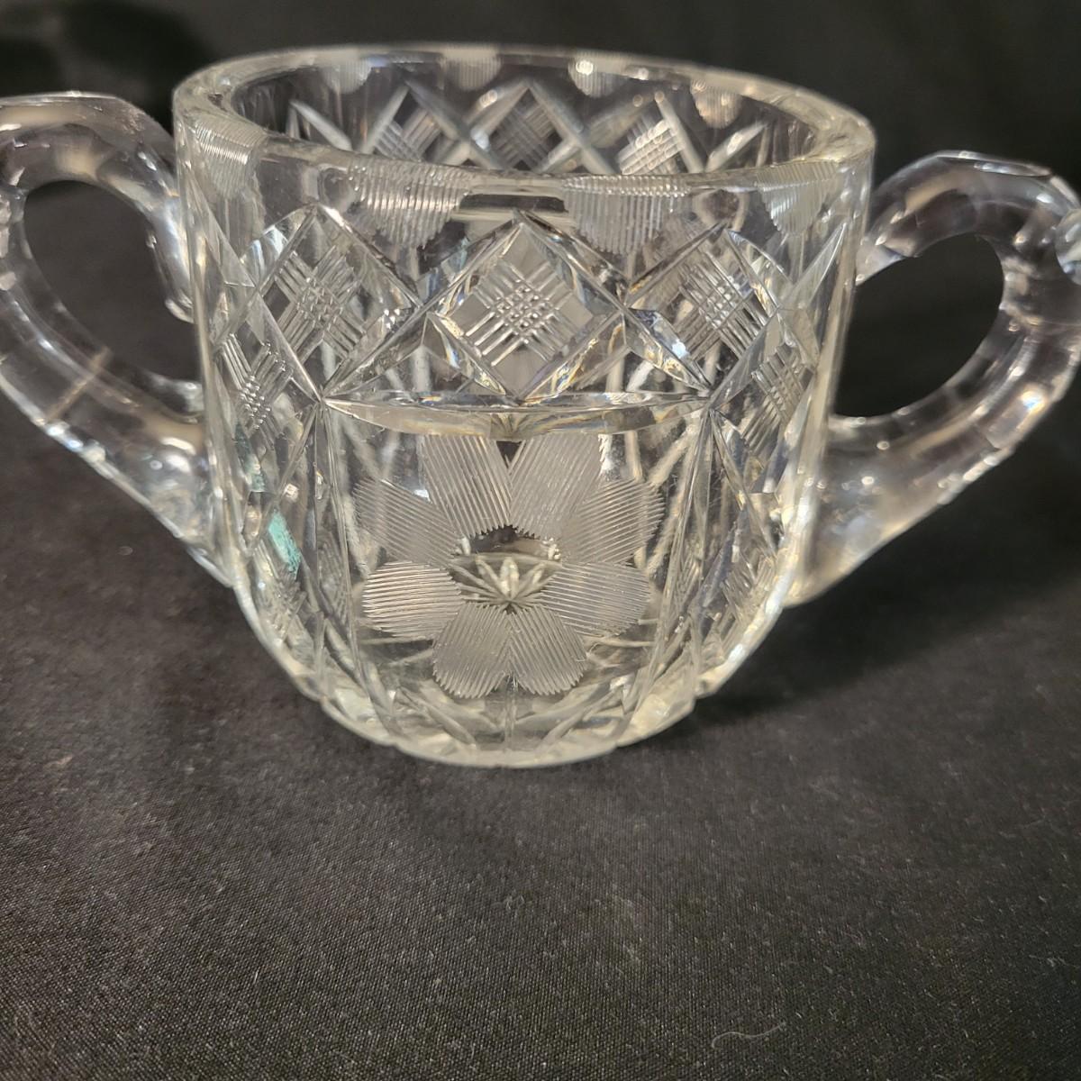 An assortment of five crystal and molded glass pieces in excellent condition. It appears that four pieces are molded glass and the pitcher on the left is leaded crystal. The candy dish measures approximately 8" x 4.5" x 1" Shipping available