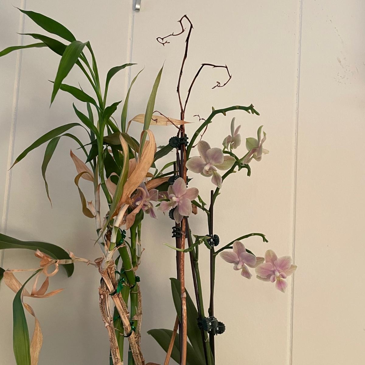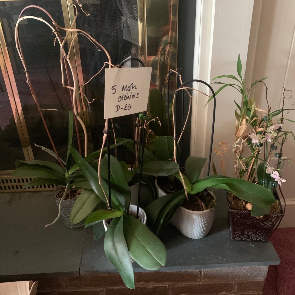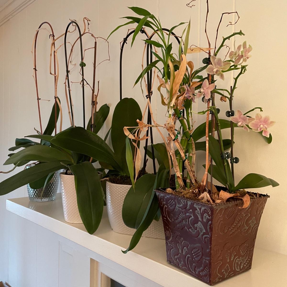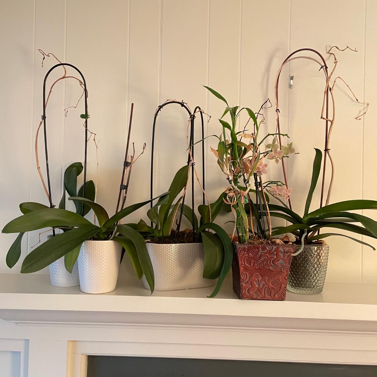 Five Phalaenopsis aka Moth orchids here that are in very good health, one of which is flowering profusely with pale pink flowers. All five come with quality plant pots that includes glass, metal and ceramic and all have been trained on curved stakes.