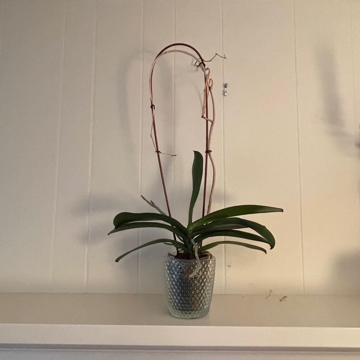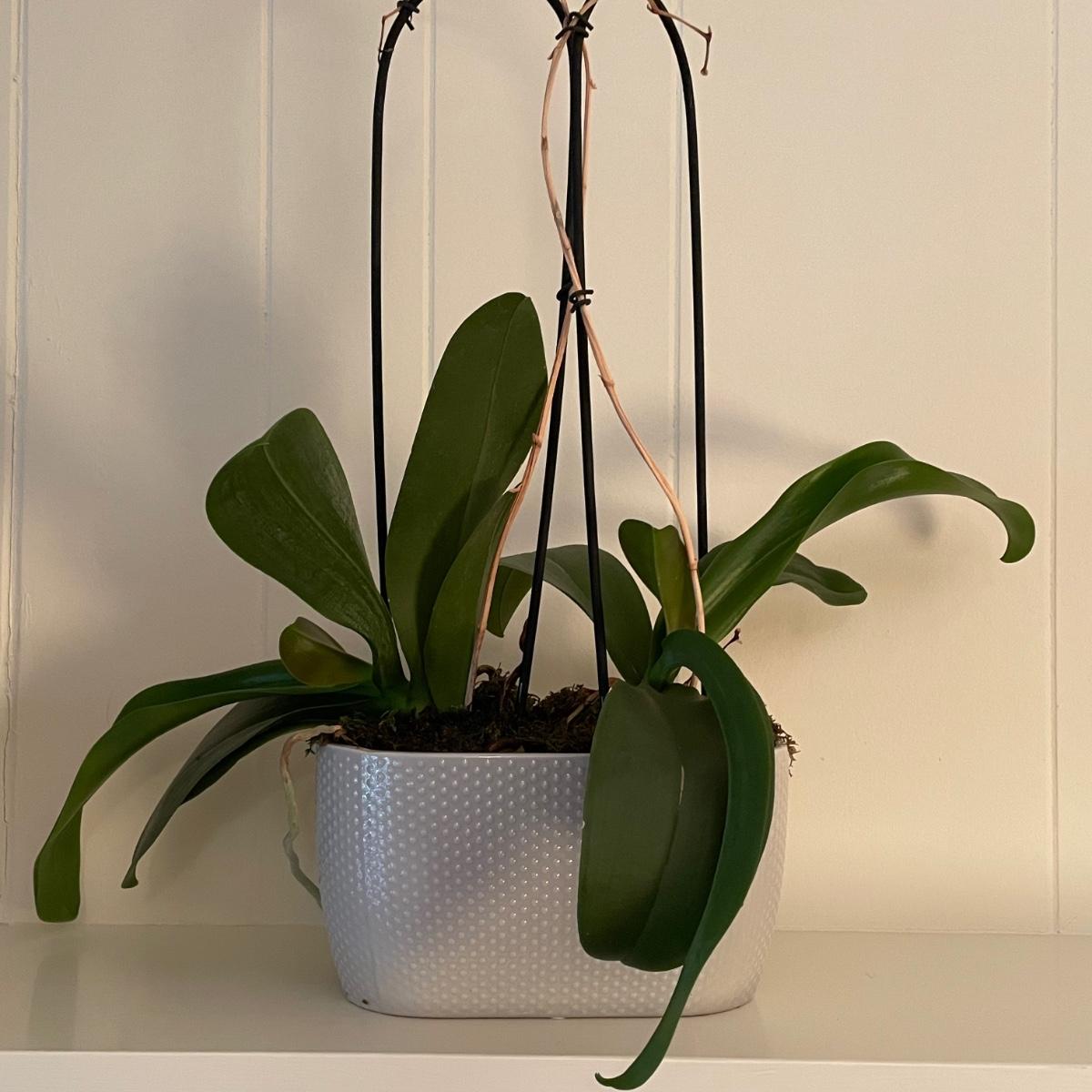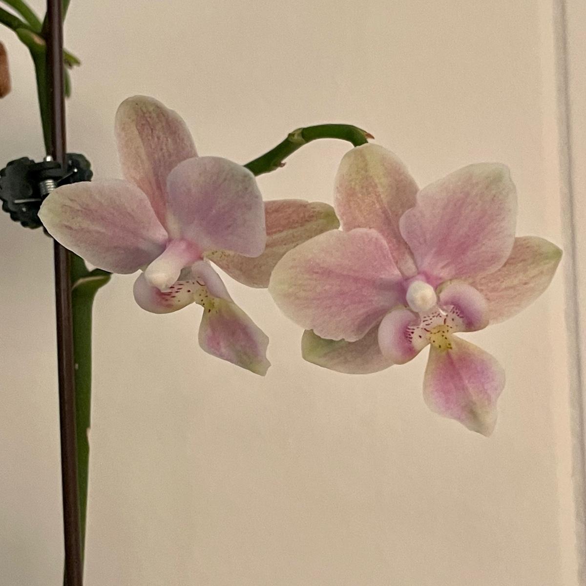Five Phalaenopsis aka Moth orchids here that are in very good health, one of which is flowering profusely with pale pink flowers. All five come with quality plant pots that includes glass, metal and ceramic and all have been trained on curved stakes.
