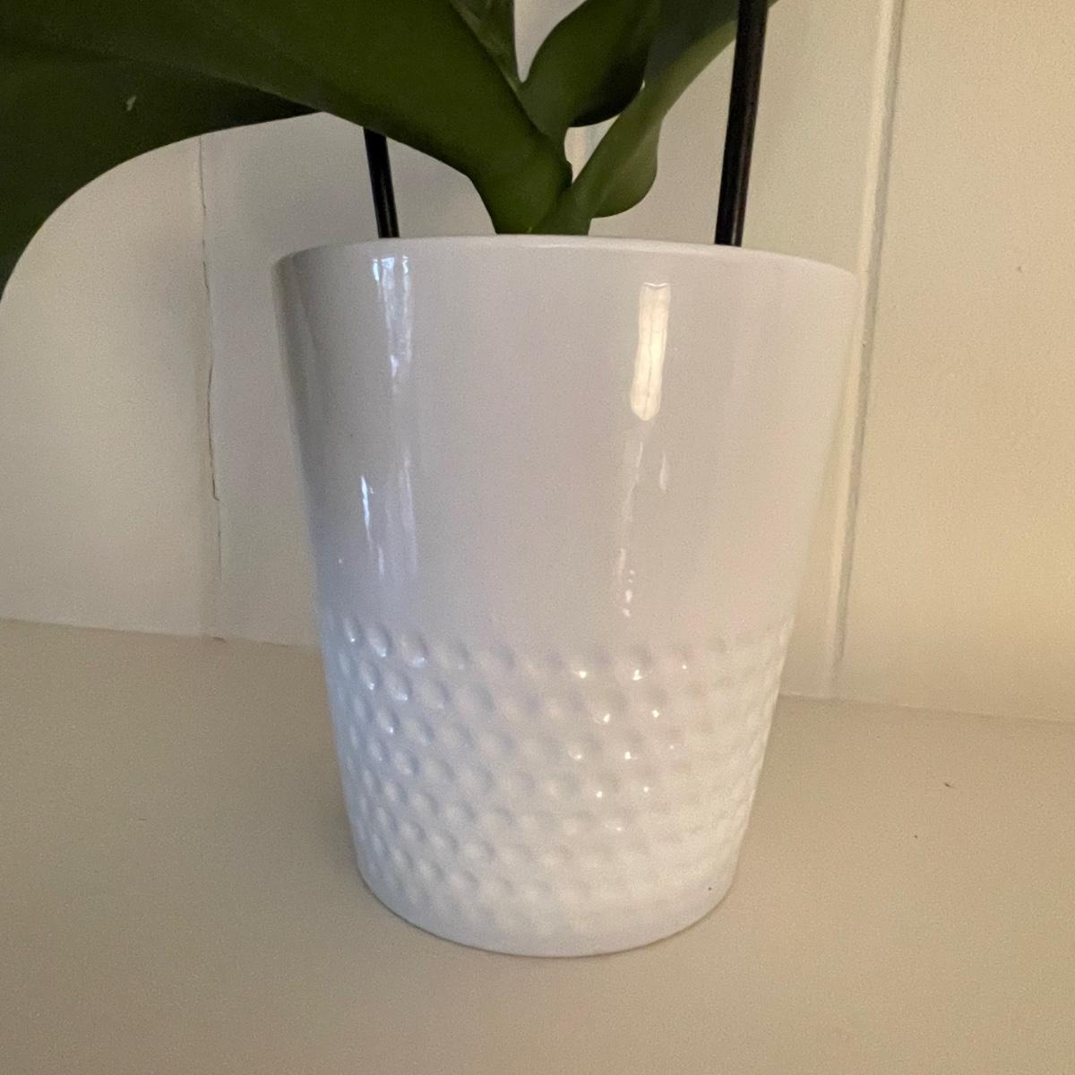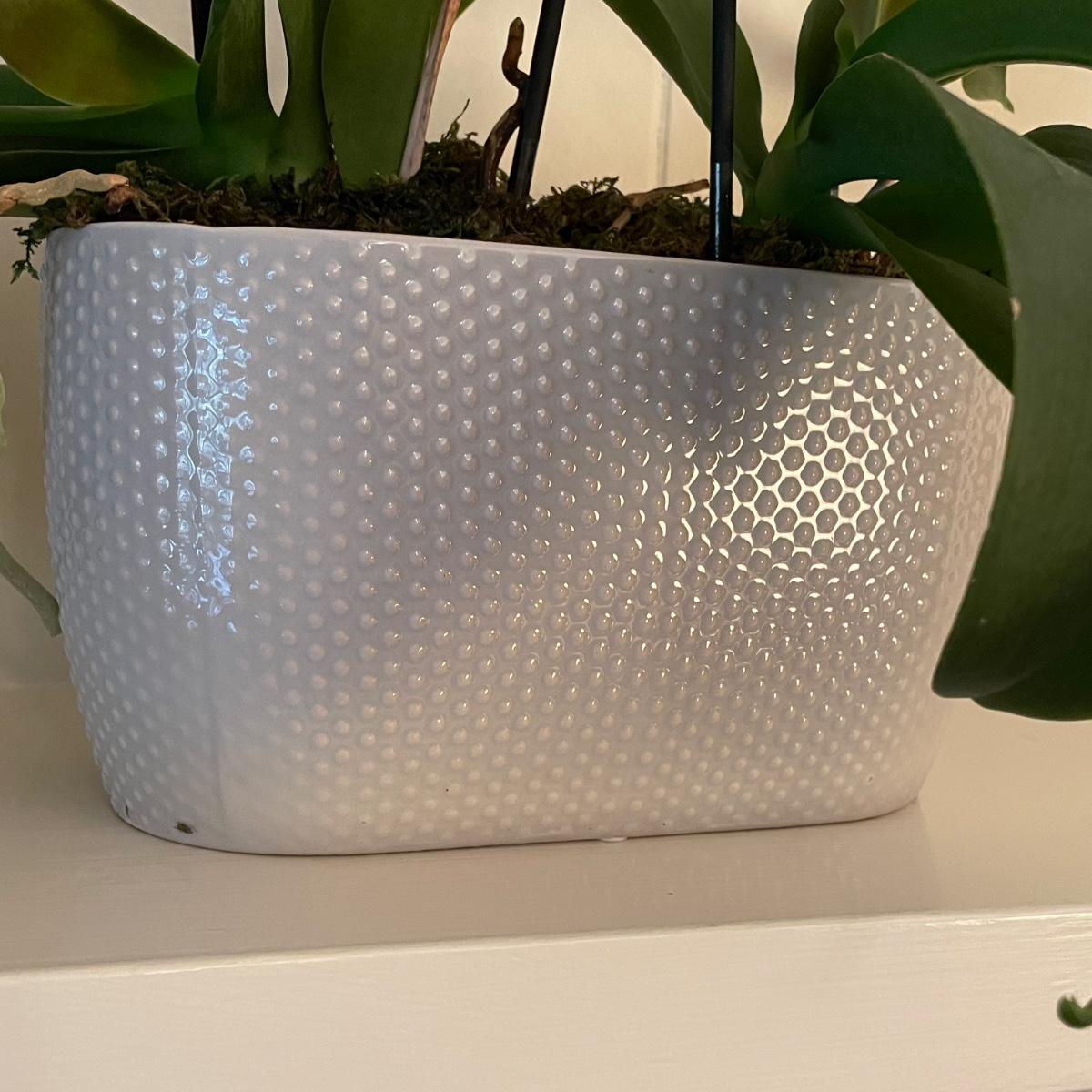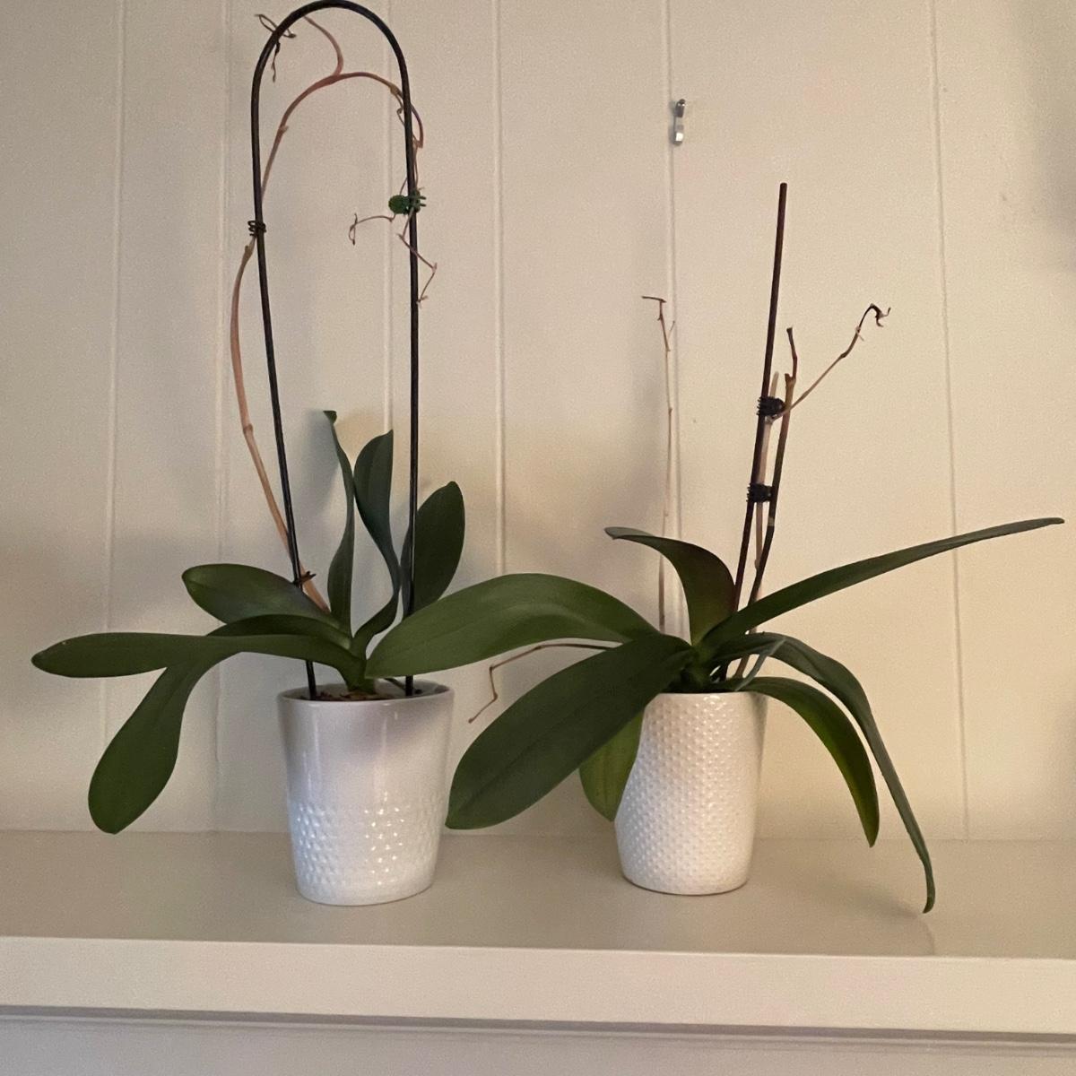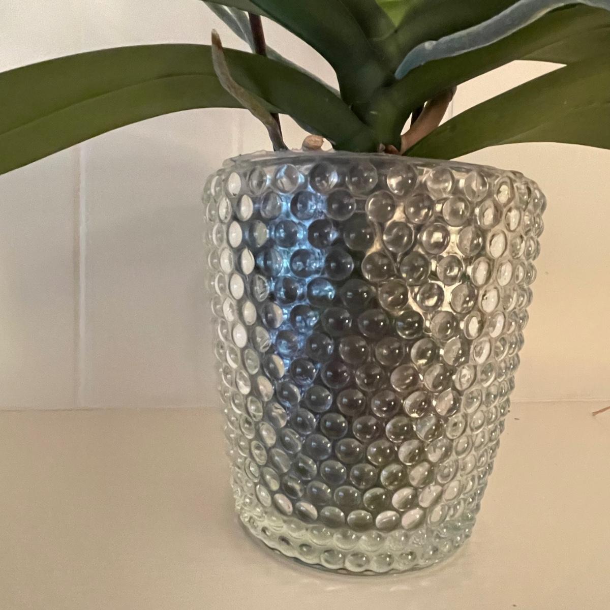 Five Phalaenopsis aka Moth orchids here that are in very good health, one of which is flowering profusely with pale pink flowers. All five come with quality plant pots that includes glass, metal and ceramic and all have been trained on curved stakes.