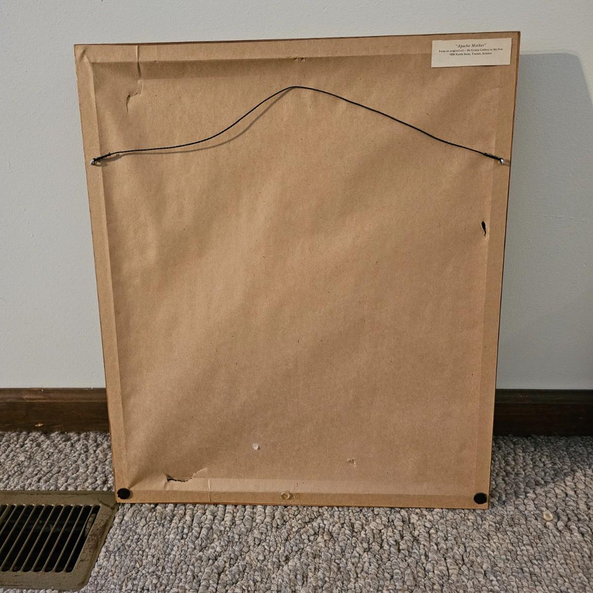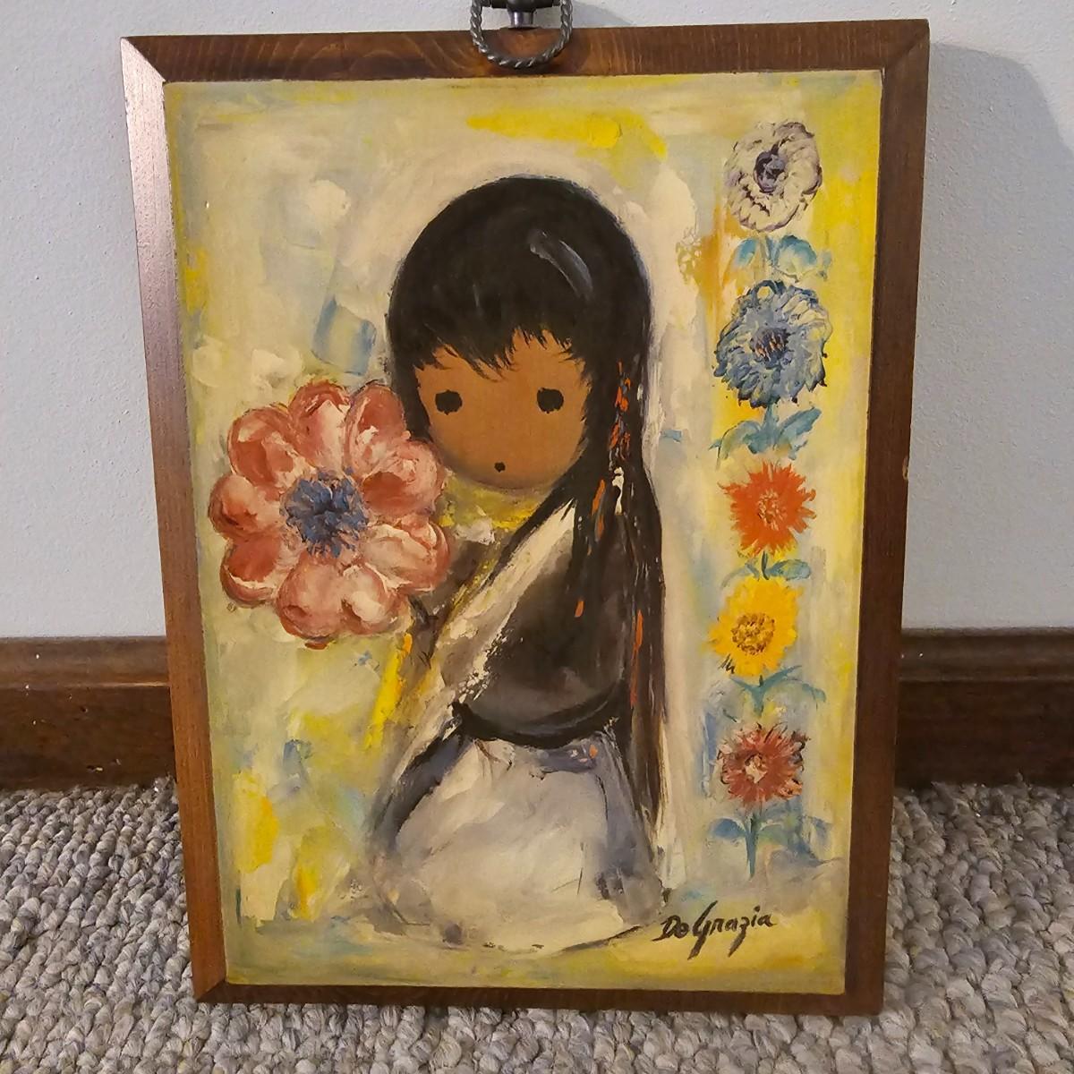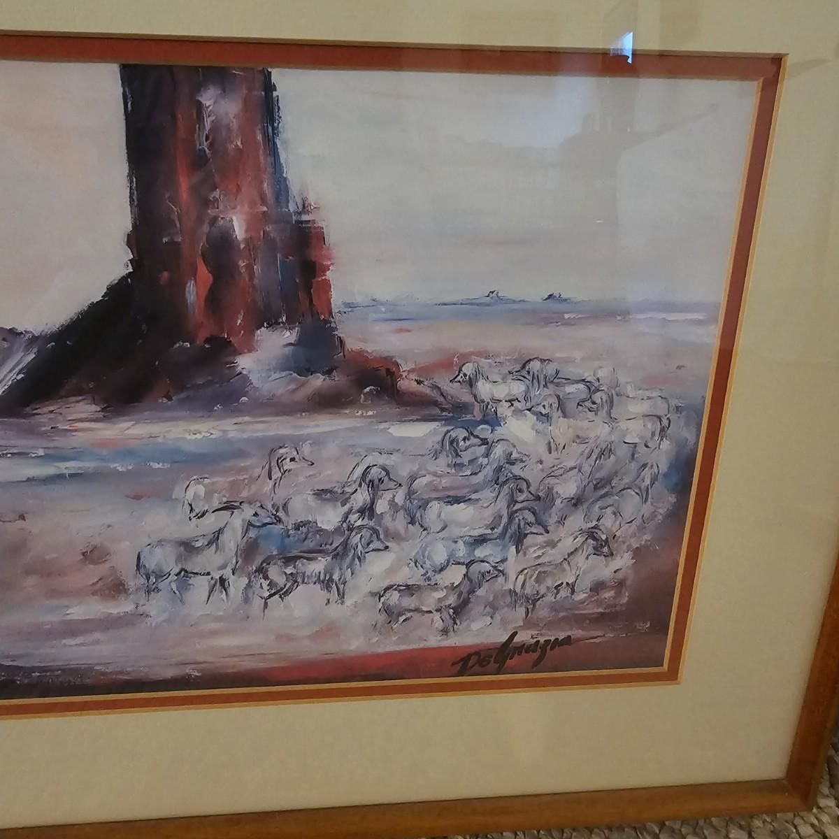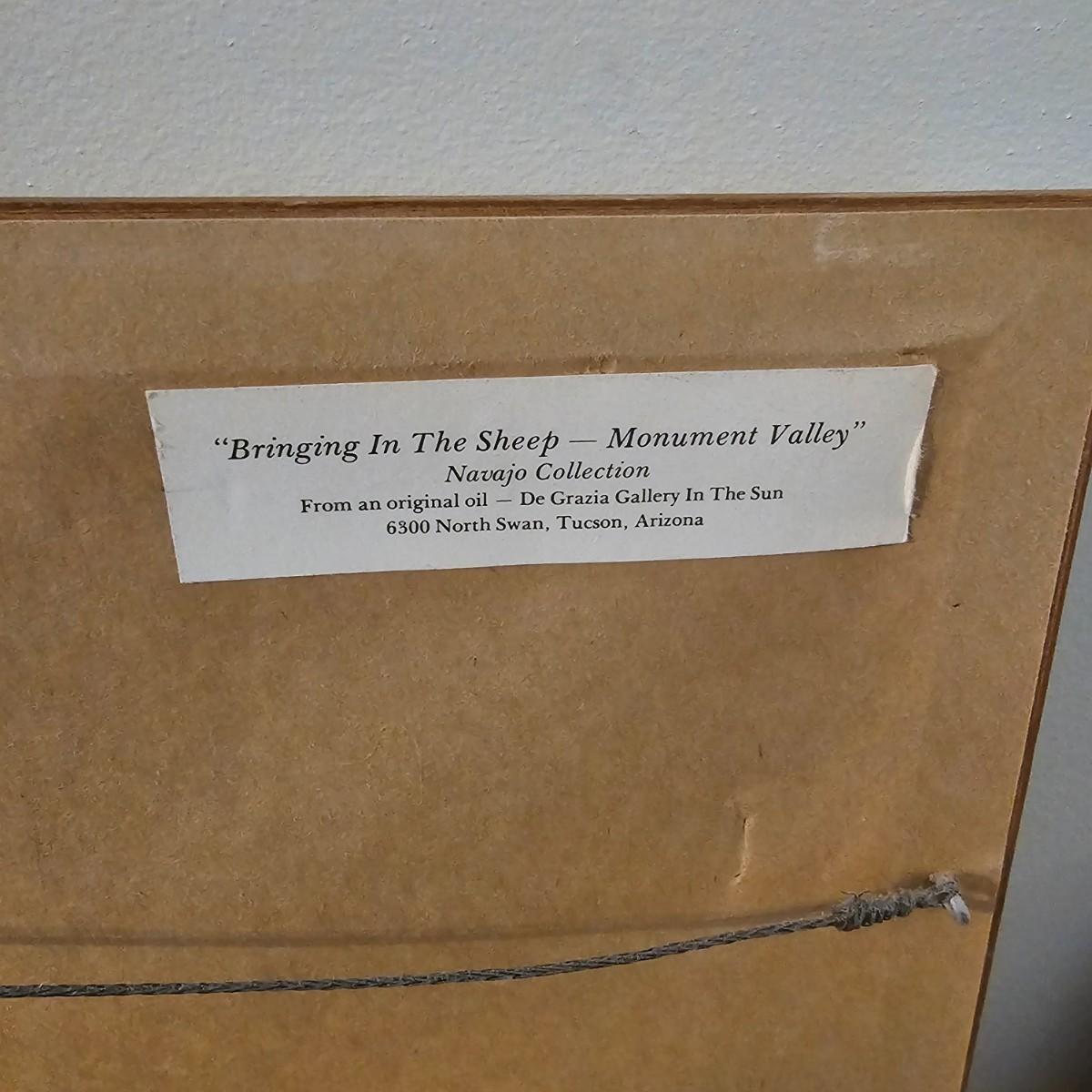 Two traditional framed images and three what appear to be decoupage over prints on solid wood background. Image of 'Apache Mother' is signed and is personalized and hand signed by artist in lower left corner. Measures 18.5" x 21.5". 'Bringing in the Sheep' is similar, signed print with hand signed personalization measuring 27.5" x 18.5". Three delightful flower children are 9" x 12" to 10" x 13". Prints appear to be signed. See photos for details. Shipping available. Shipping can be costly. We suggest contacting our preferred local shipping provider, Postage Express, with dimensions and getting an estimate before bidding: (828) 255-9250 or shipping@postageexpressnc.com.
